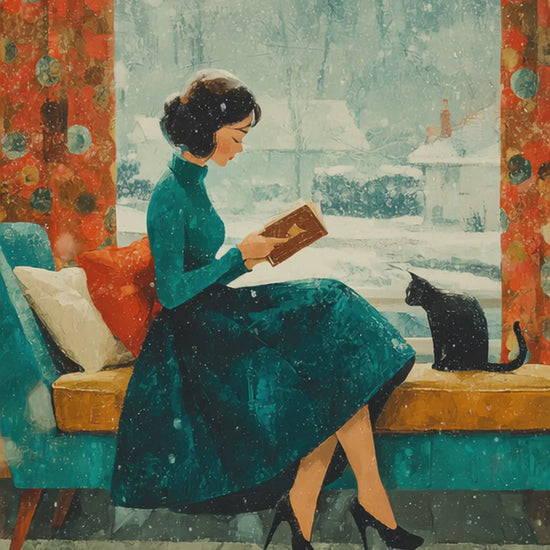 Mid-Century Winter Reading Nook Jigsaw Puzzle – Vintage 1950s Woman, Cat, and Snowy Window