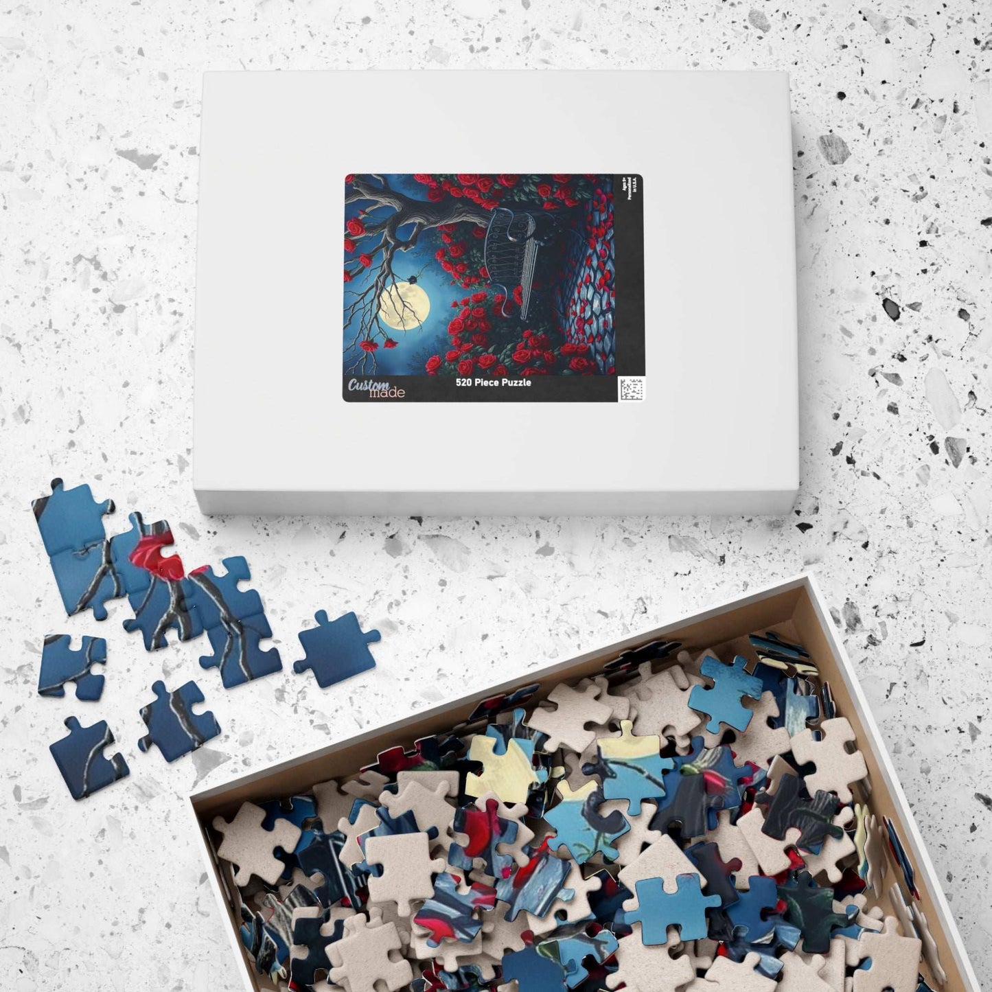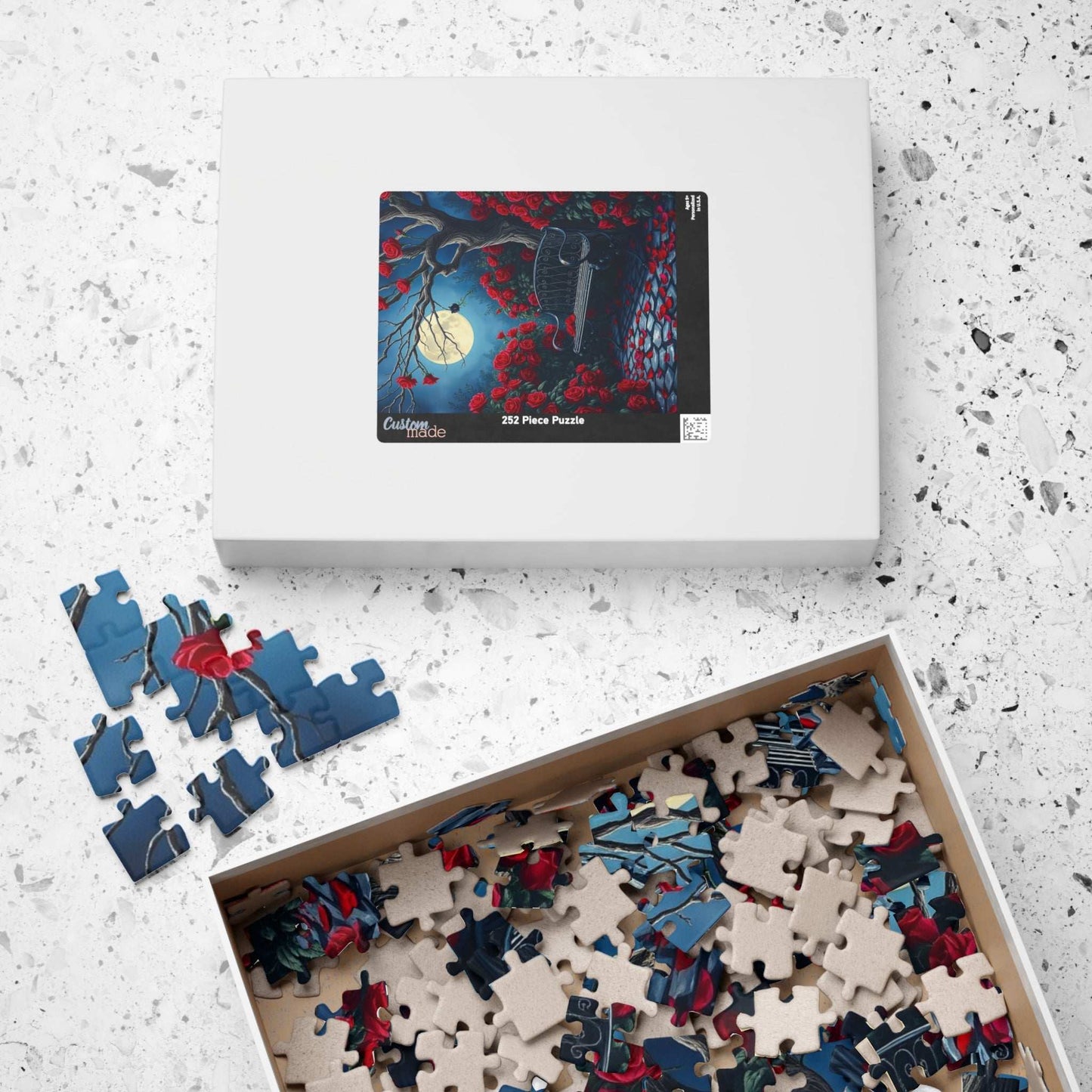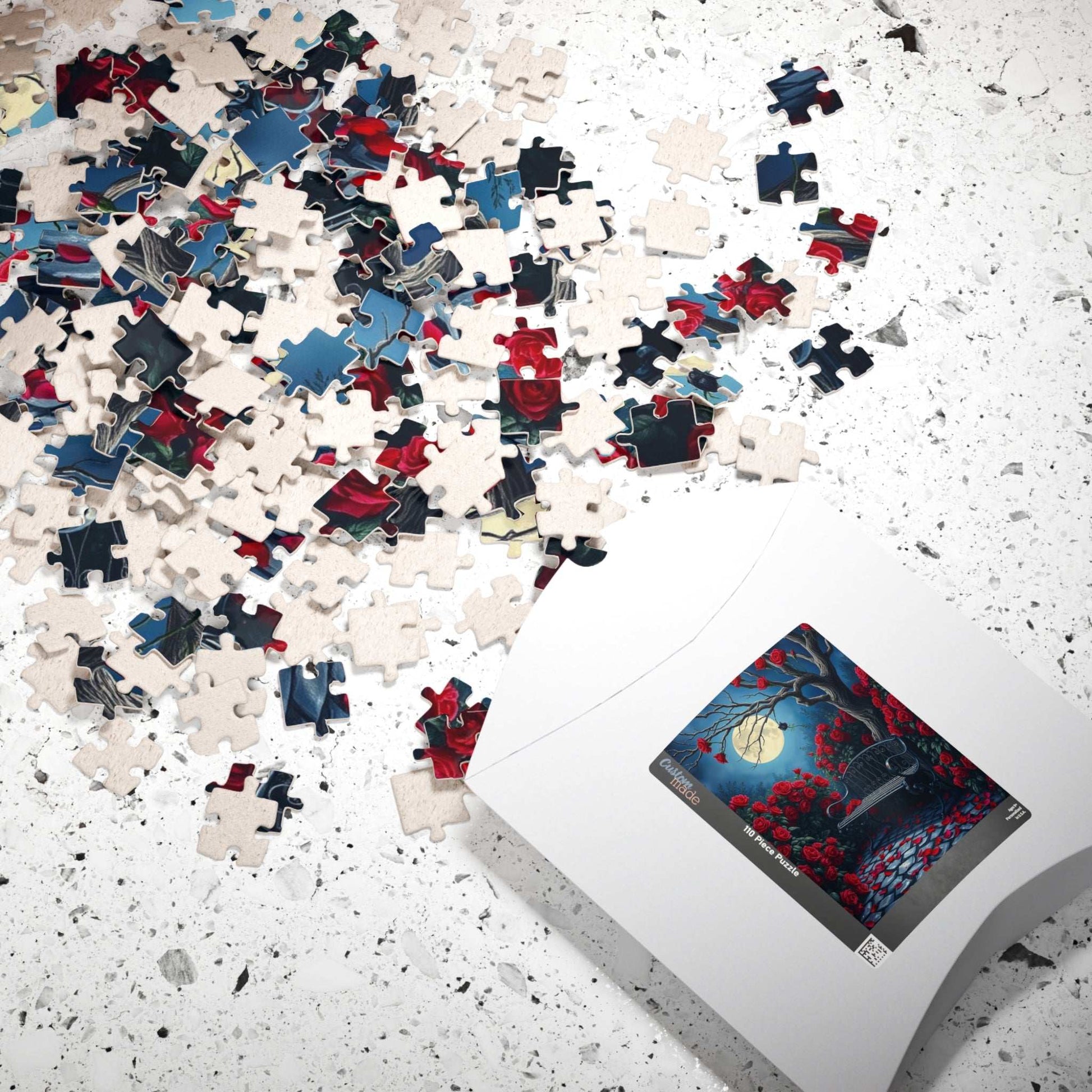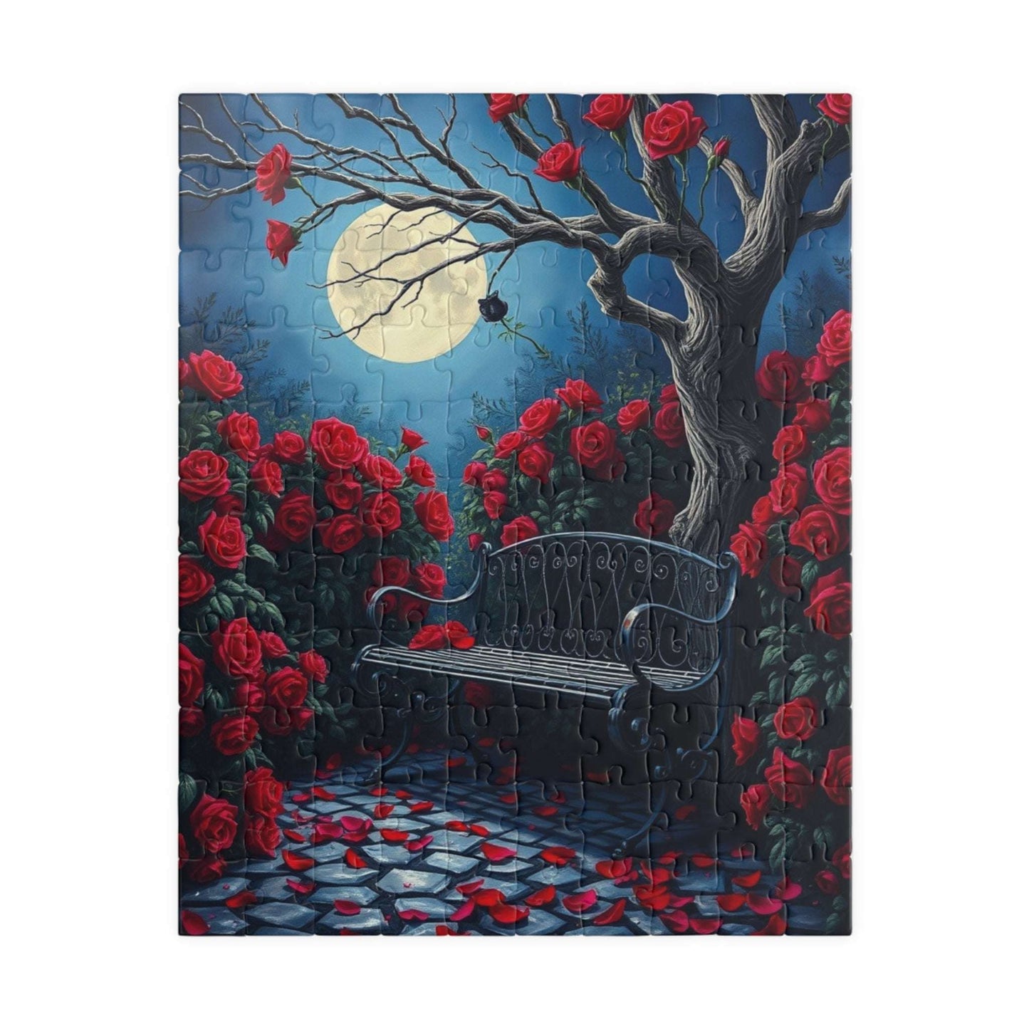Step into a mystical moonlit garden, where deep red roses bloom wildly, their petals gently scattered across ancient cobblestones. A wrought iron bench, weathered by time, rests beneath the twisted branches of a leafless tree, casting eerie shadows under the soft lunar glow. At the heart of this enchanting scene, a single black rose emits an otherworldly light, its delicate glow adding a sense of mystery and wonder. With its dreamlike atmosphere, vivid colors, and gentle contrasts, this puzzle invites you to lose yourself in a world of quiet beauty and intrigue. A perfect challenge for those who love gothic elegance, fantasy landscapes, and hauntingly beautiful imagery.