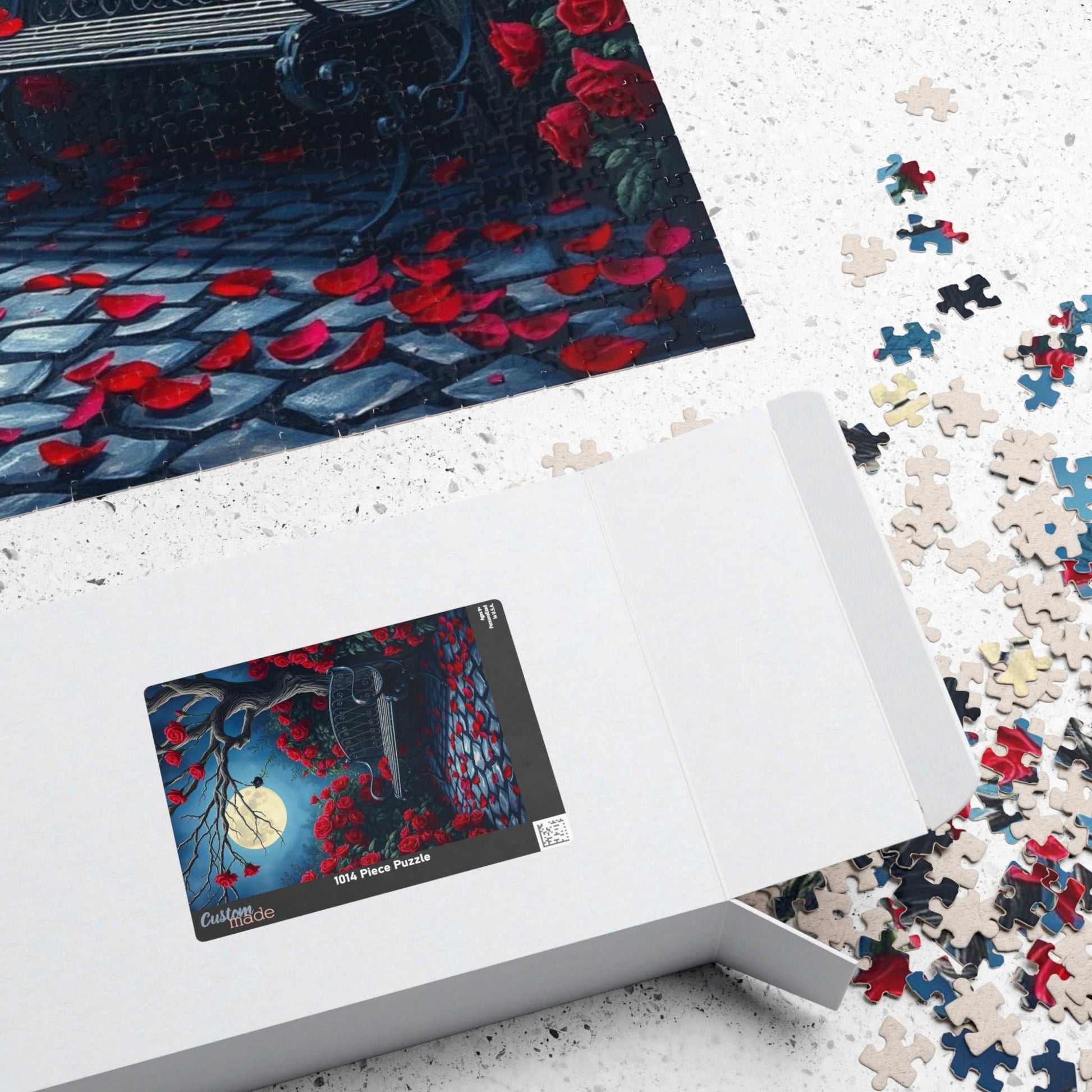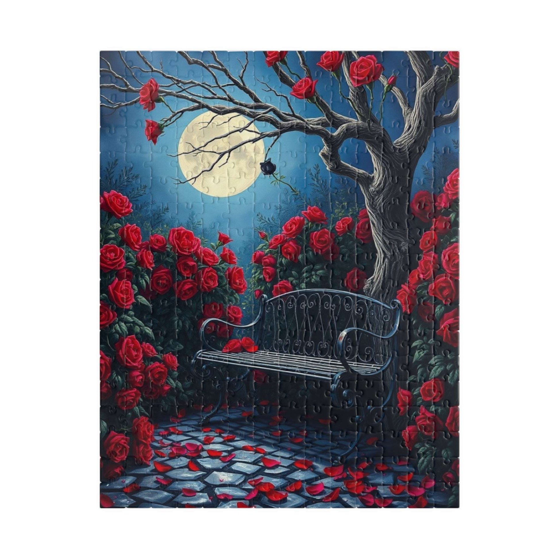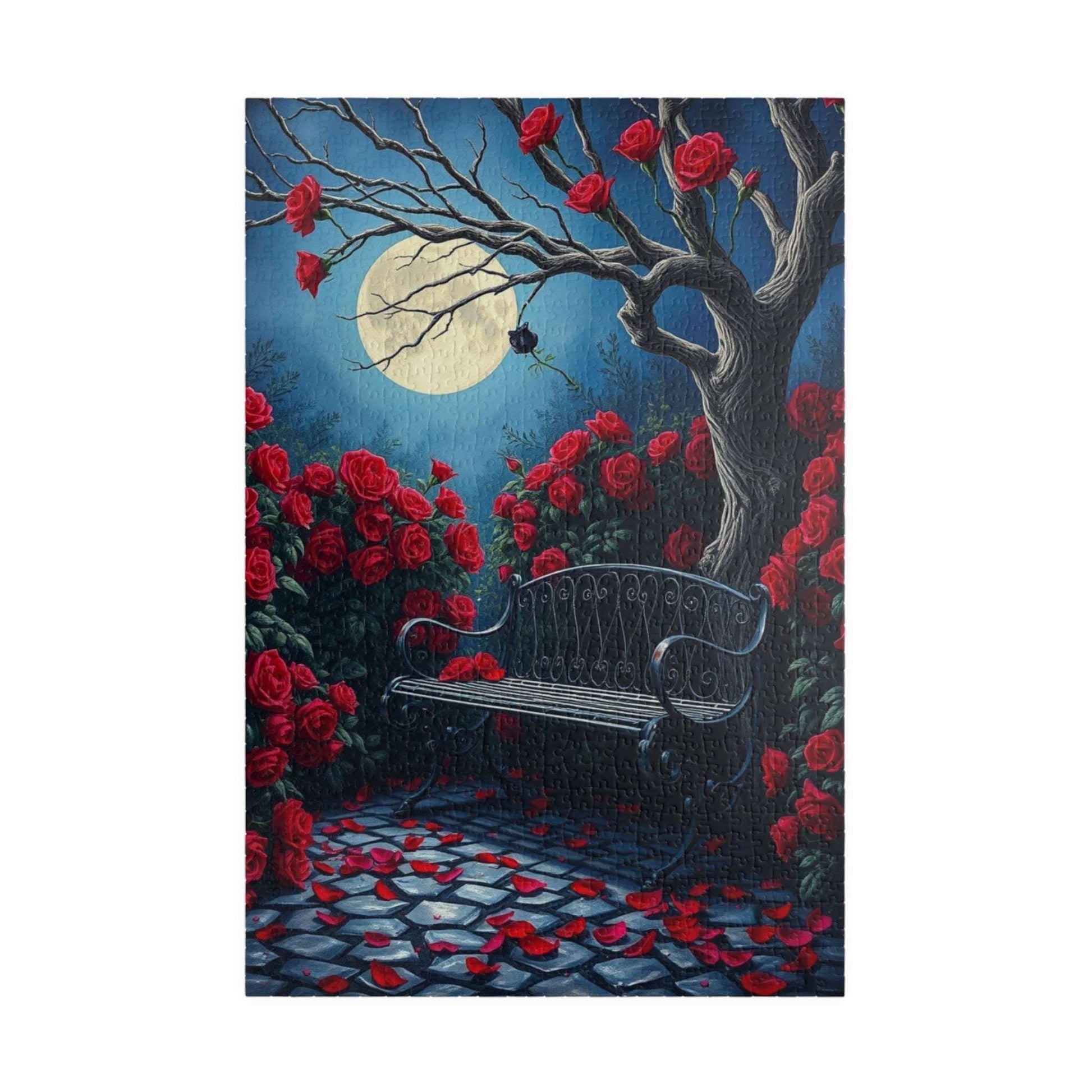 Moonlit Gothic Garden Puzzle, Dark Romantic Fantasy Jigsaw Game, Cobblestone Path Iron Bench and Roses, Relaxing Challenge for Puzzle Lover