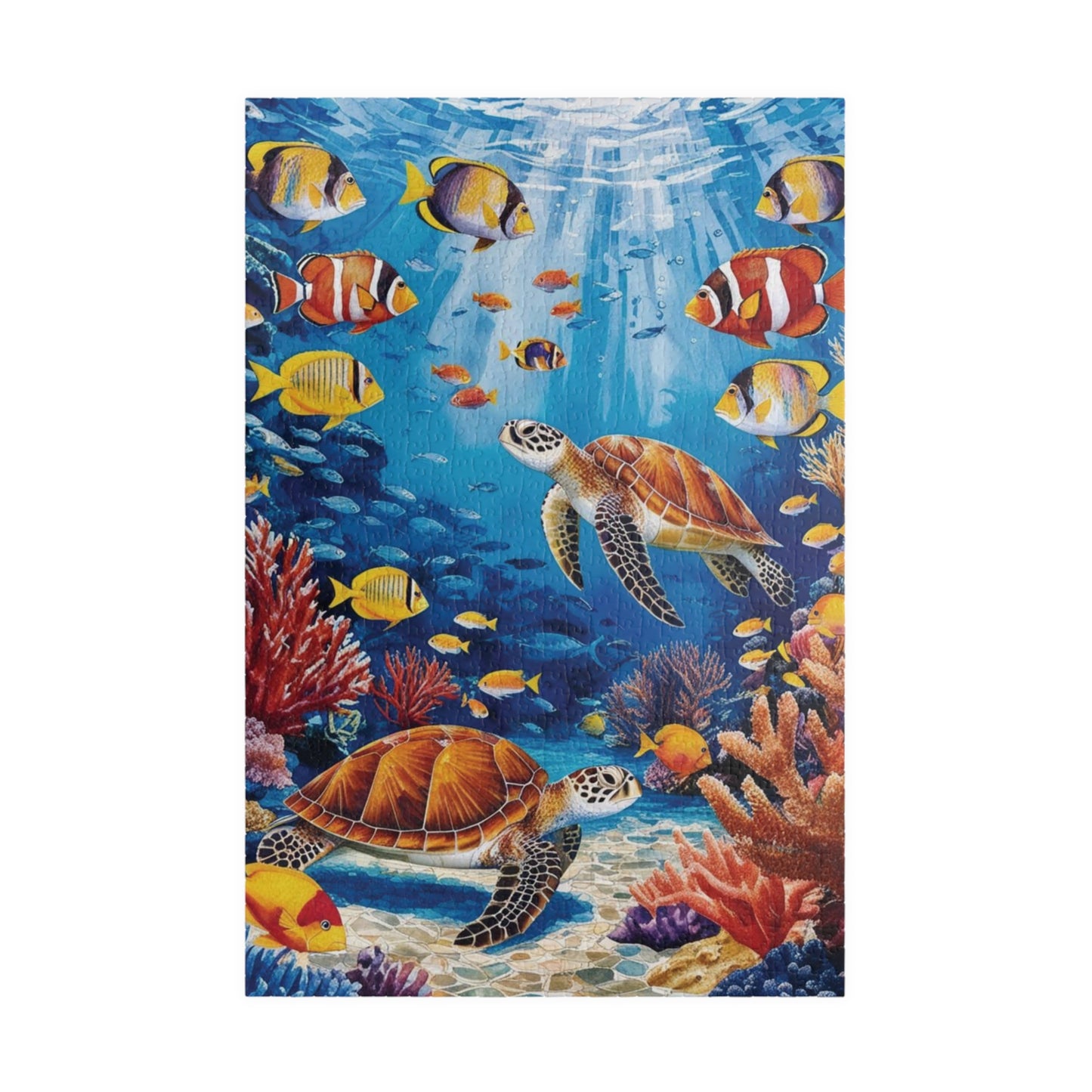 A vibrant and colorful mosaic jigsaw puzzle depicting an underwater scene with tropical fish, coral reefs, a sea turtle, and sunlit surface. Perfect for ocean and puzzle enthusiasts, this puzzle brings a relaxing and immersive vibe to your space. Ideal for leisurely evenings or weekends, as well as gifting to friends and family for birthdays, holidays, or special occasions.