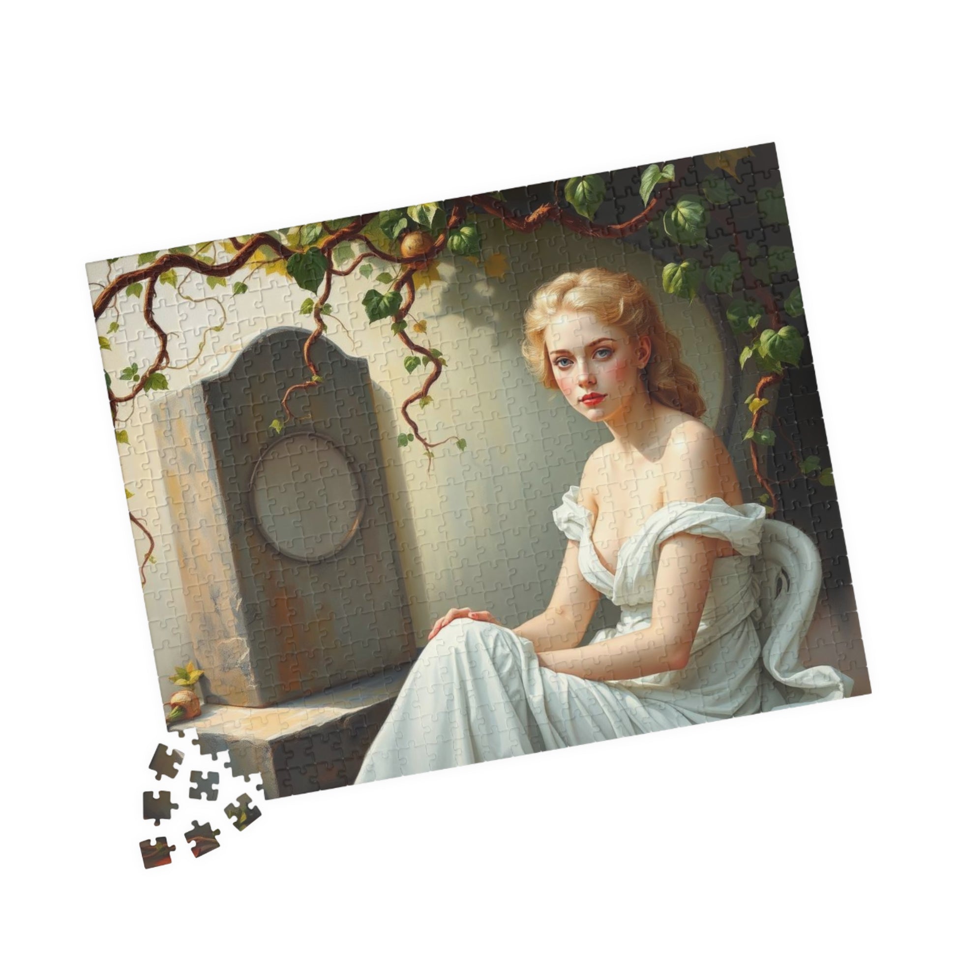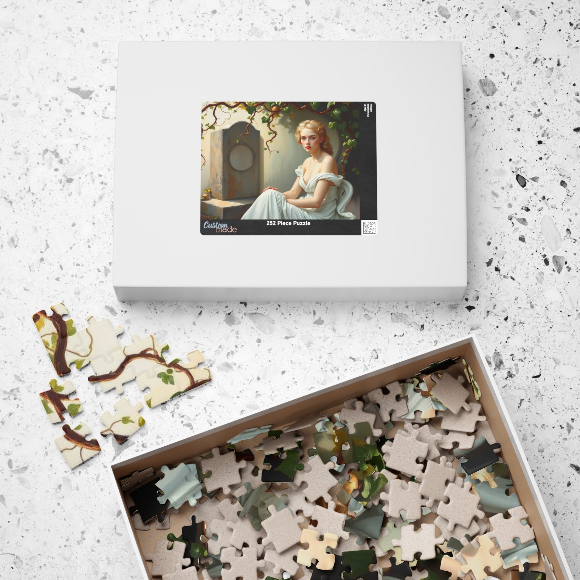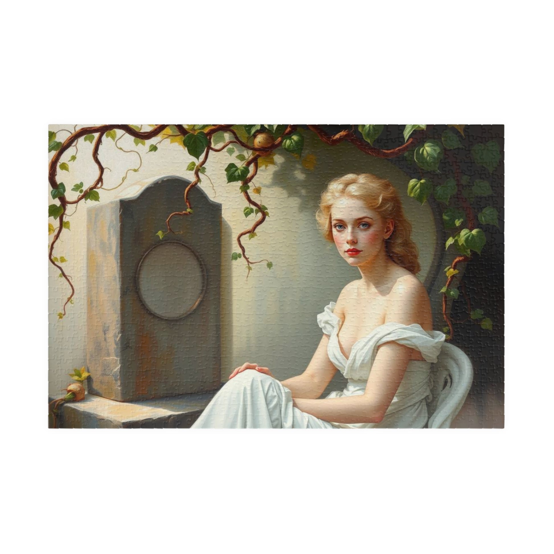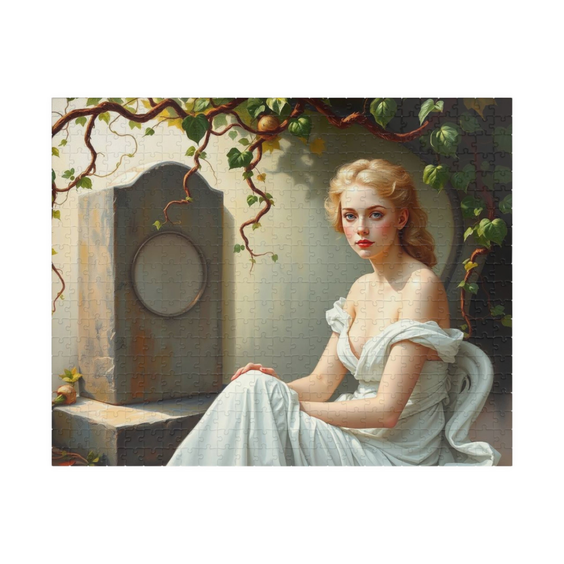 Immerse yourself in the gothic atmosphere with this puzzle featuring a woman seated beside a tomb under twisted vines. Perfect for those who appreciate dark and mysterious art. Ideal for Halloween, spooky-themed events, and puzzle enthusiasts.