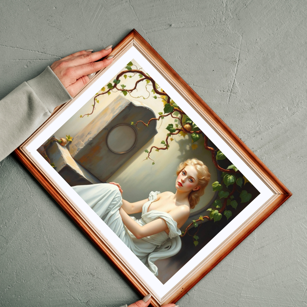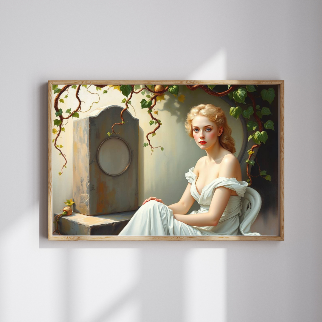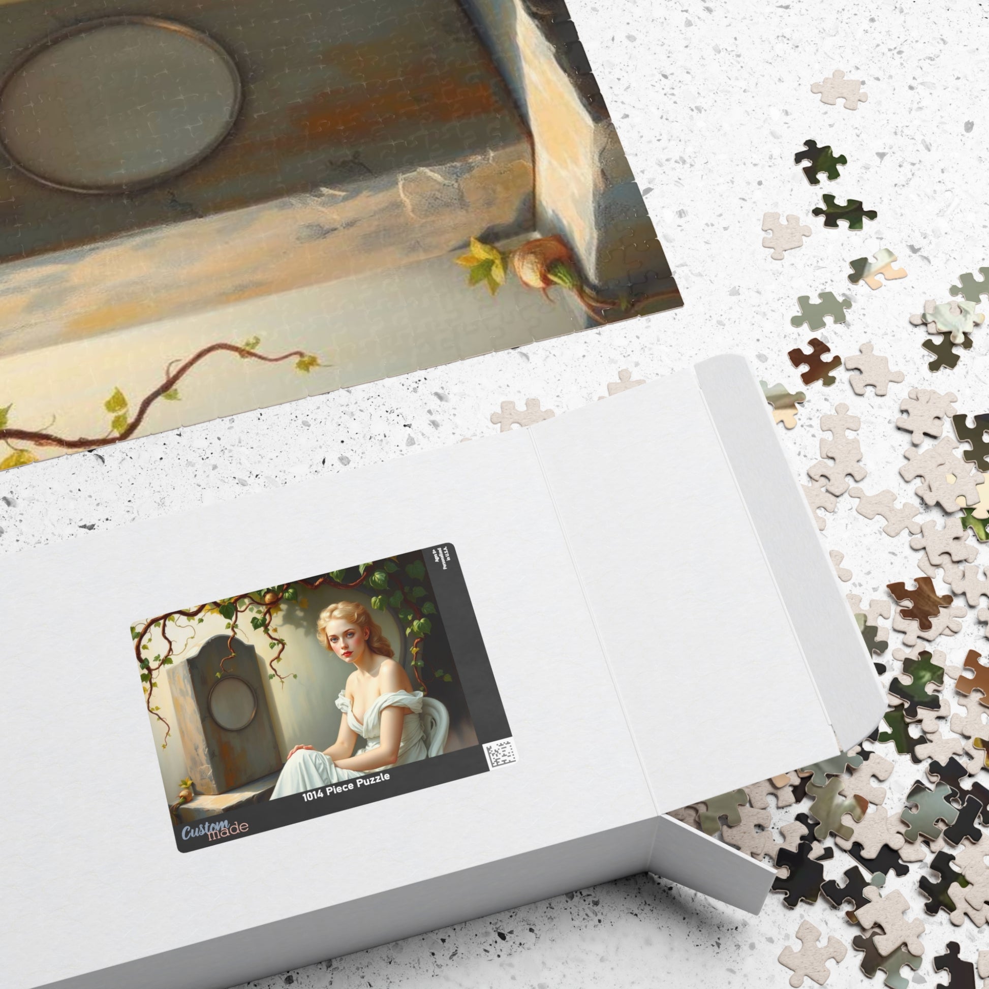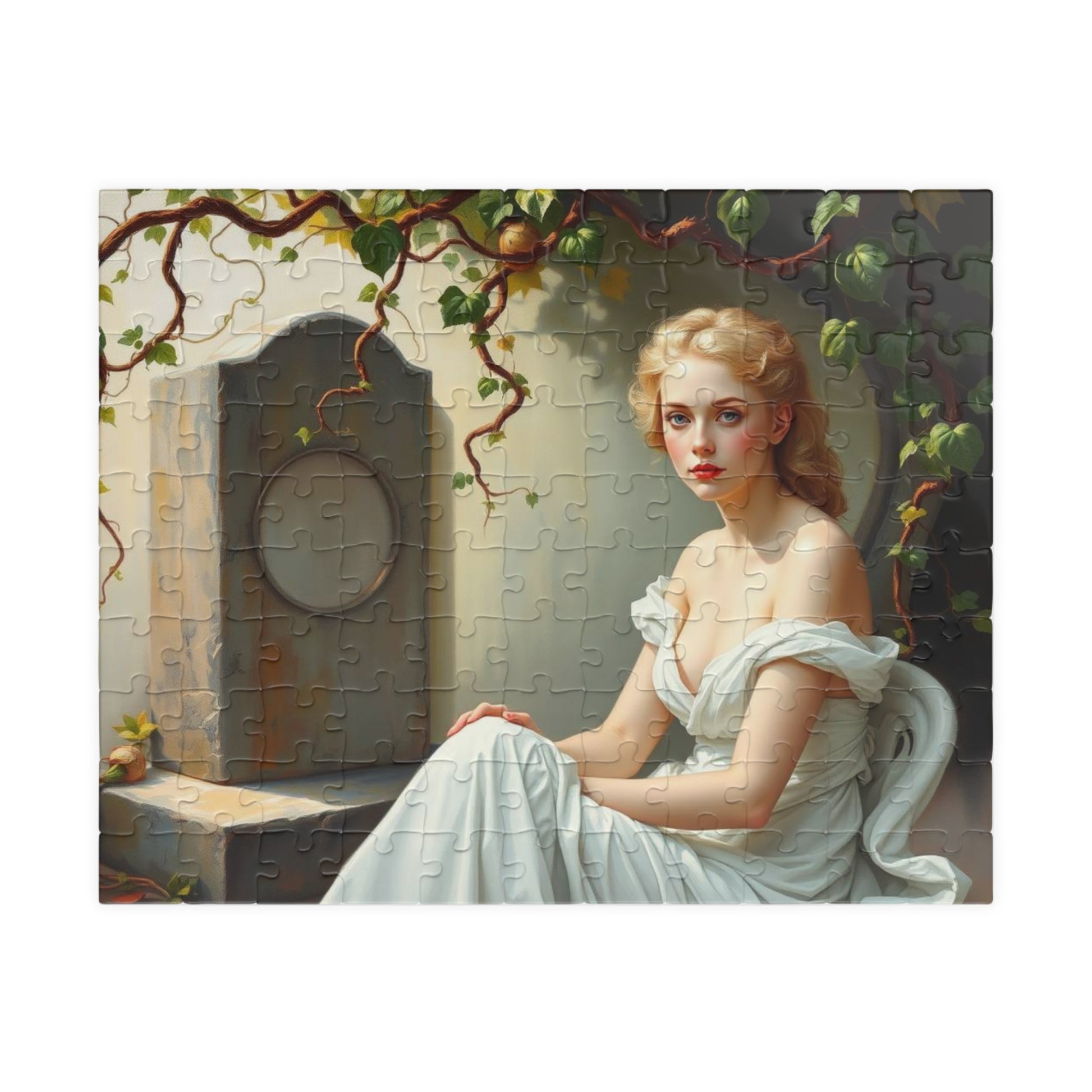Immerse yourself in the gothic atmosphere with this puzzle featuring a woman seated beside a tomb under twisted vines. Perfect for those who appreciate dark and mysterious art. Ideal for Halloween, spooky-themed events, and puzzle enthusiasts.
