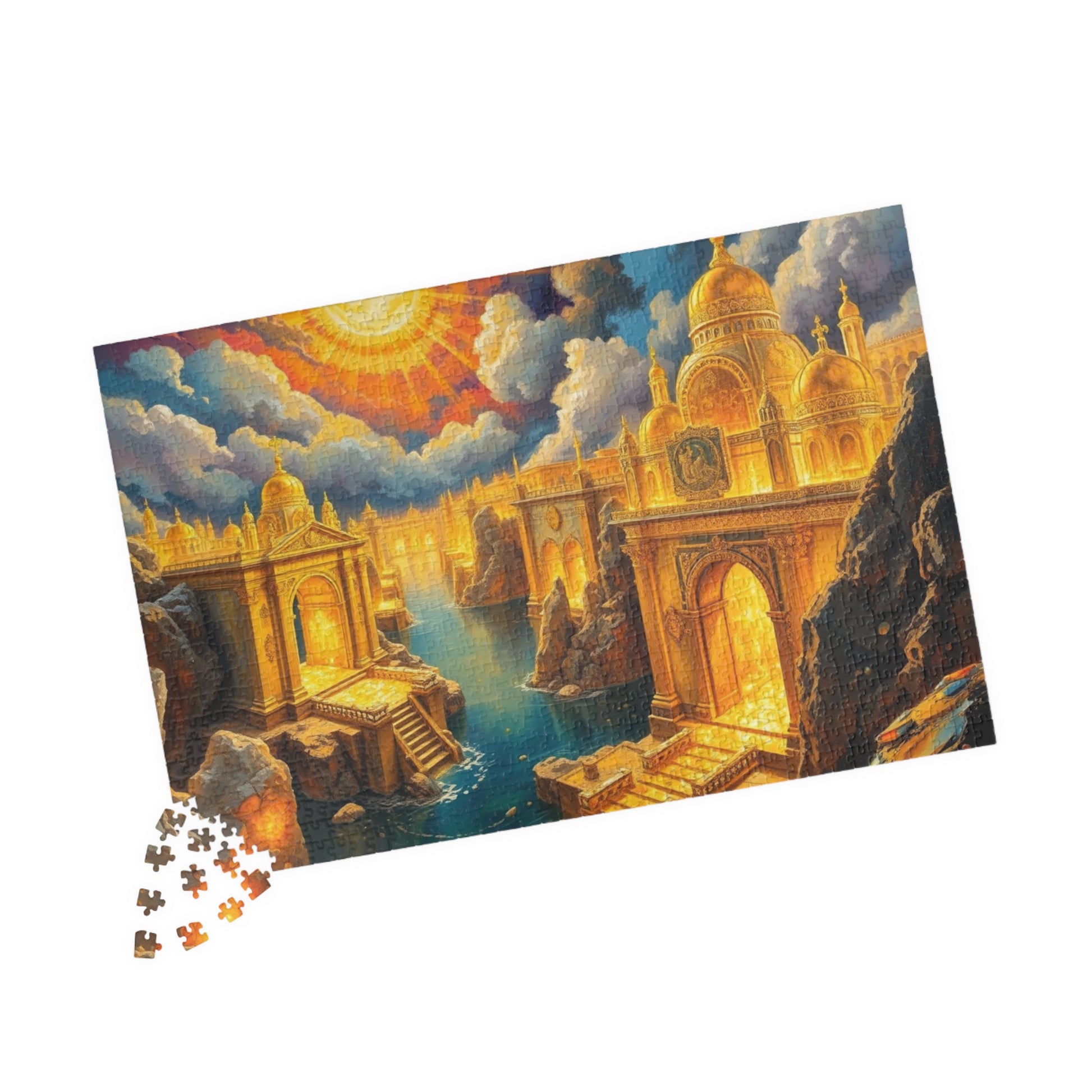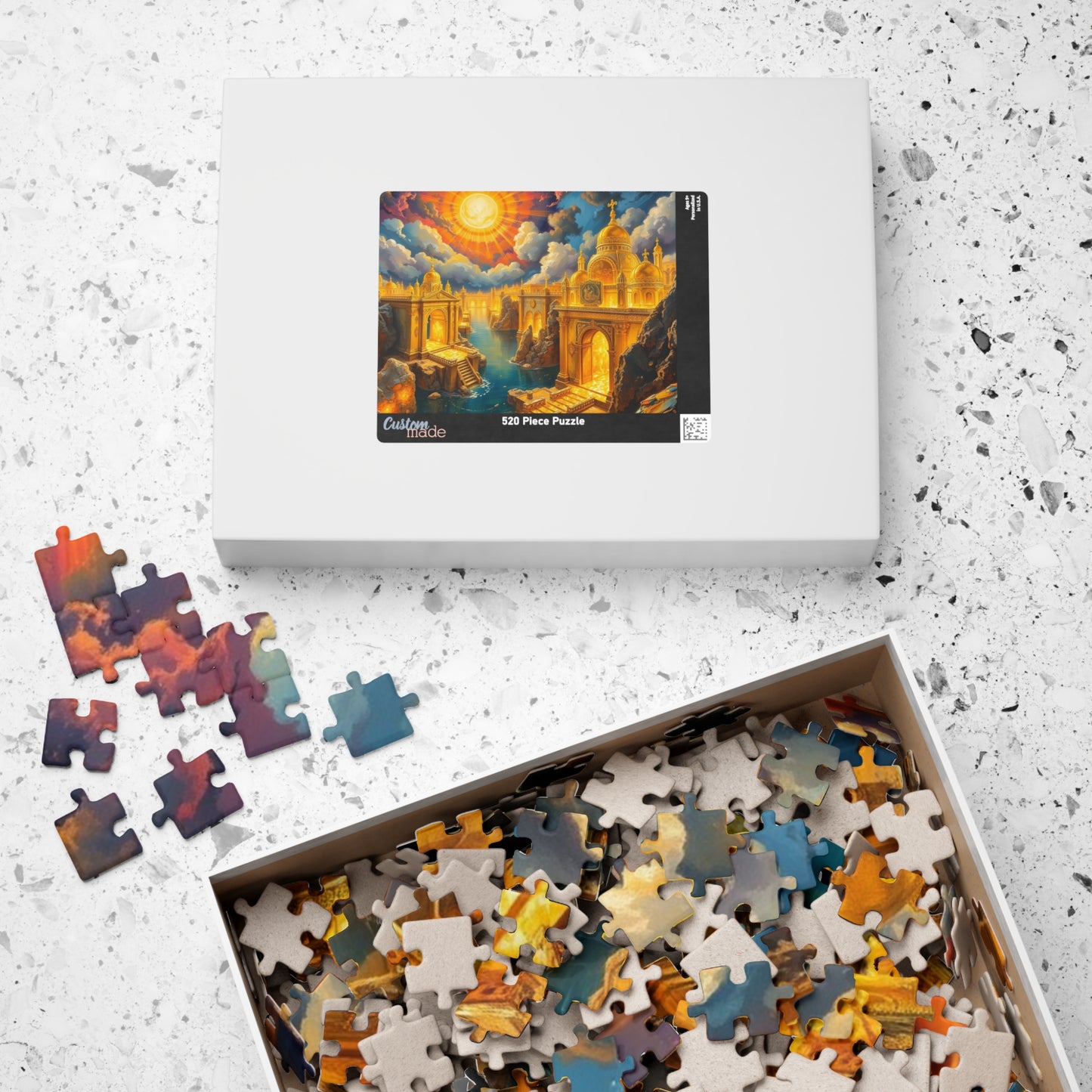 Step into a world of divine beauty with this breathtaking puzzle featuring a shining city of gold and crystal. Towering gates of luminous pearls open to streets paved with translucent gold, all glowing under a radiant, heavenly sky. Rivers of pure, sparkling water flow through the city, while walls adorned with shimmering gemstones create a scene of unmatched elegance and perfection. This puzzle offers a captivating and serene journey, making it the perfect choice for anyone who loves stunning, otherworldly designs.