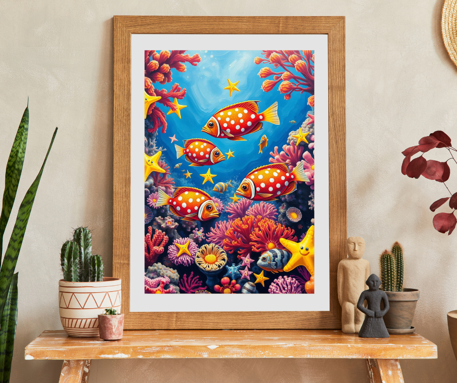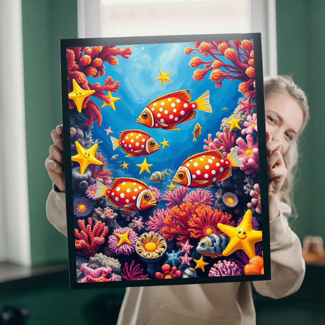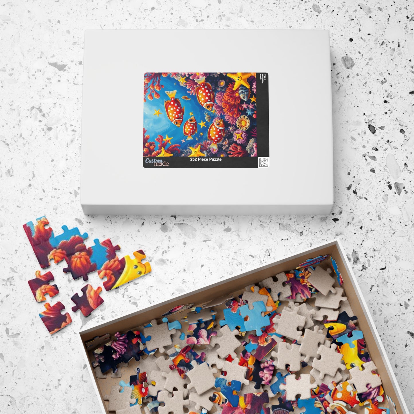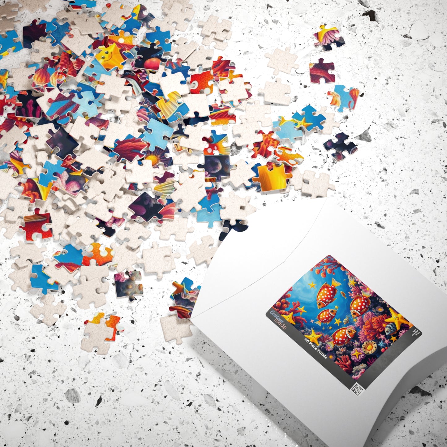 Dive into a world of color with this vibrant ocean puzzle featuring surreal coral reefs, glowing starfish, and whimsical tropical fish. Inspired by contemporary art styles and patterns reminiscent of Yayoi Kusama’s polka dots, this underwater puzzle blends natural beauty with imaginative design. Perfect for puzzle lovers of all skill levels, this colorful jigsaw puzzle comes in multiple difficulty levels (110–1014 pieces), making it a great choice for family puzzle nights, solo relaxation, or as a gift for ocean lovers. The adorable fish and glowing reef elements make it ideal for display as underwater decor once completed. Whether you’re a fan of marine life, looking for a relaxing hobby, or shopping for a fish puzzle for adults, this bright and creative puzzle will make a splash in your collection.