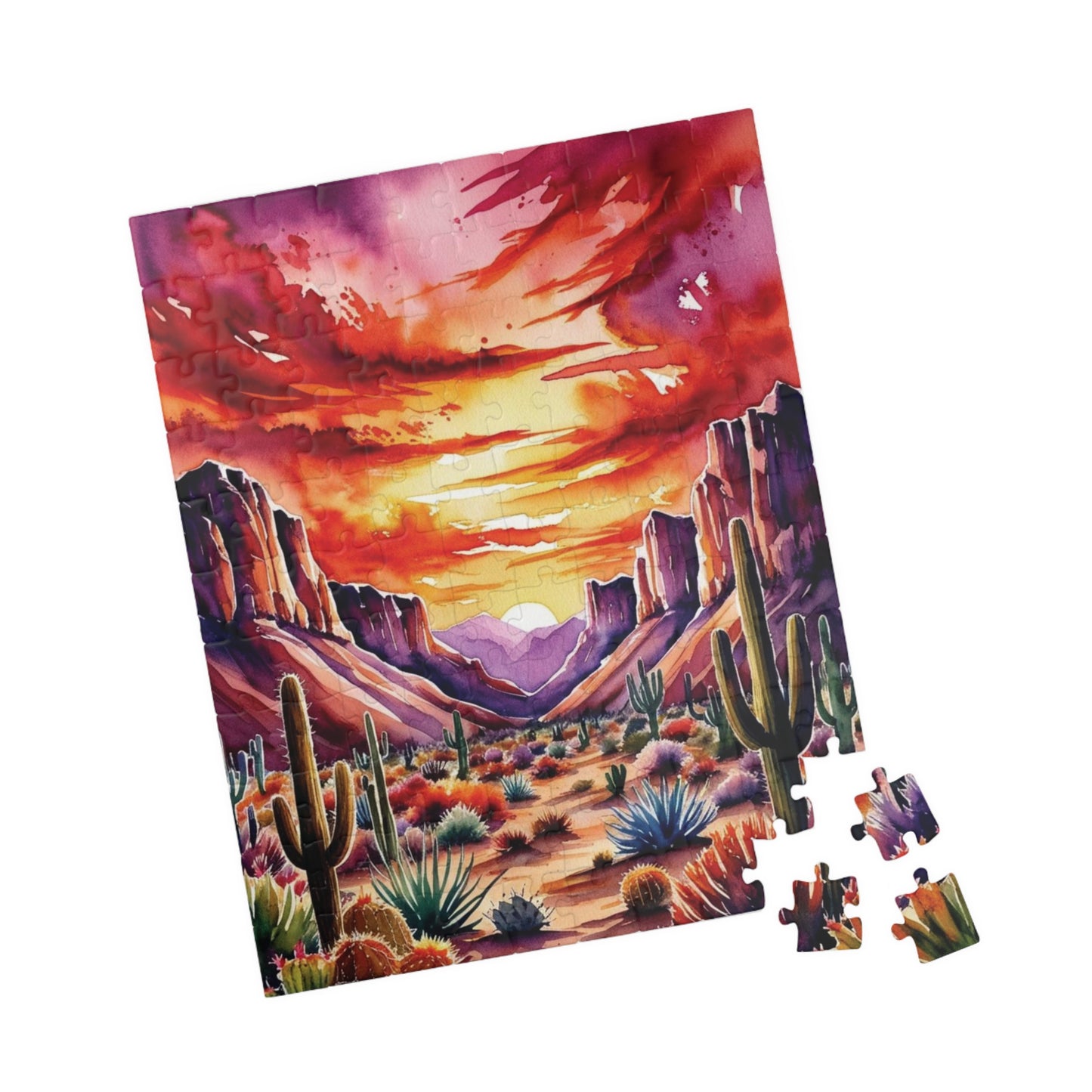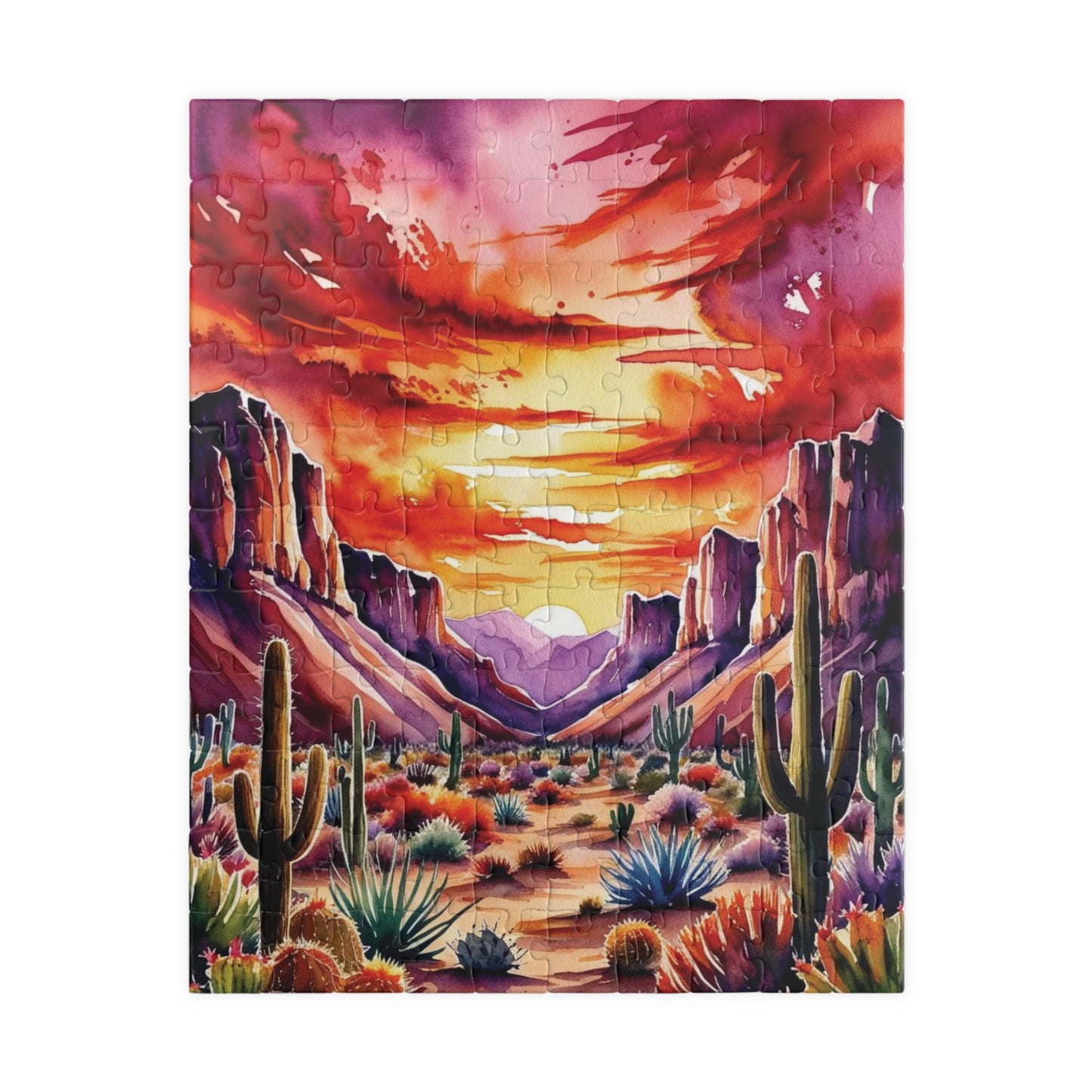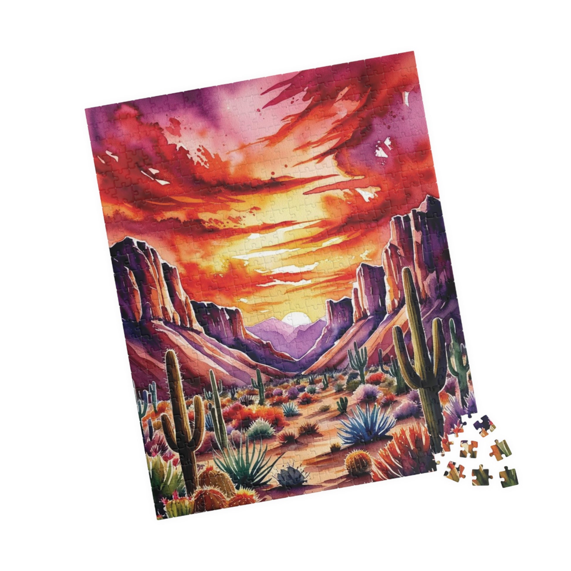 Immerse yourself in a serene desert landscape with this cacti and fiery sunset puzzle. Perfect for puzzle enthusiasts who enjoy vibrant colors and picturesque scenes. Ideal for relaxation and unwinding after a long day. Great for gifting on birthdays, holidays, or as a thoughtful present for nature lovers.