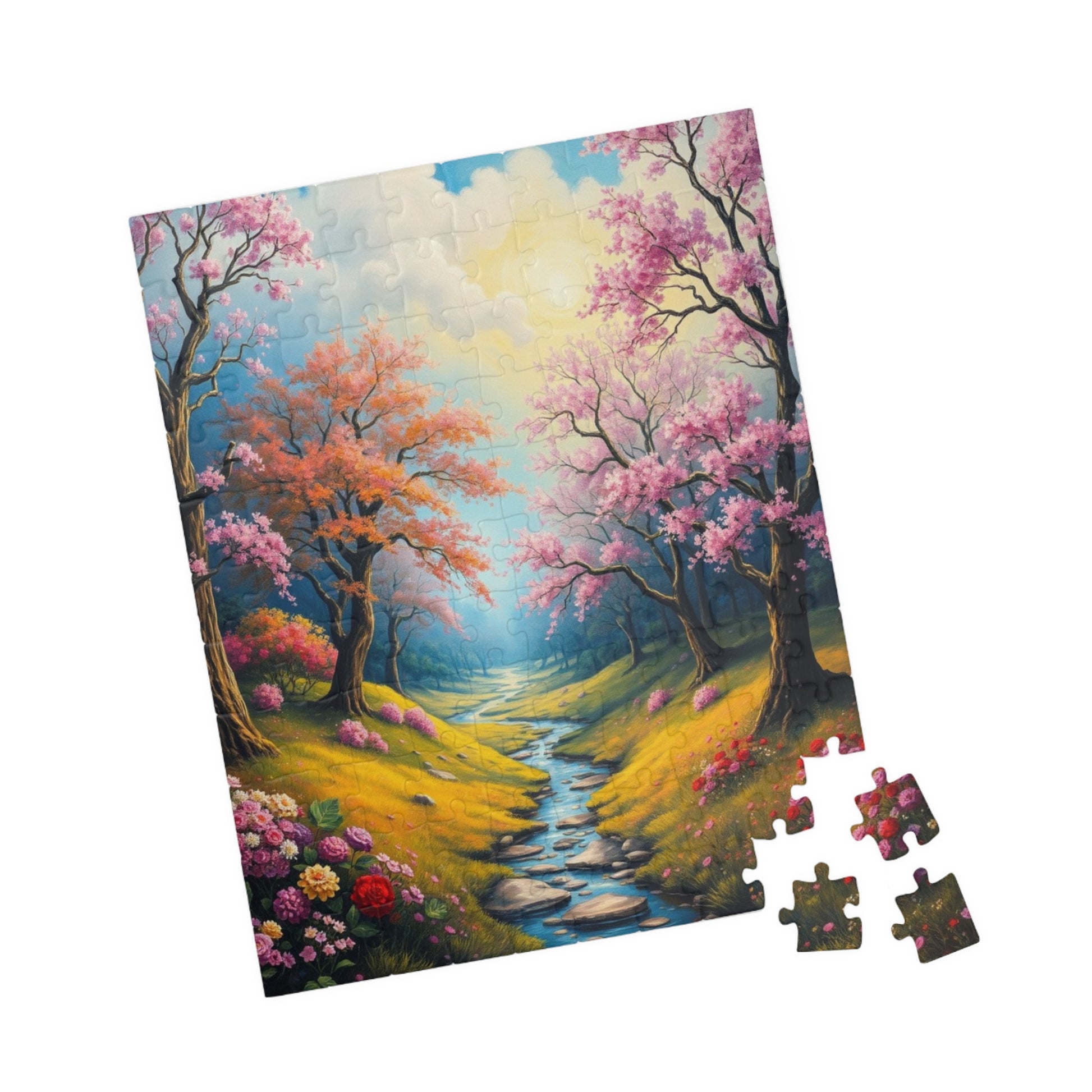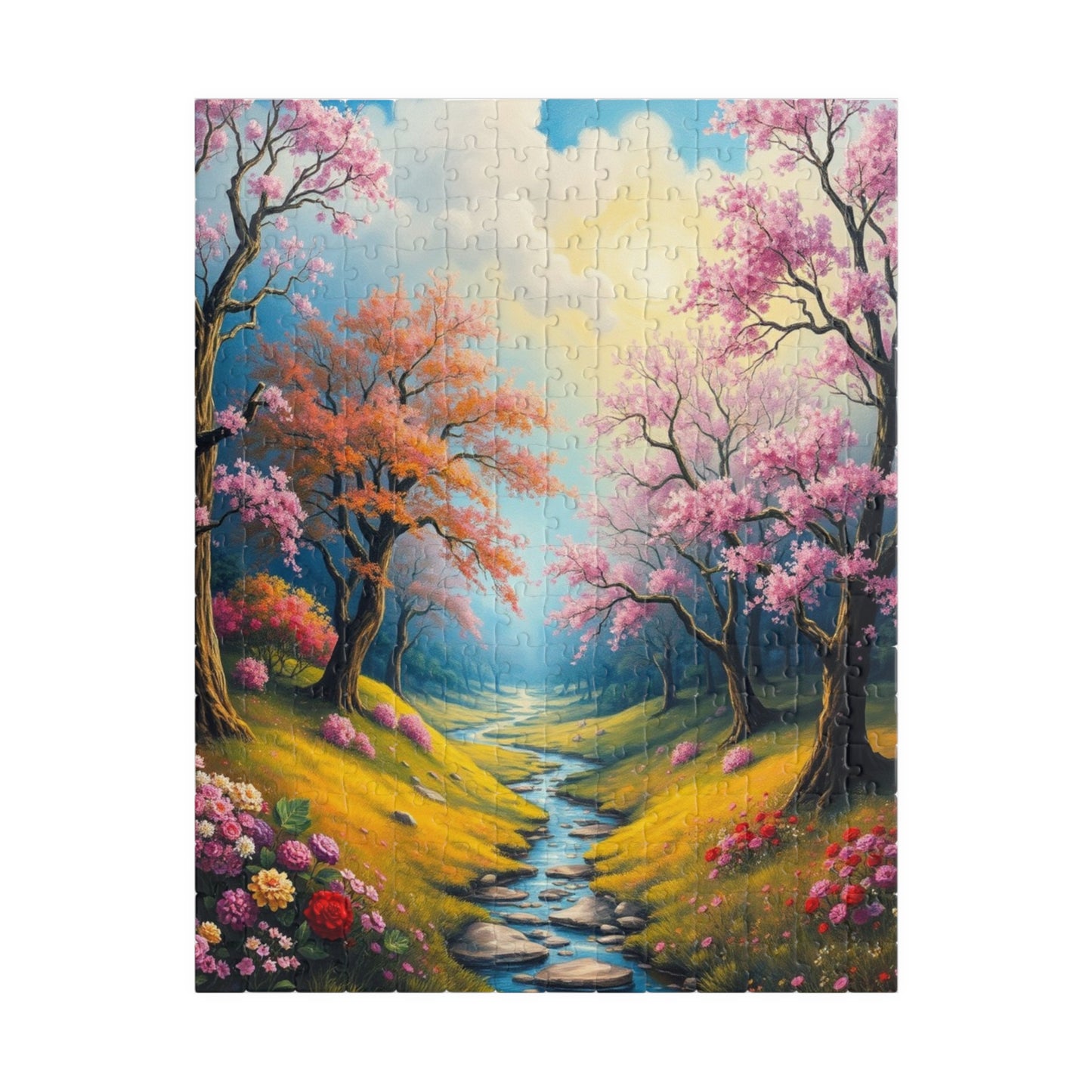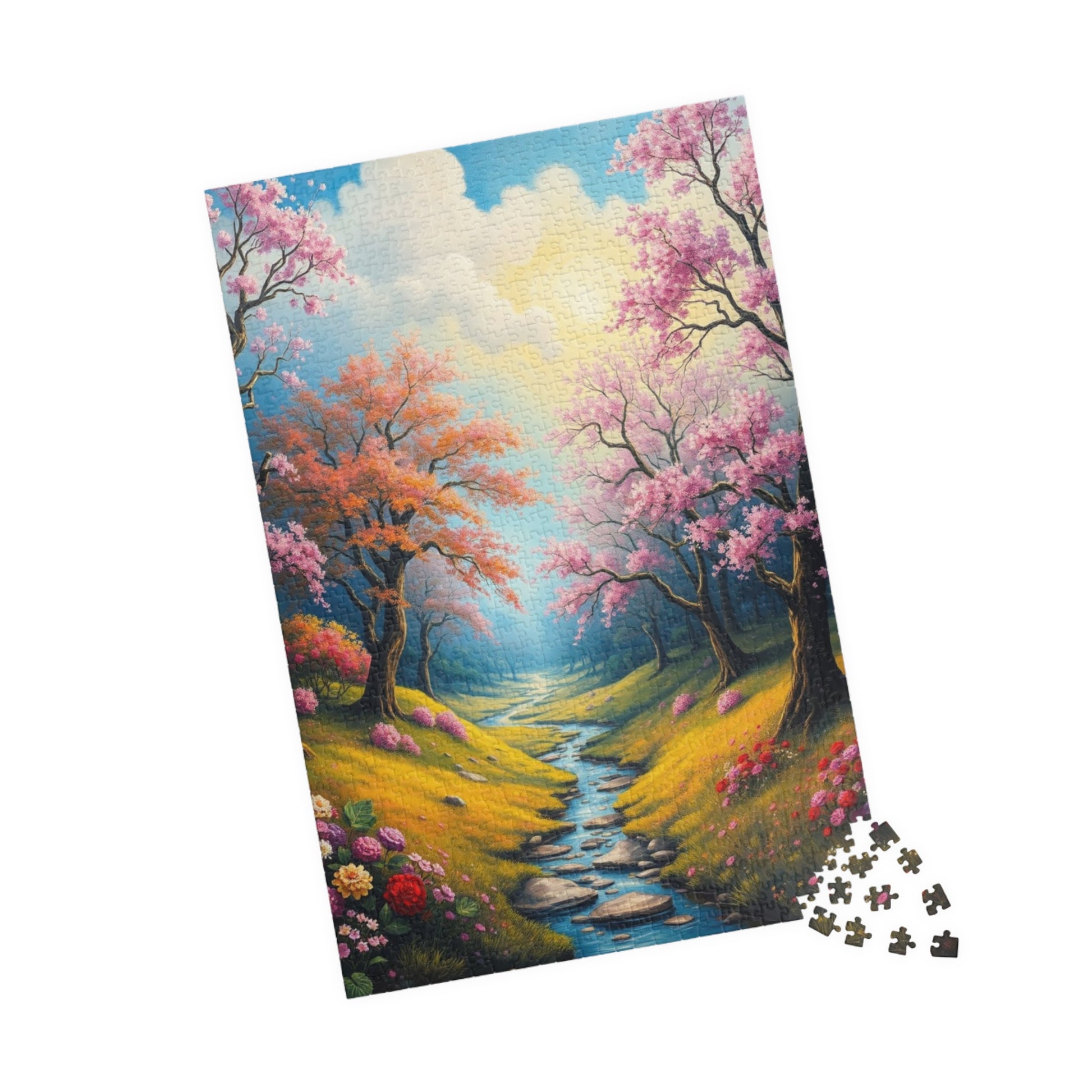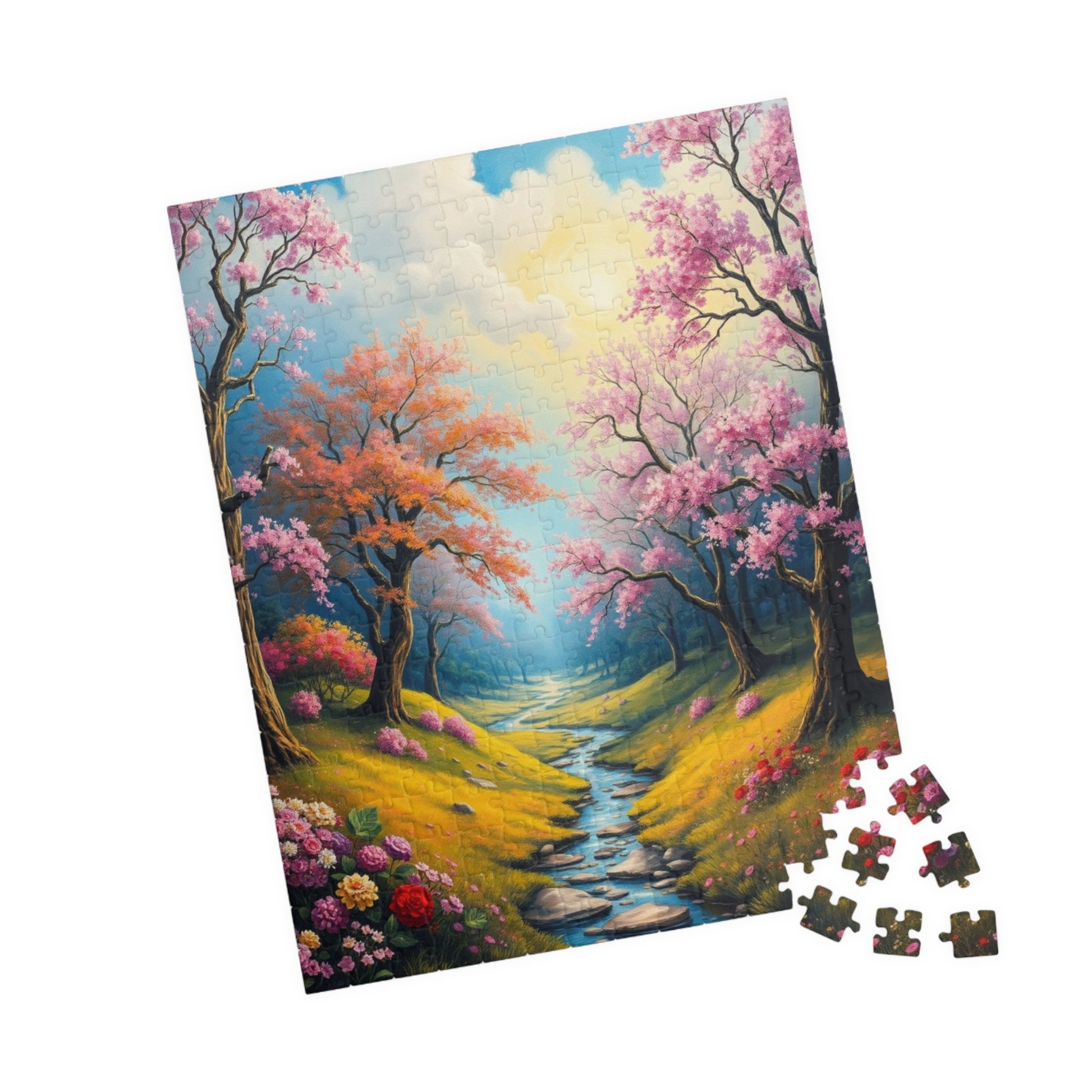 A stunning puzzle featuring a spring landscape with colorful trees, flowers, and greenery. Perfect for those who enjoy relaxing and unwinding with a challenging yet beautiful activity. Ideal for nature lovers and puzzle enthusiasts. Great for gifting during birthdays, Mother's Day, or any special occasion.