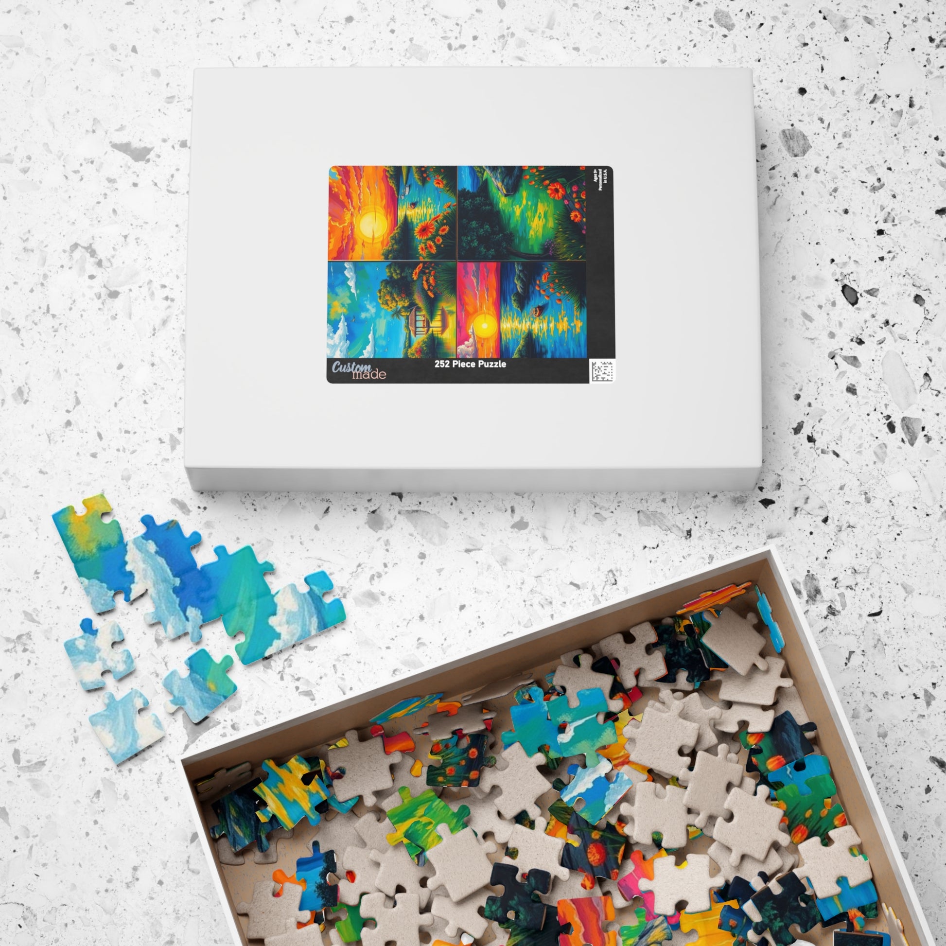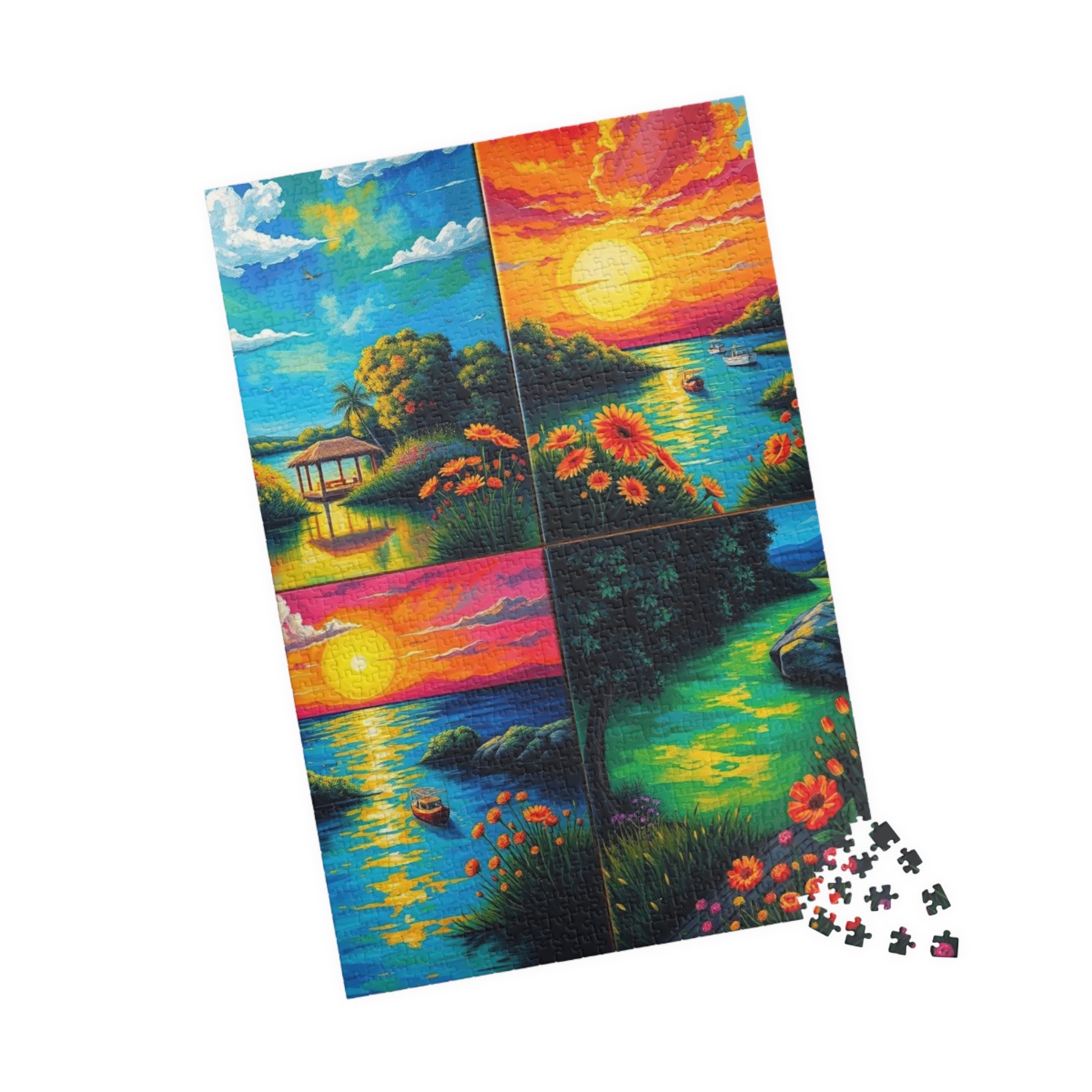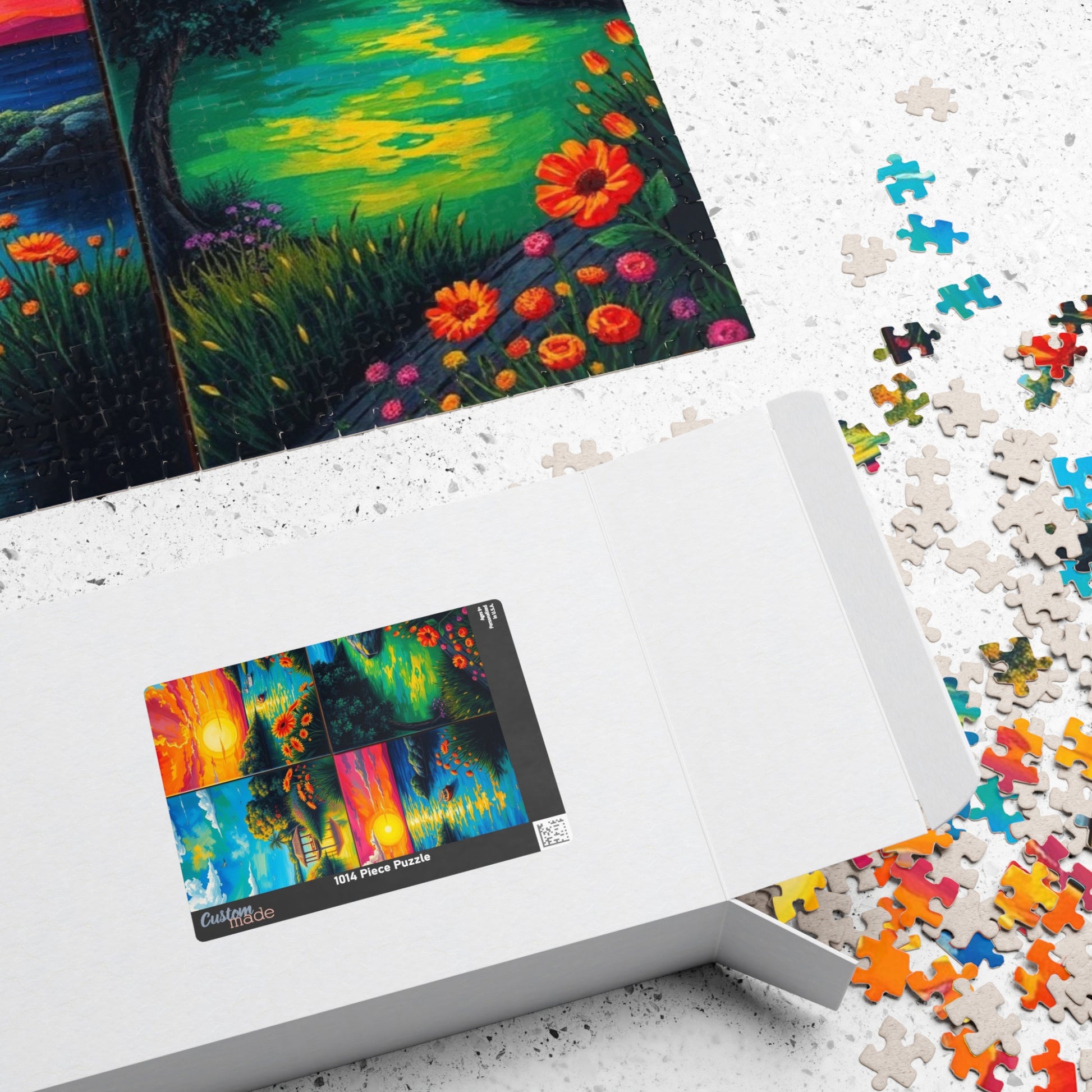 Unique and eye-catching collage puzzle featuring four vibrant summer scenes with bioluminescent colors, perfect for relaxing and unwinding on a lazy afternoon. Ideal for puzzle enthusiasts and nature lovers looking to escape into a magical world. Great gift for birthdays, holidays, and family gatherings.