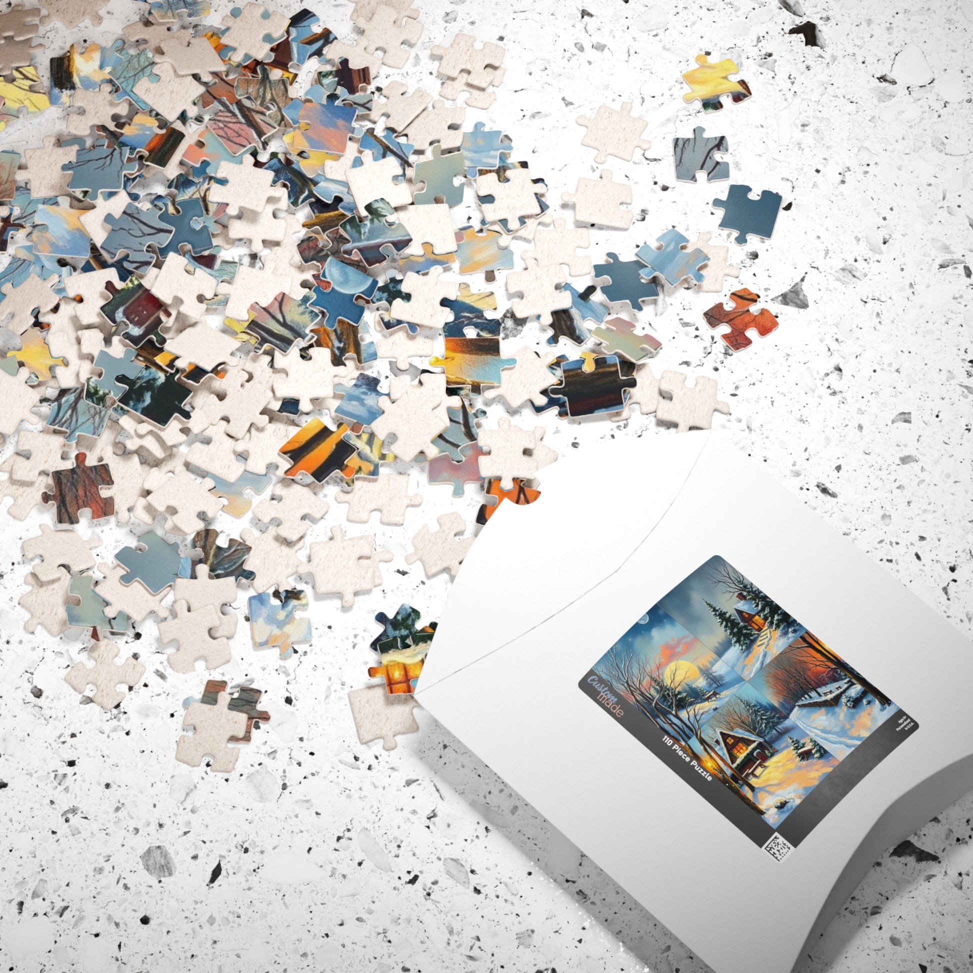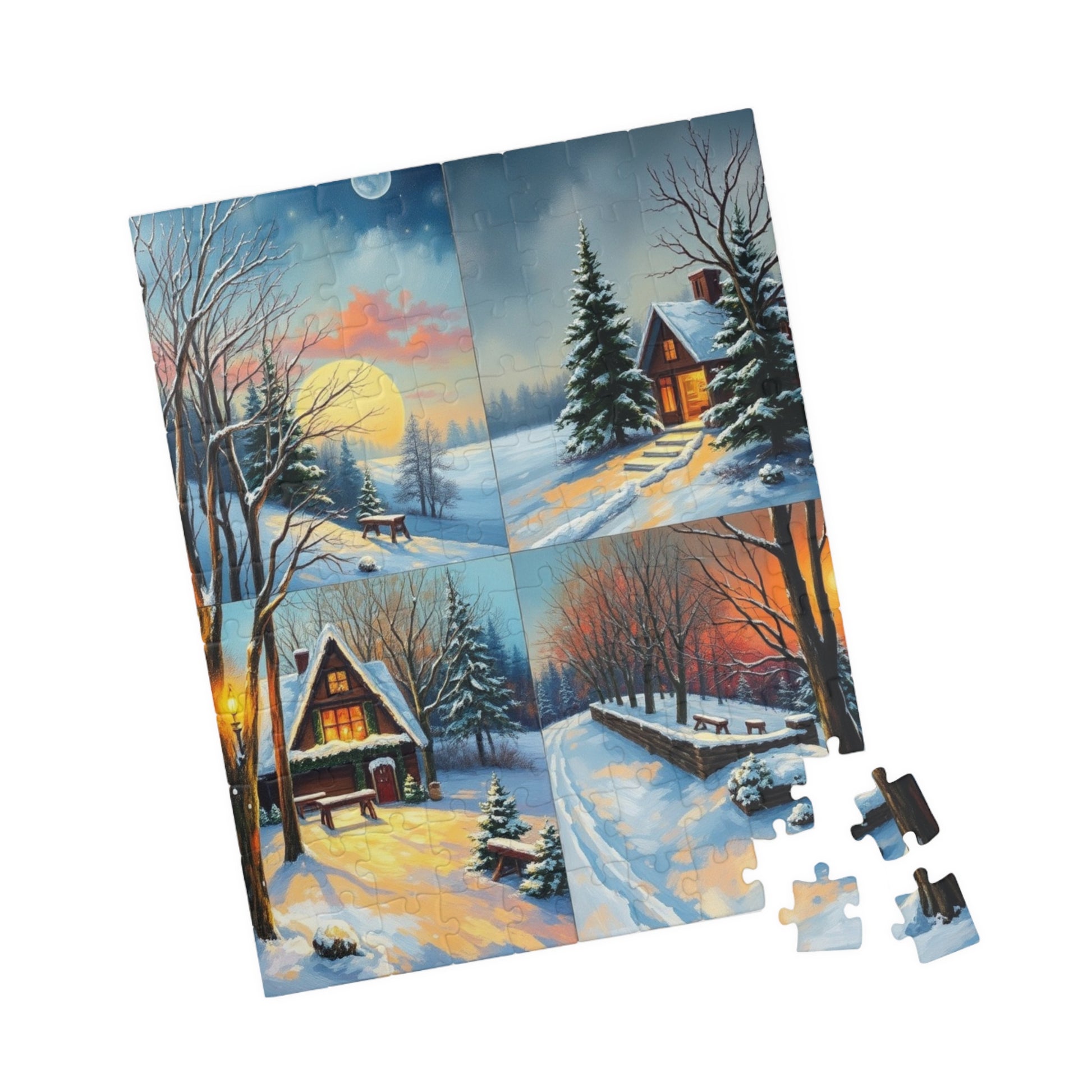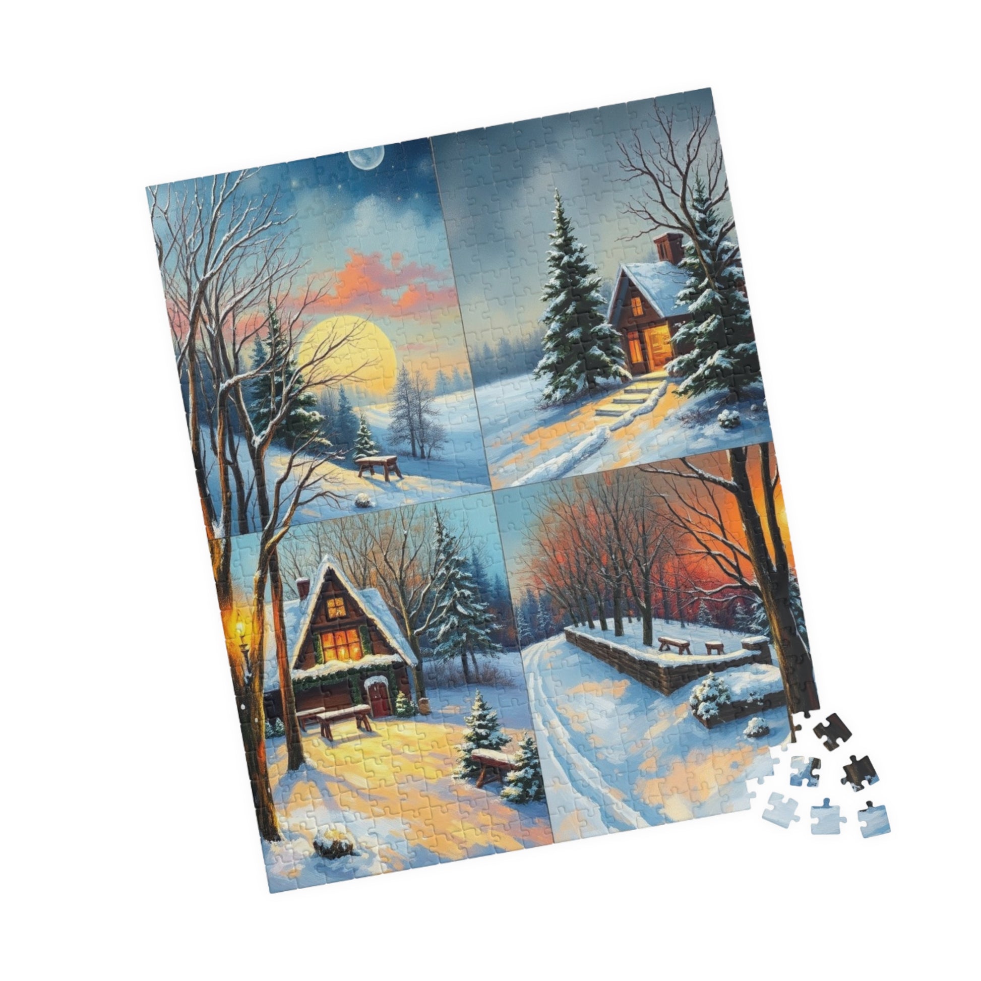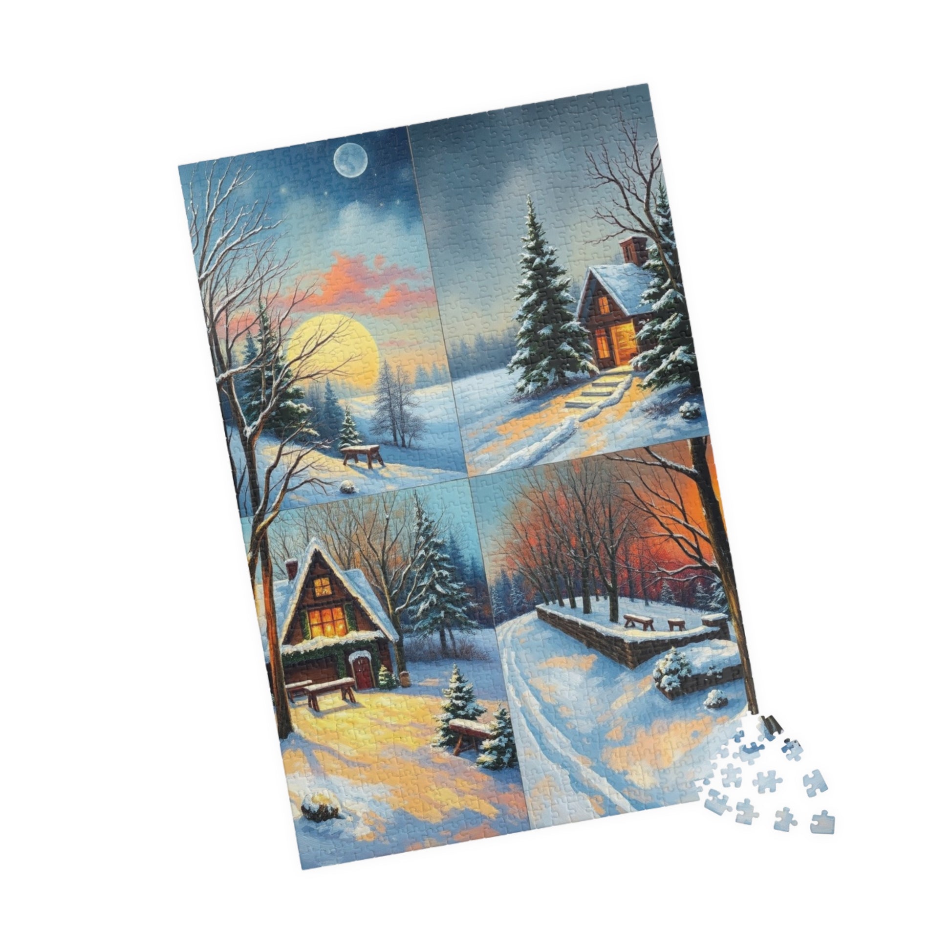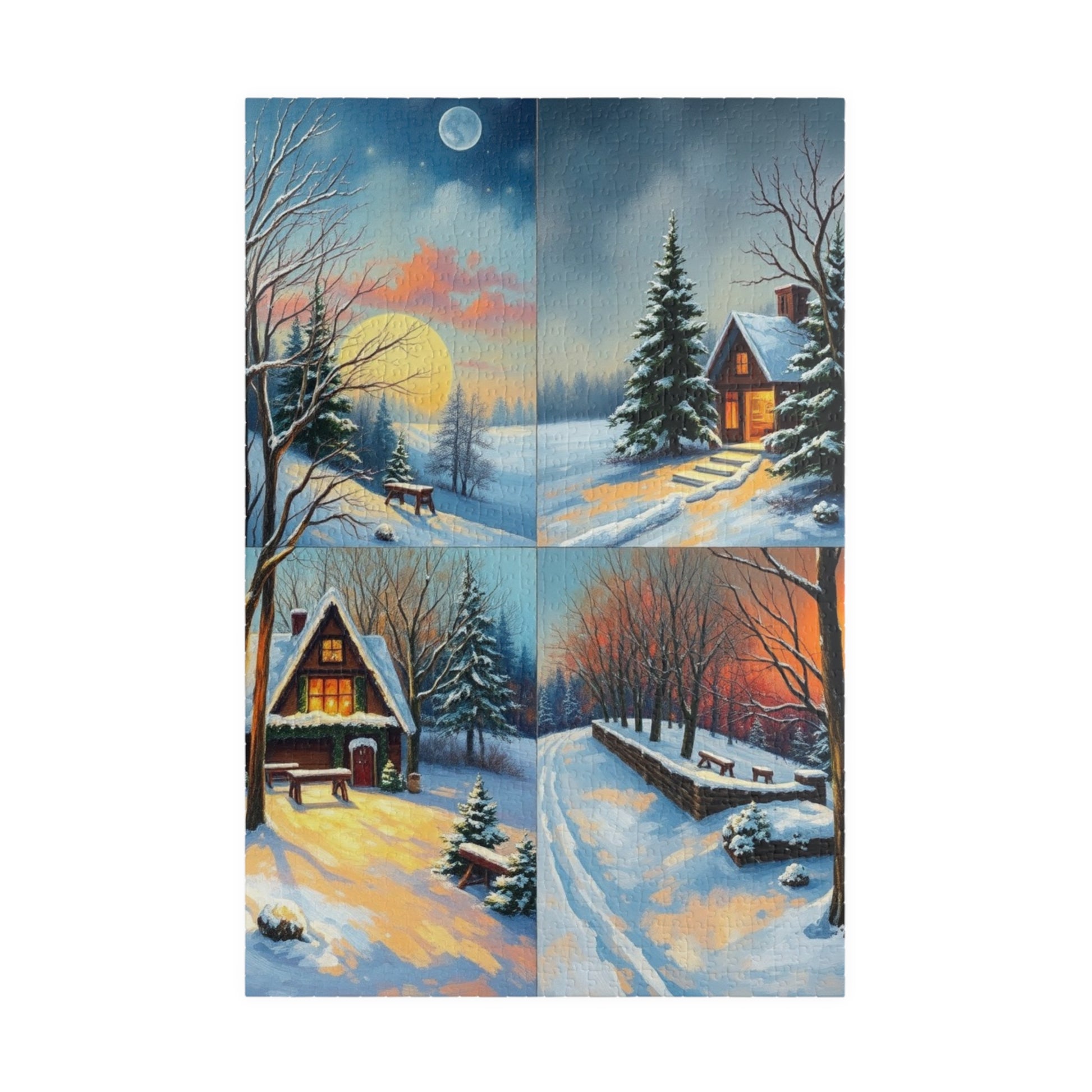 A four-quadrant collage puzzle with each quadrant depicting a detailed winter scene. The vibrant colors and high-quality chipboard pieces make it a perfect activity for cozy winter nights or as a thoughtful gift for puzzle enthusiasts. Ideal for winter holidays, family gatherings, or quiet evenings at home.
