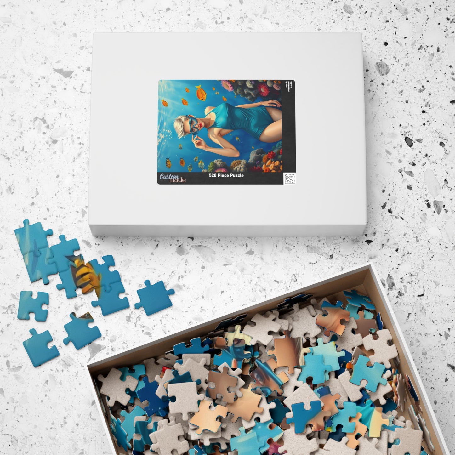 Dive into an enchanting underwater world with this beautifully designed puzzle. A graceful fair-skinned woman with a stylish pixie cut glides effortlessly through a vibrant coral reef, her teal swimsuit providing a striking contrast against the dazzling hues of tropical fish and flourishing marine life. The scene is a mesmerizing fusion of artistic brushstrokes, balanced tones, and complementary colors, capturing the mystic beauty of the ocean depths. Each piece reveals a new element of this serene yet lively underwater escape, making it the perfect immersive challenge for puzzle lovers and ocean enthusiasts alike. Whether you love snorkeling, marine landscapes, or artistic designs, this stunning and meditative puzzle will transport you to a world of wonder beneath the waves.