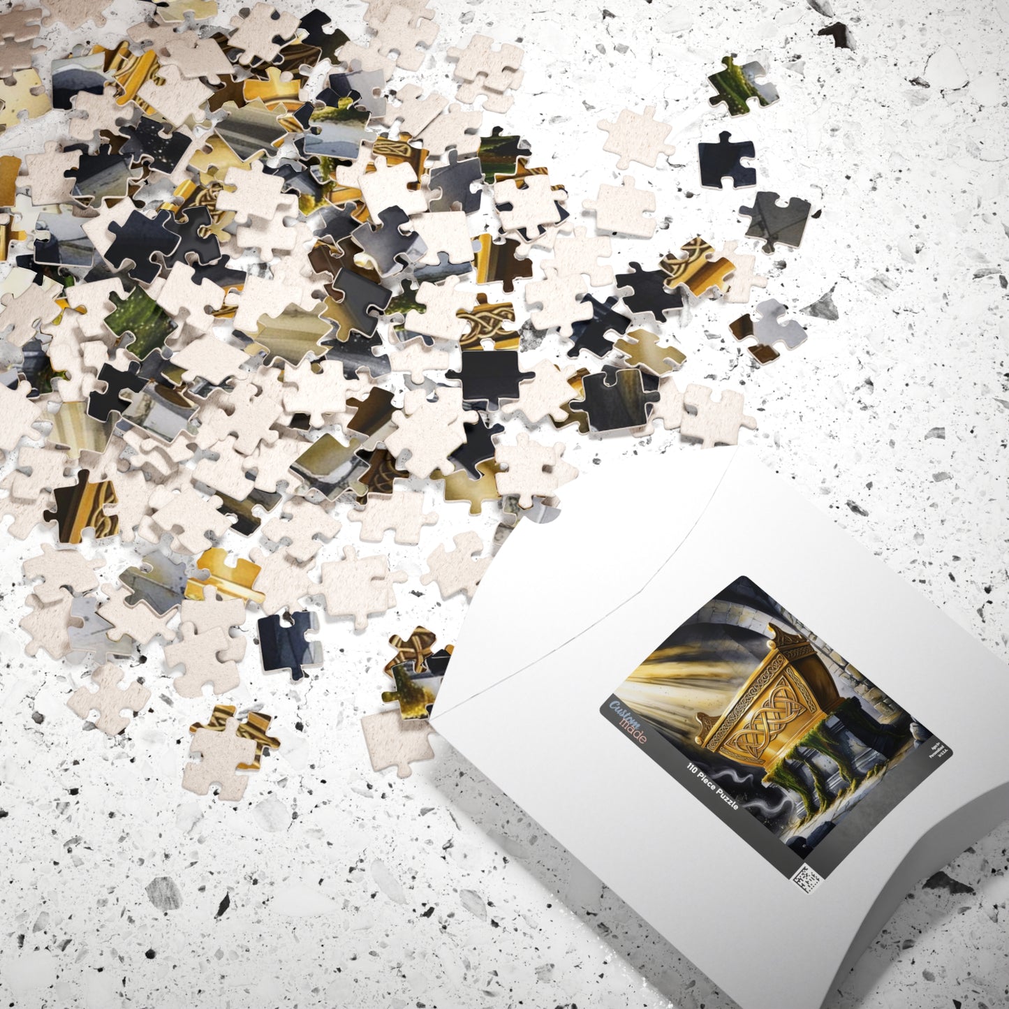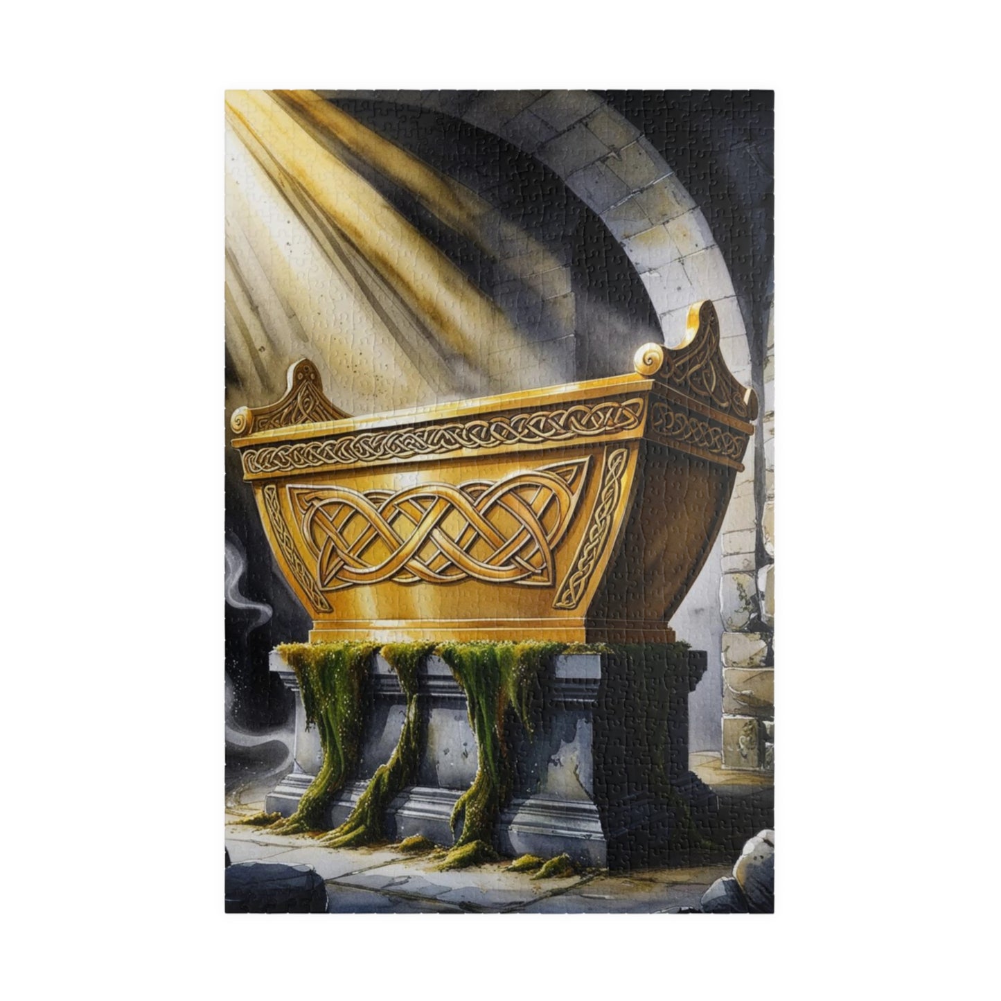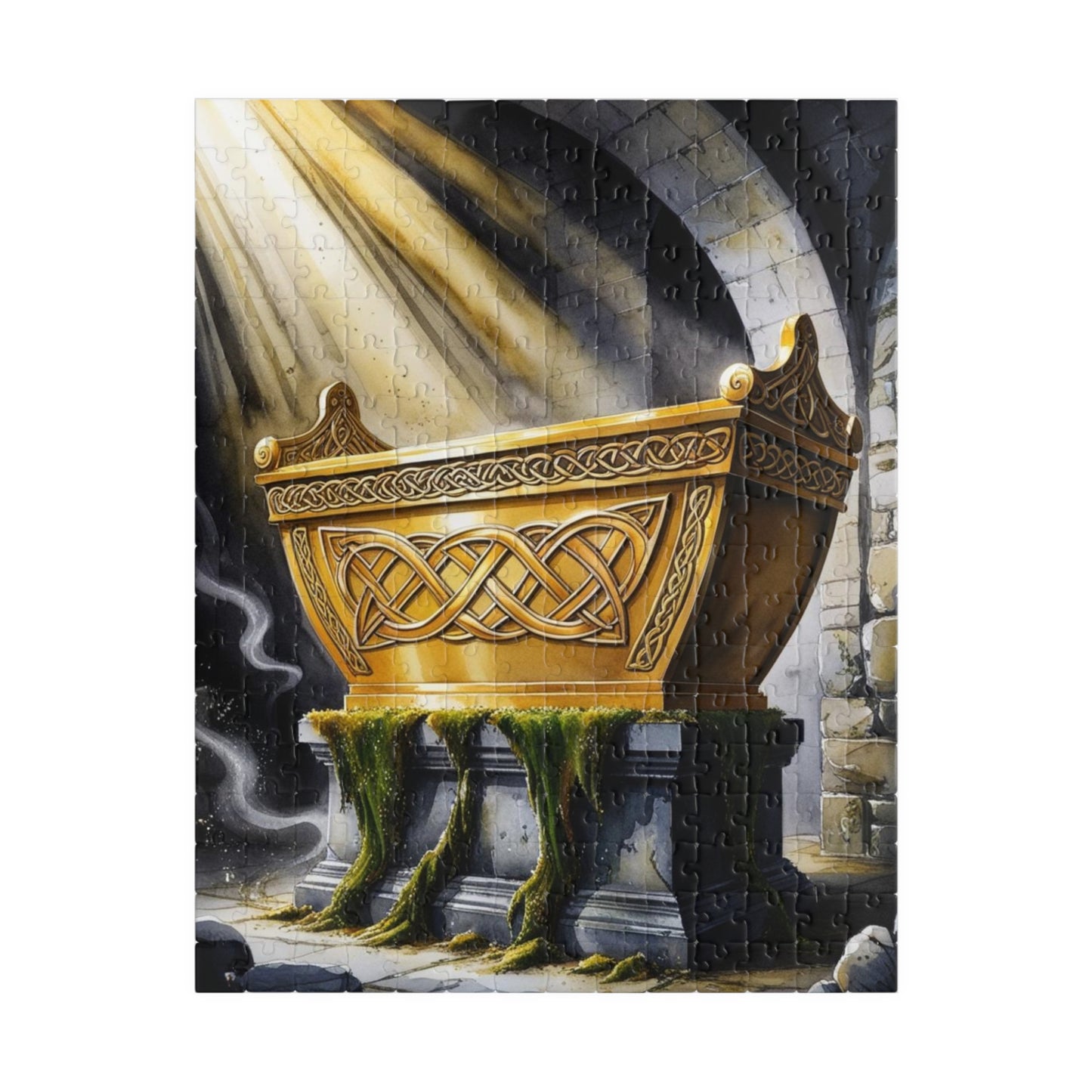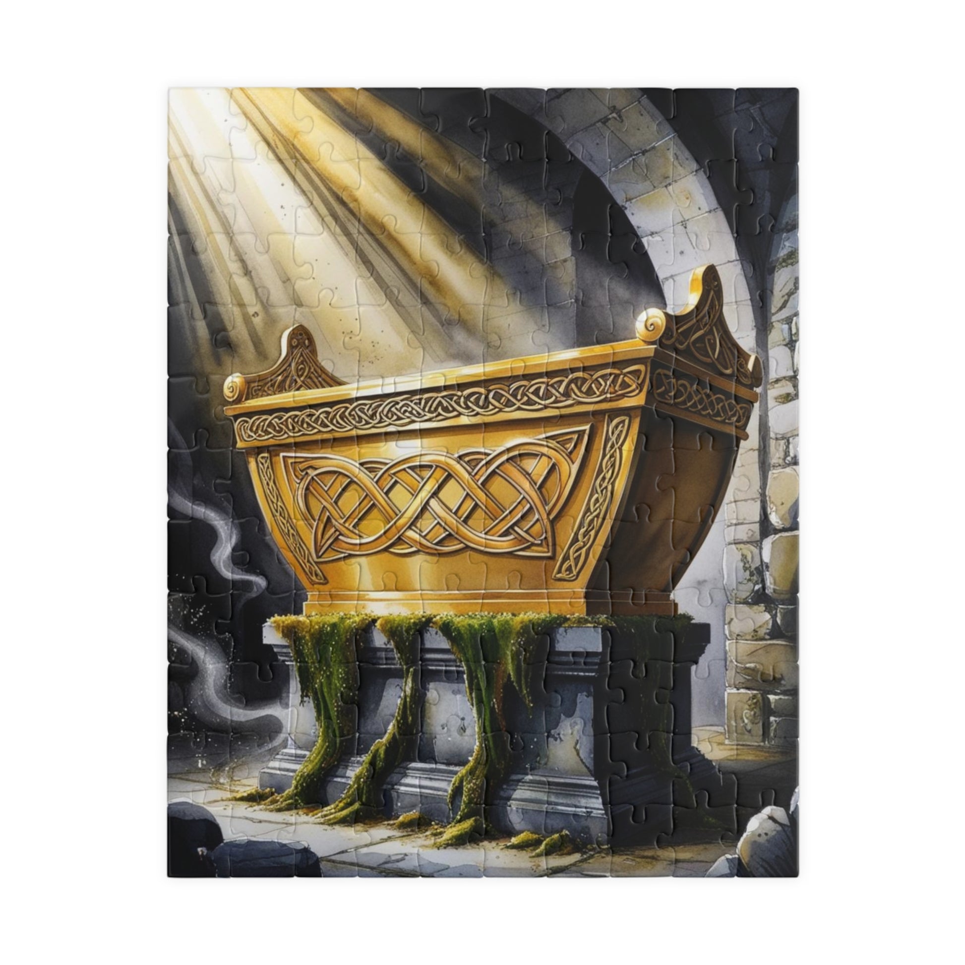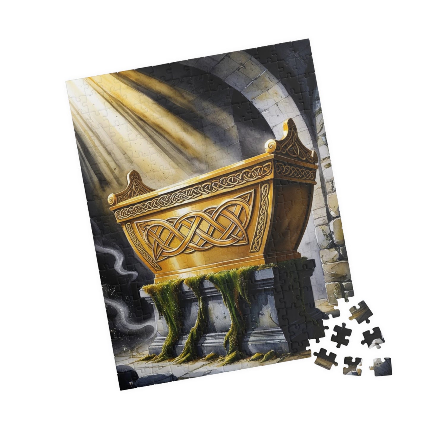 This religious puzzle depicts the golden ark adorned with intricate designs, surrounded by beams of divine light, set on a stone pedestal in a dark, ancient chamber. Perfect for religious holidays and occasions, this vibrant and high-quality puzzle will provide hours of entertainment for puzzle enthusiasts.