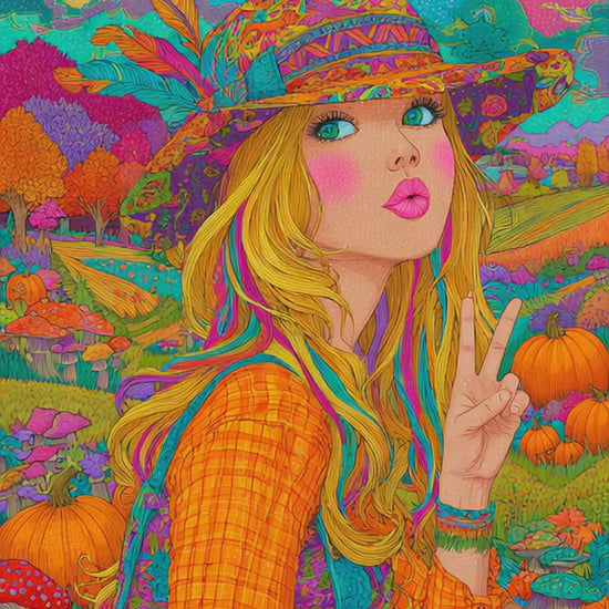 A vibrant and psychedelic puzzle featuring a cartoon-style illustration of a young woman in 1960s fashion with a swirling cowboy hat adorned with feathers and mushrooms. Each piece bursts with vibrant hues, drawing you into a relaxing and enjoyable experience. Perfect for family game nights or solo puzzling sessions, this puzzle offers an enriching activity that fosters connection and mindfulness. Perfect for those who love unique and colorful designs, this puzzle is ideal for fans of retro fashion and psychedelic art. Great for leisurely evenings or as a thoughtful gift for puzzle enthusiasts.