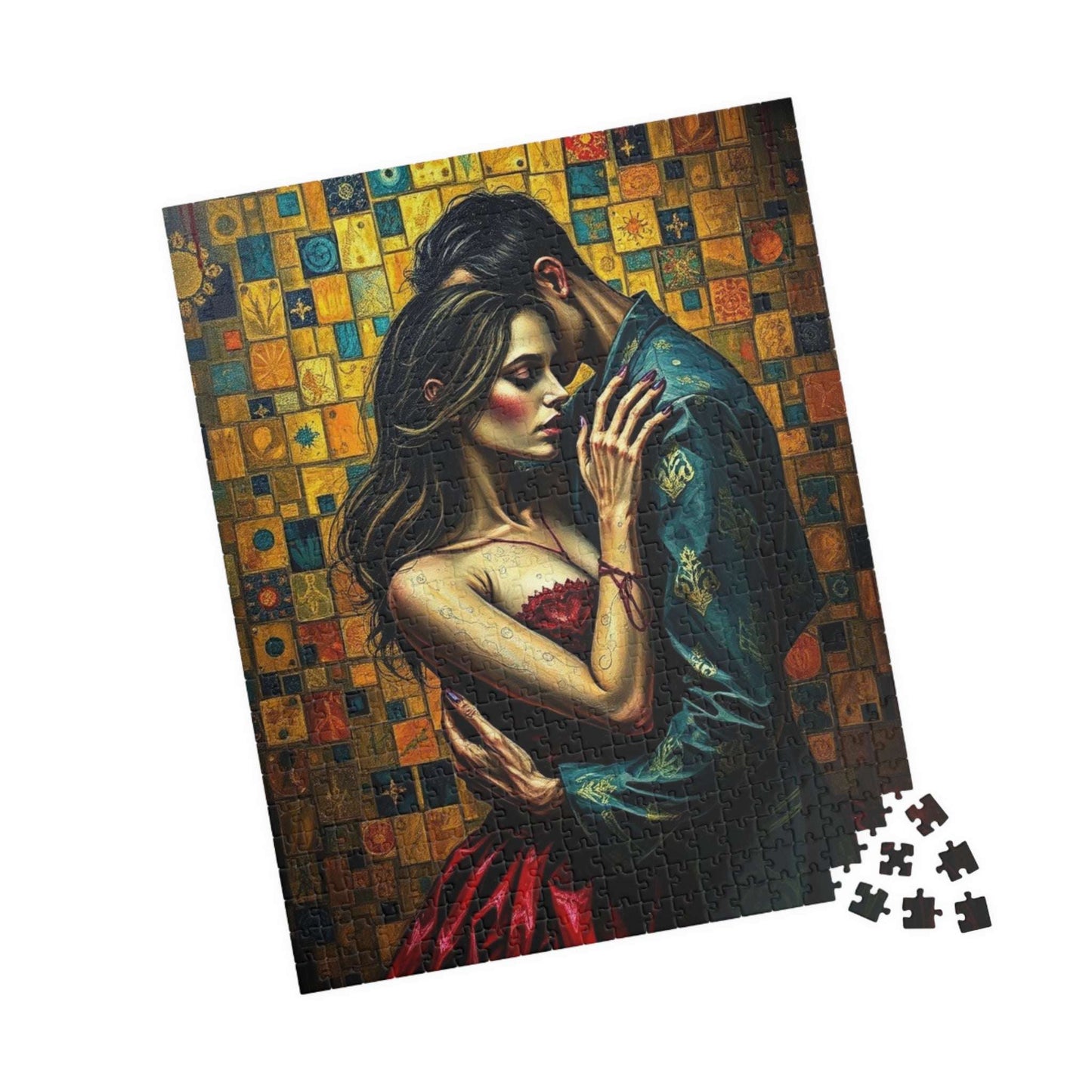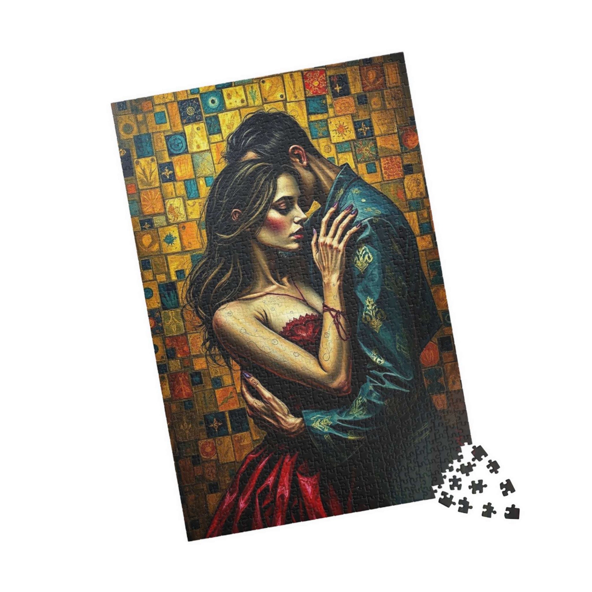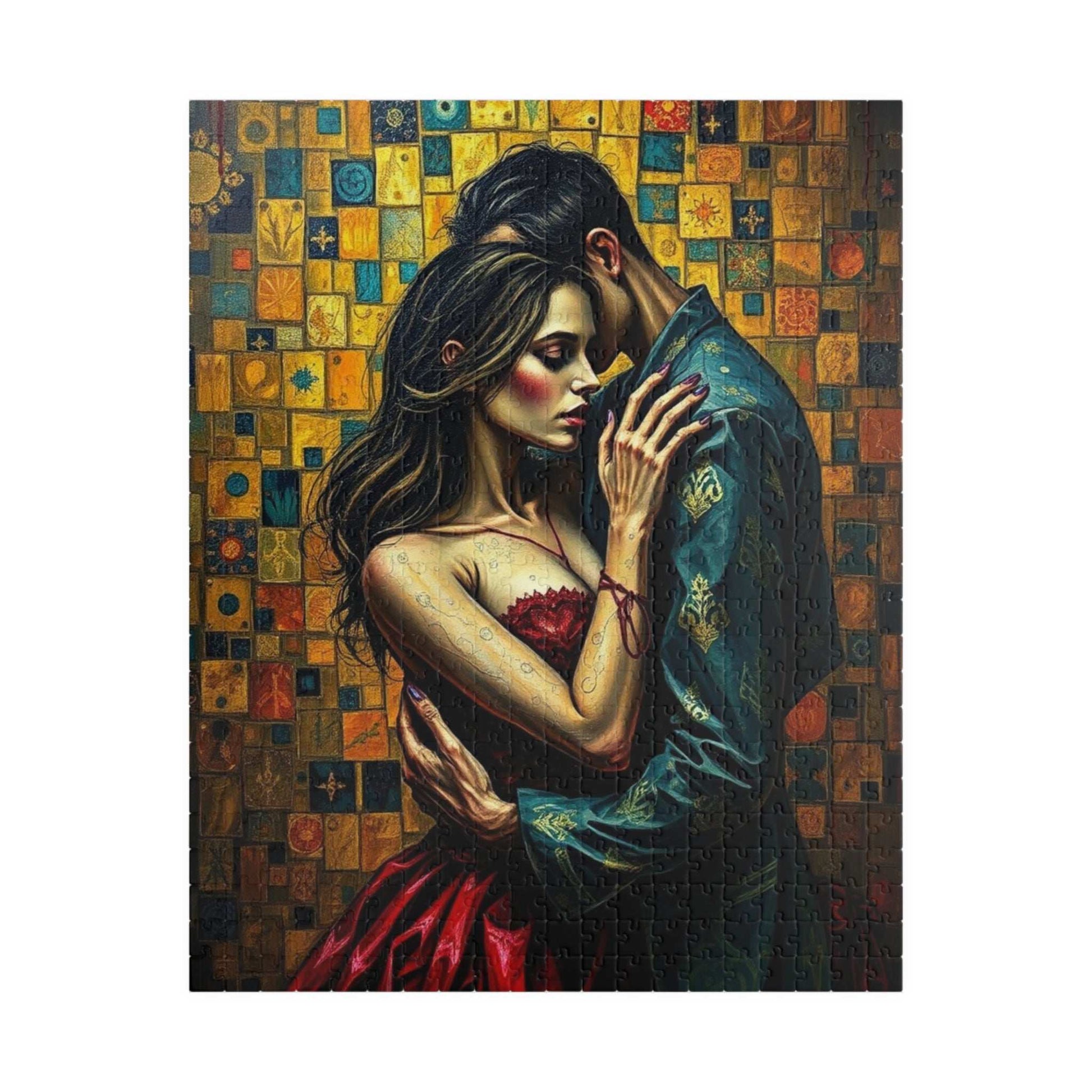 Romantic Embrace Gothic Jigsaw Puzzle, Eerie Couple Hugging Golden Jewel-Toned Patterns, Stress Relief, Unique Dark Art Puzzle Lover Gift