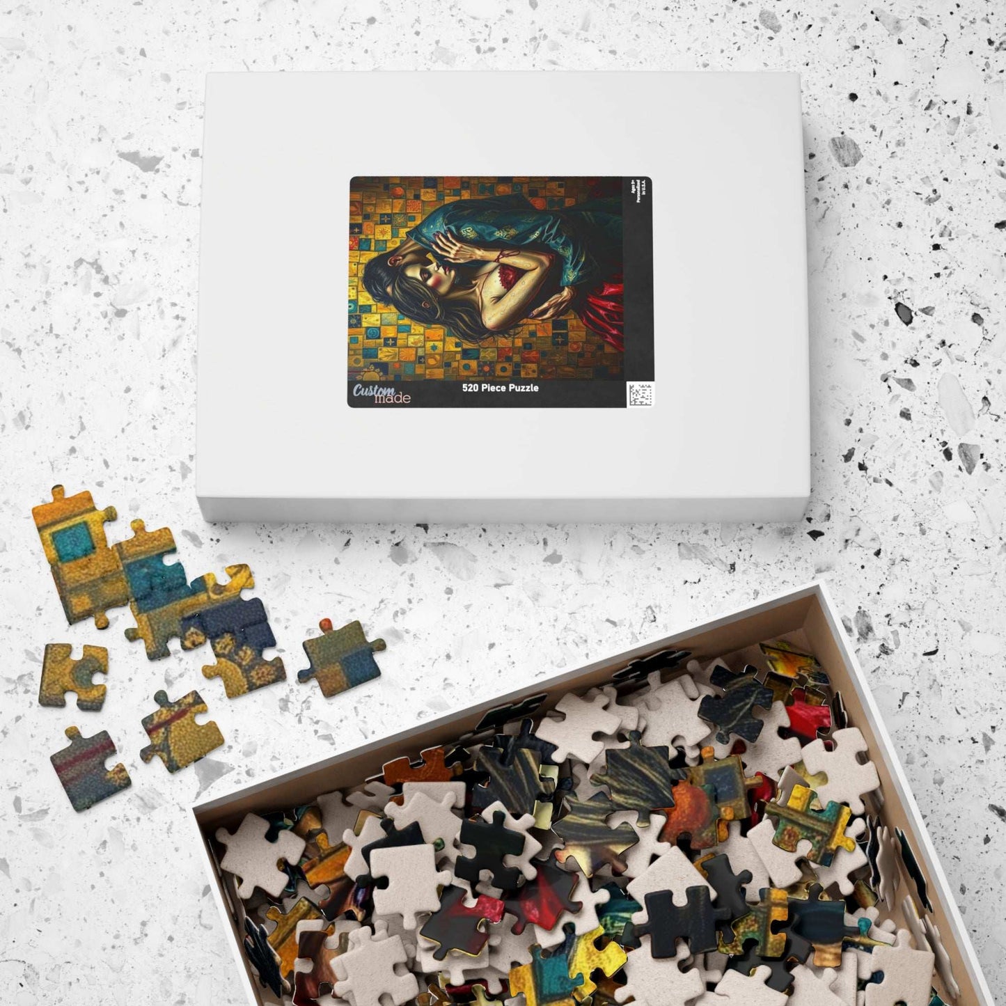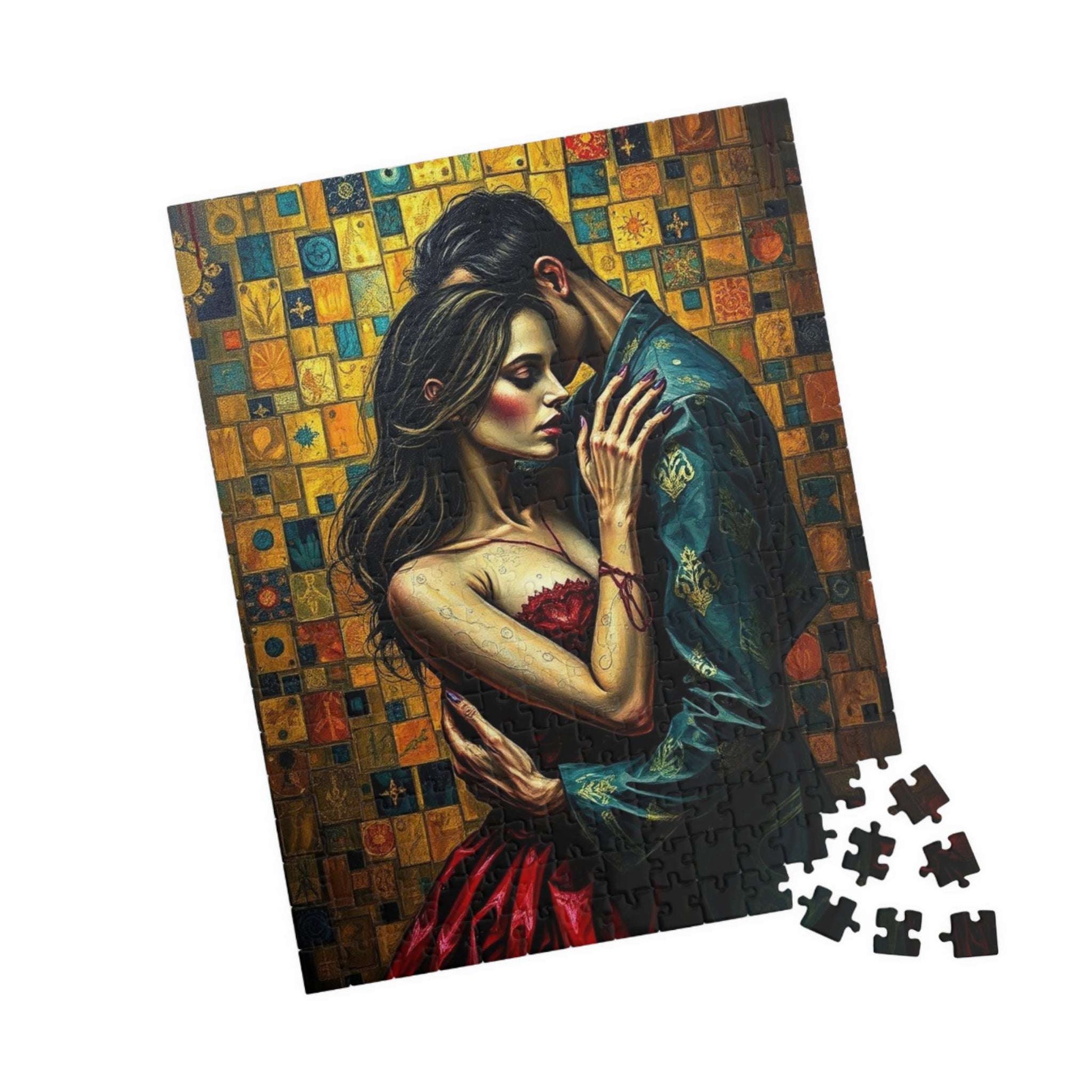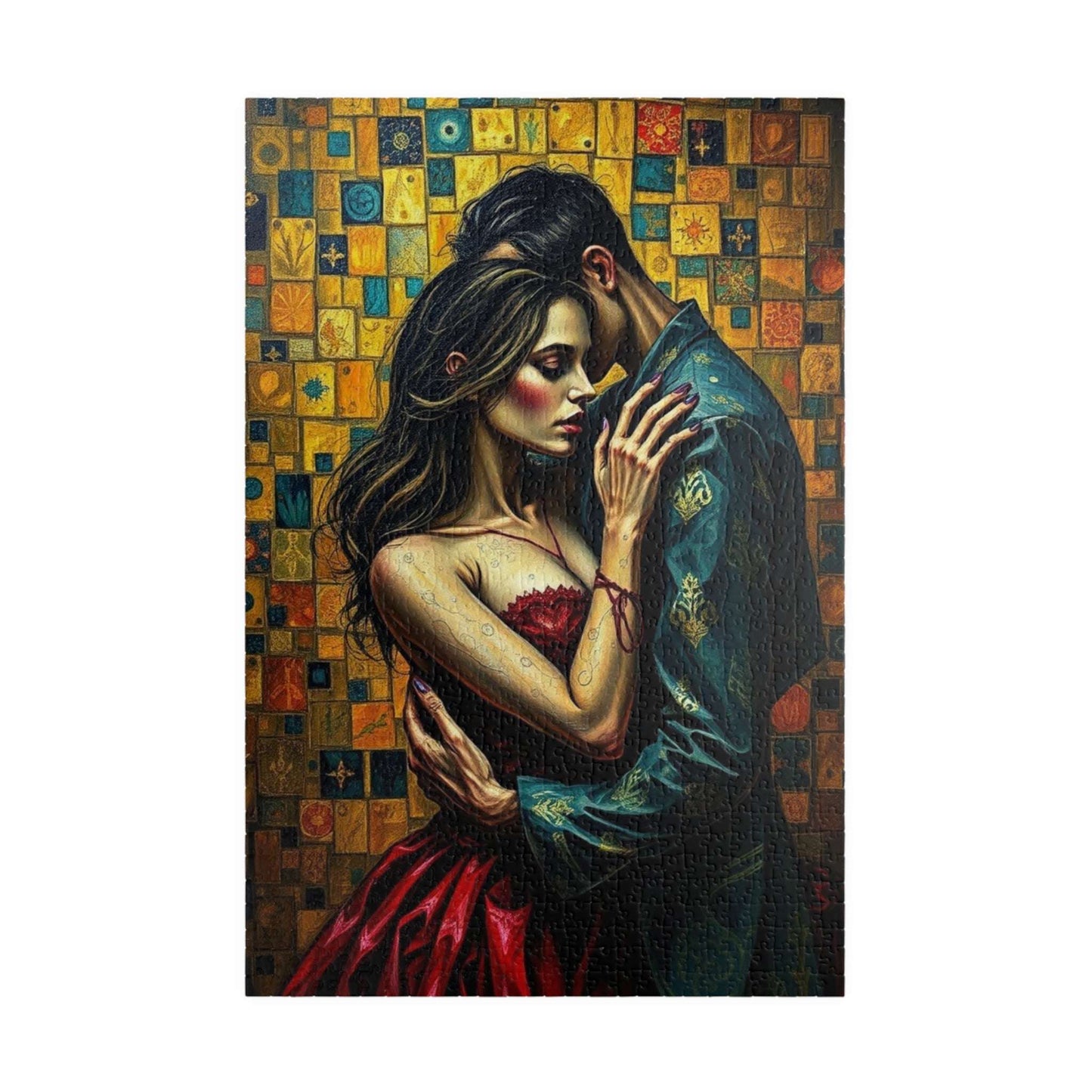 Romantic Embrace Gothic Jigsaw Puzzle, Eerie Couple Hugging Golden Jewel-Toned Patterns, Stress Relief, Unique Dark Art Puzzle Lover Gift