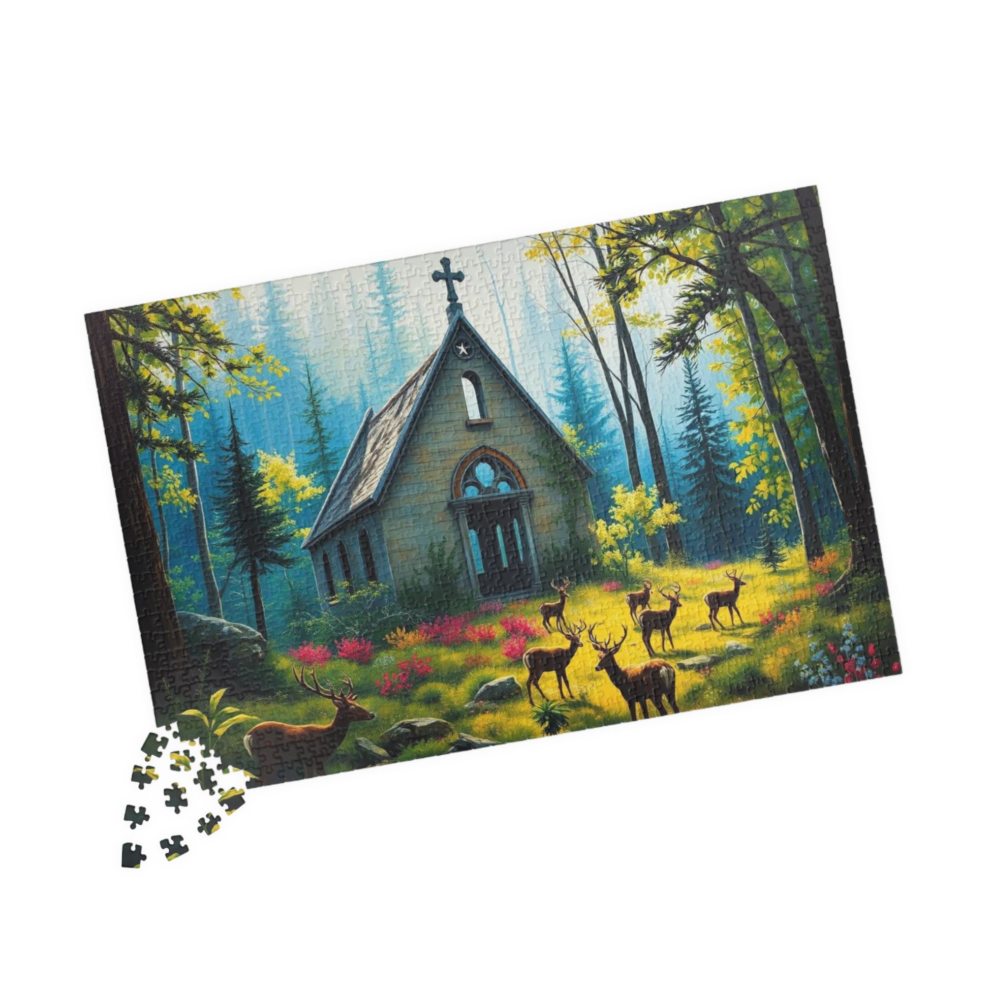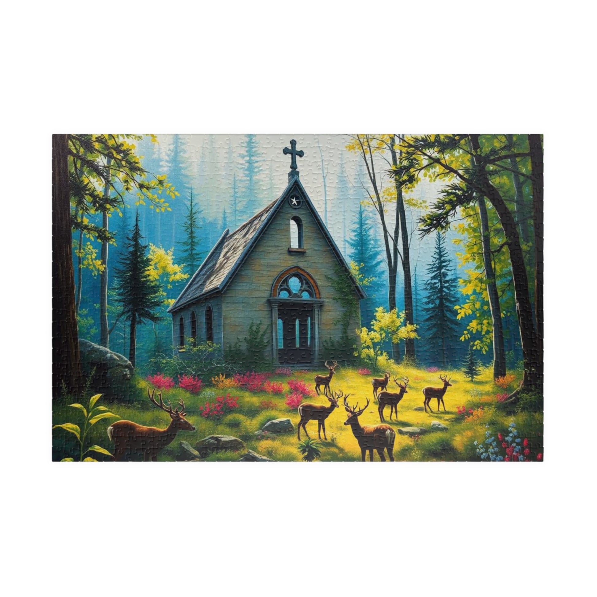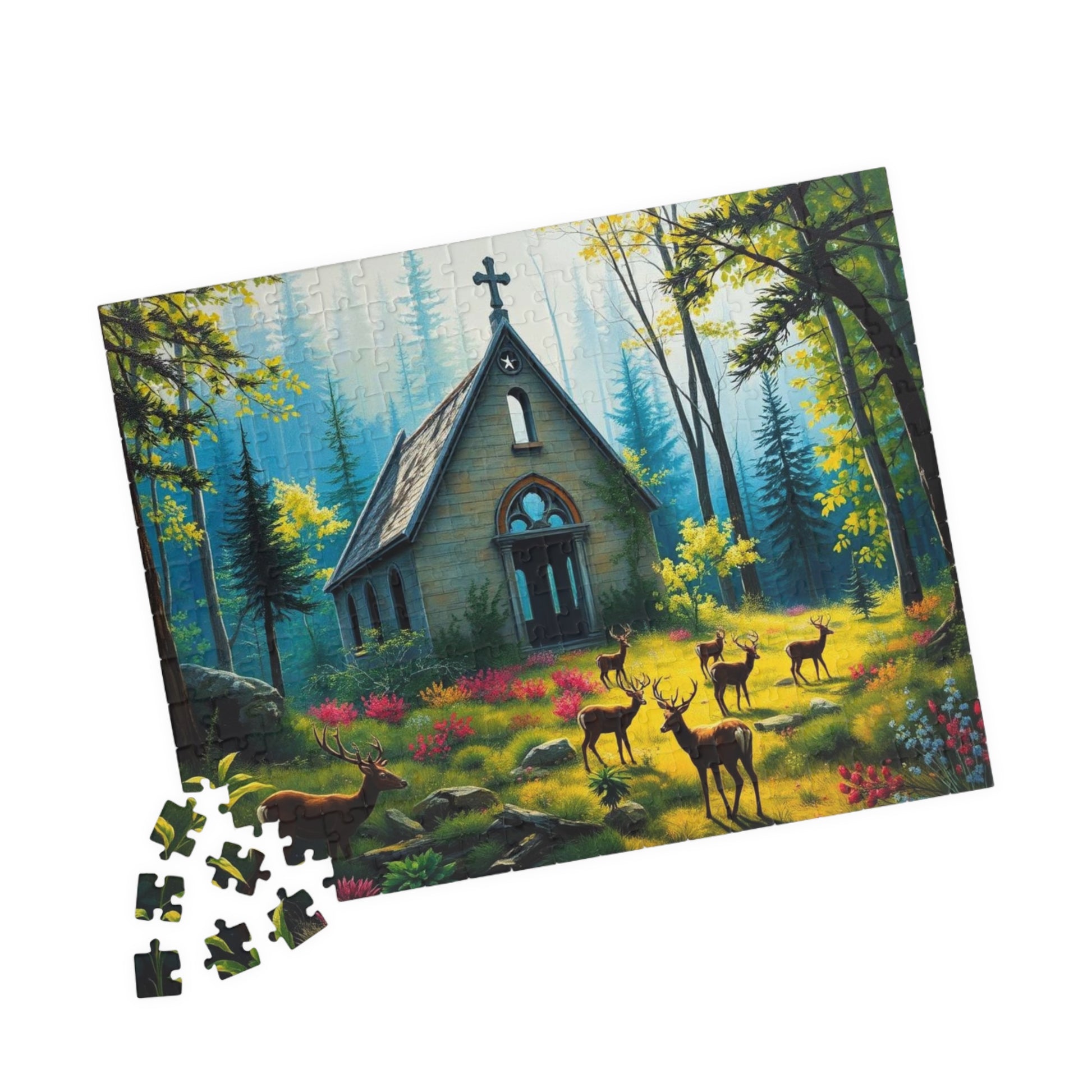 A gothic puzzle depicting a collapsed chapel in a forest, overgrown with plants with deer grazing peacefully. Perfect for those who enjoy challenging puzzles with a dark and mysterious theme. Ideal for quiet evenings or weekends, making a great gift for puzzle enthusiasts, nature lovers, or anyone who appreciates unique and intricate artwork. Relevant for Halloween, Christmas, or any time when a spooky and atmospheric puzzle is desired.