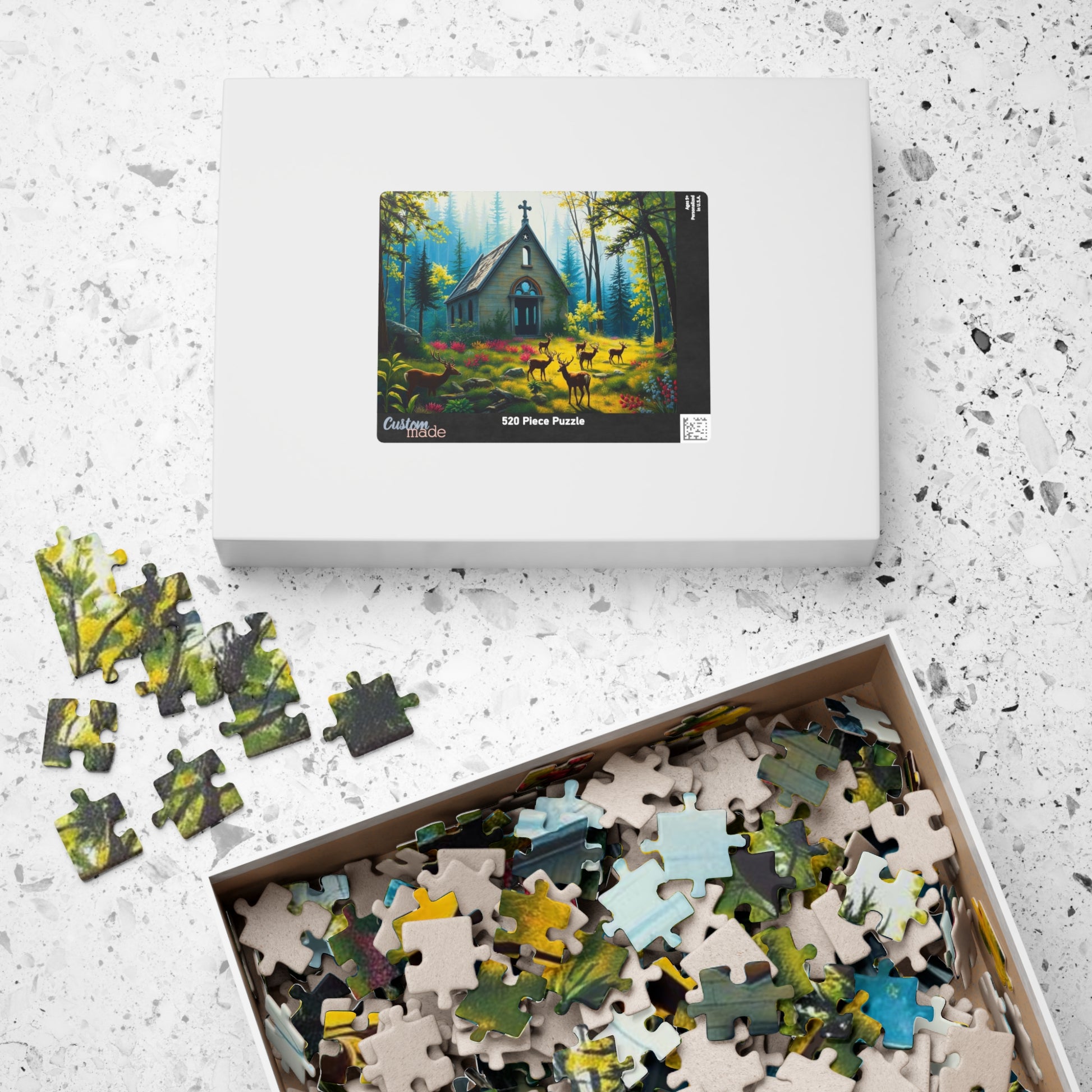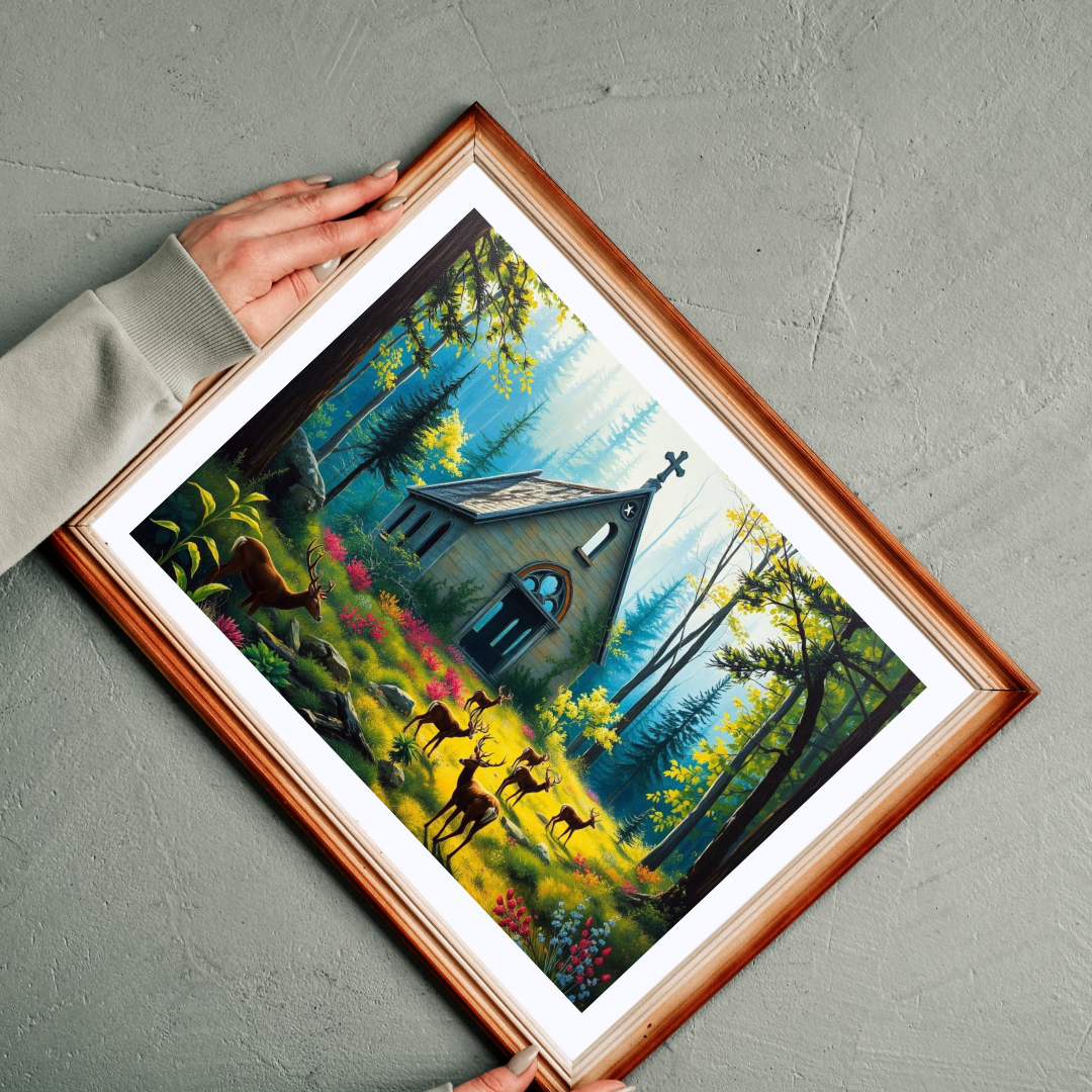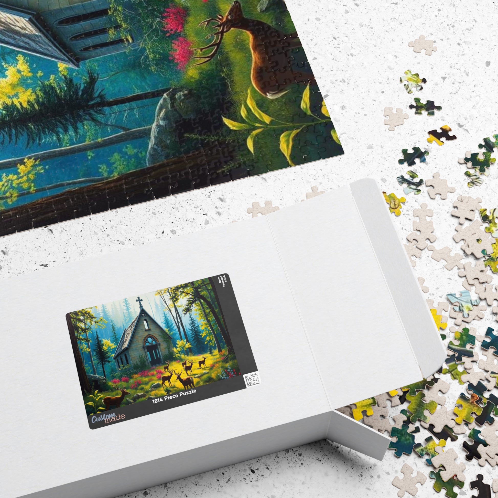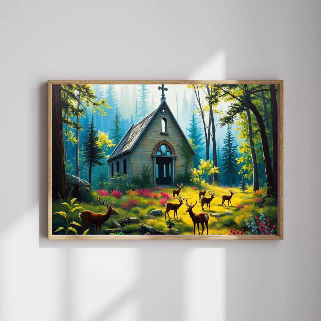 A gothic puzzle depicting a collapsed chapel in a forest, overgrown with plants with deer grazing peacefully. Perfect for those who enjoy challenging puzzles with a dark and mysterious theme. Ideal for quiet evenings or weekends, making a great gift for puzzle enthusiasts, nature lovers, or anyone who appreciates unique and intricate artwork. Relevant for Halloween, Christmas, or any time when a spooky and atmospheric puzzle is desired.