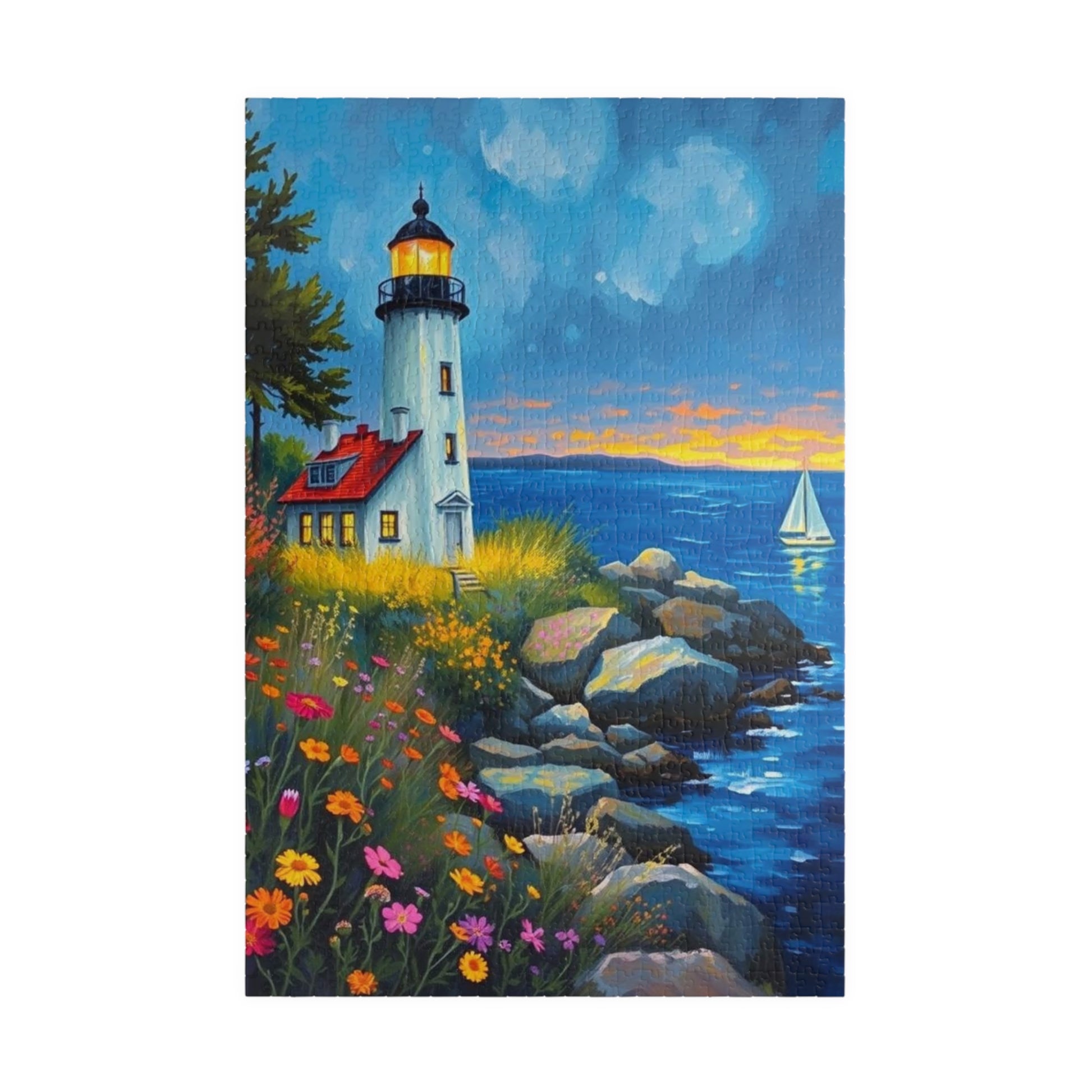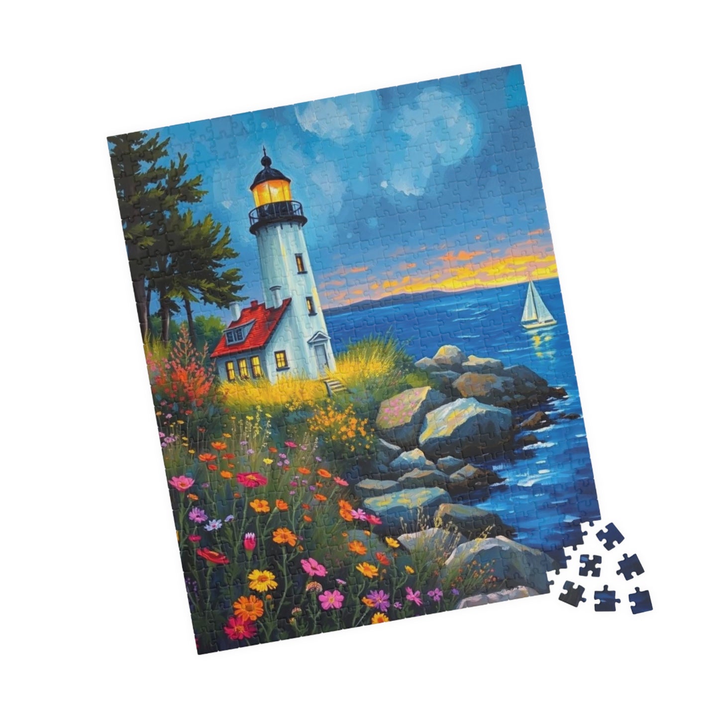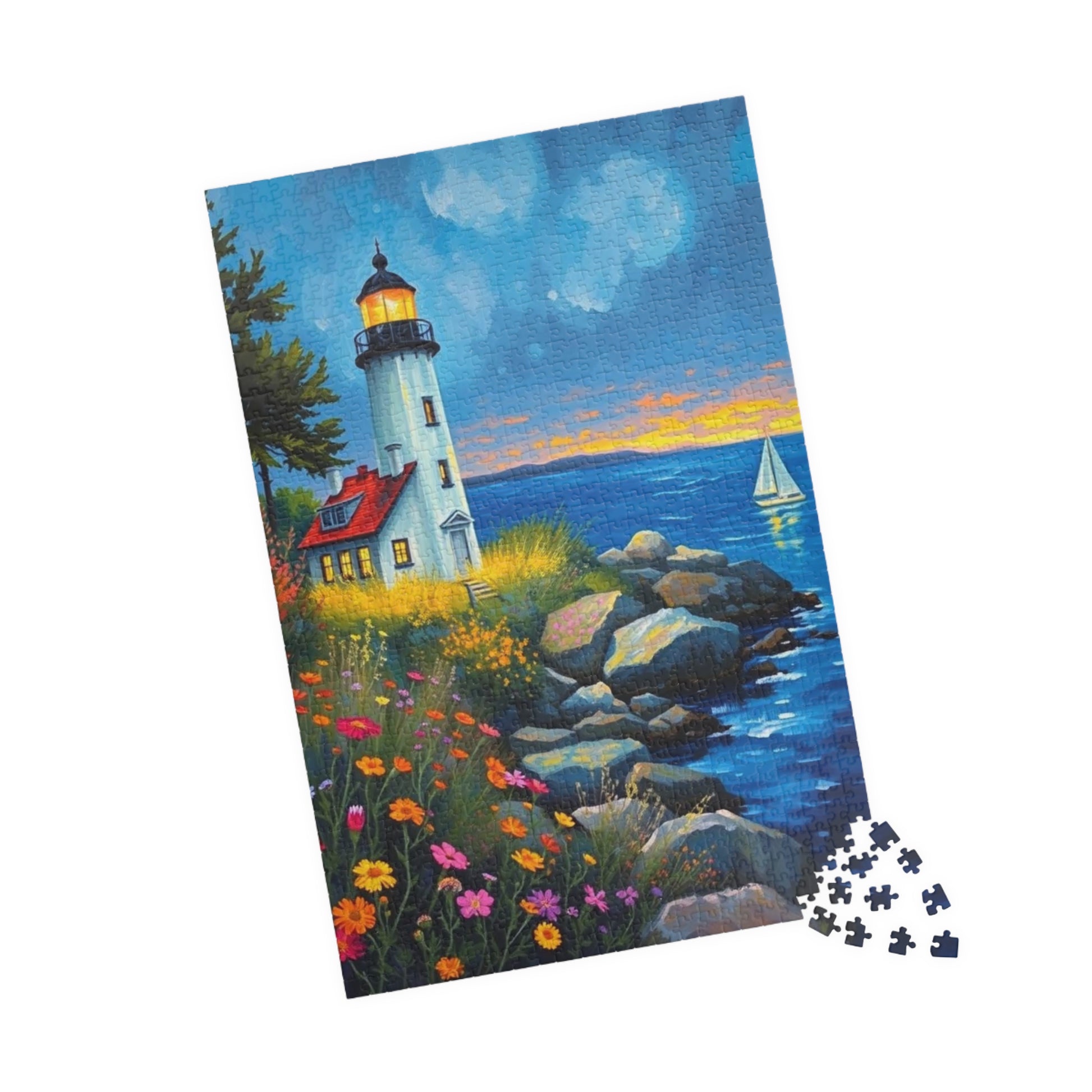 Seabreeze Beacon Jigsaw Puzzle - Coastal Lighthouse, Wildflowers and Sailboats, Family Activity Brain Teaser, Gift for Puzzle Lovers