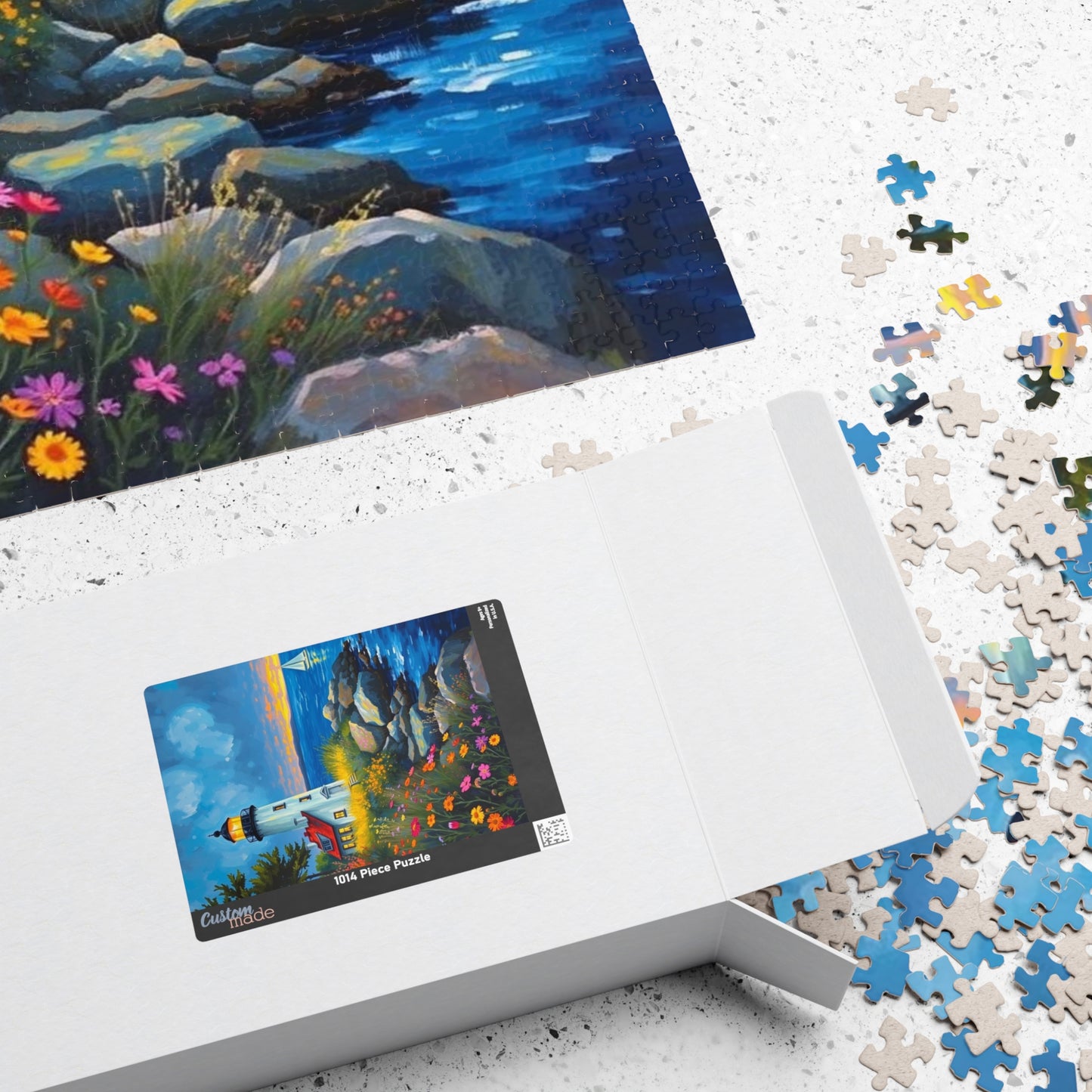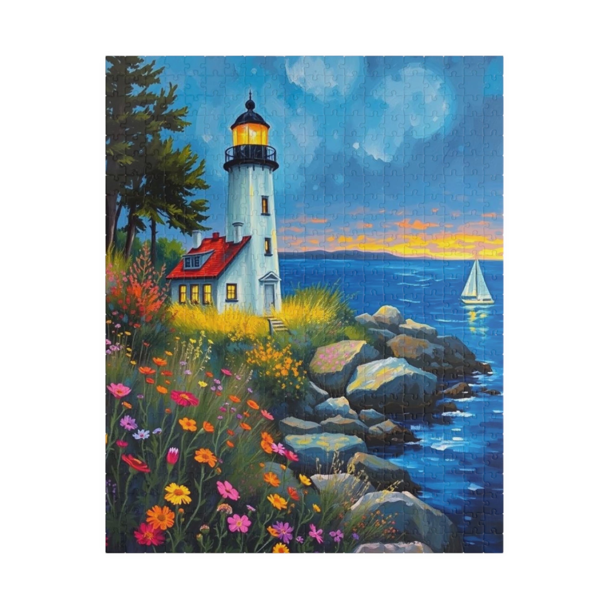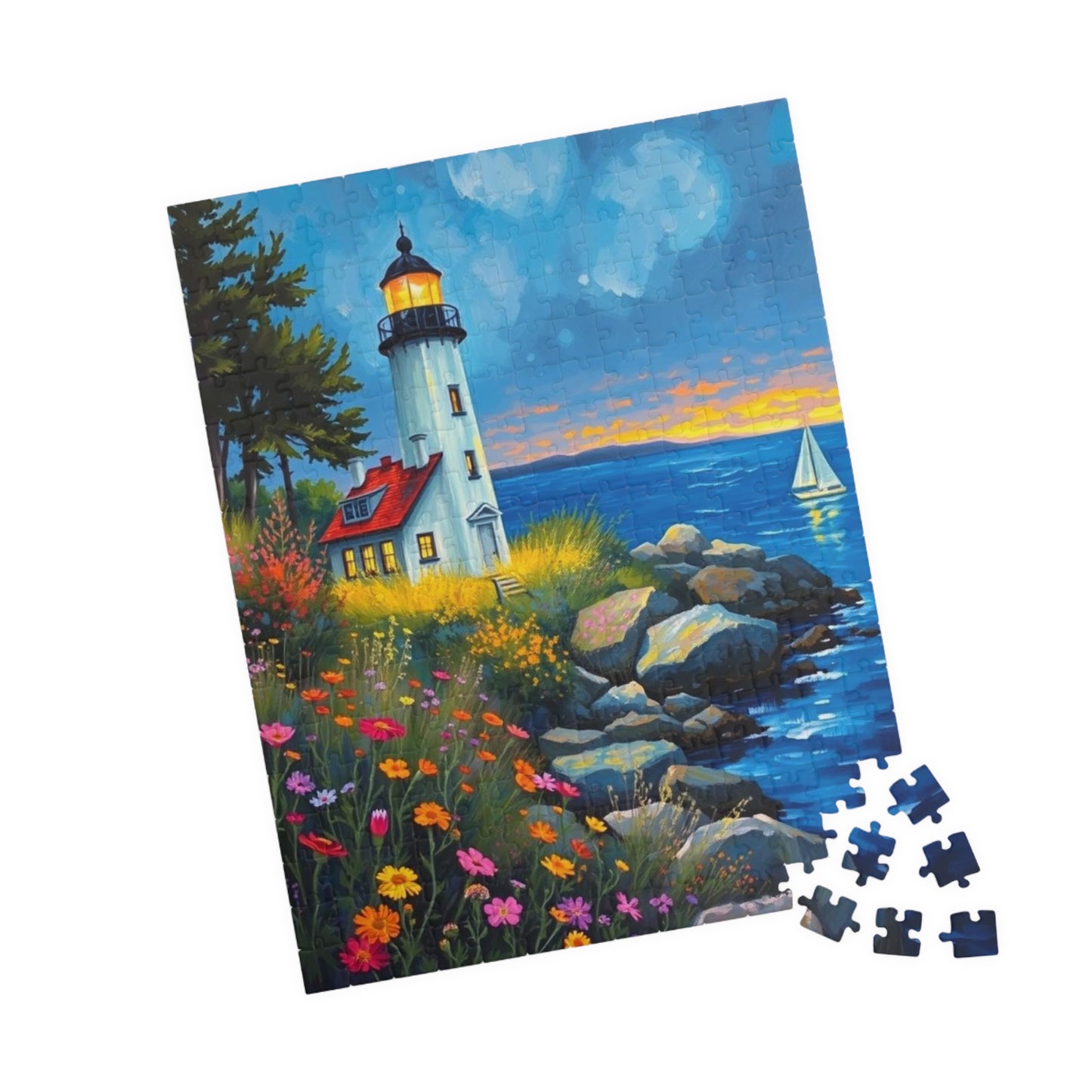 Seabreeze Beacon Jigsaw Puzzle - Coastal Lighthouse, Wildflowers and Sailboats, Family Activity Brain Teaser, Gift for Puzzle Lovers