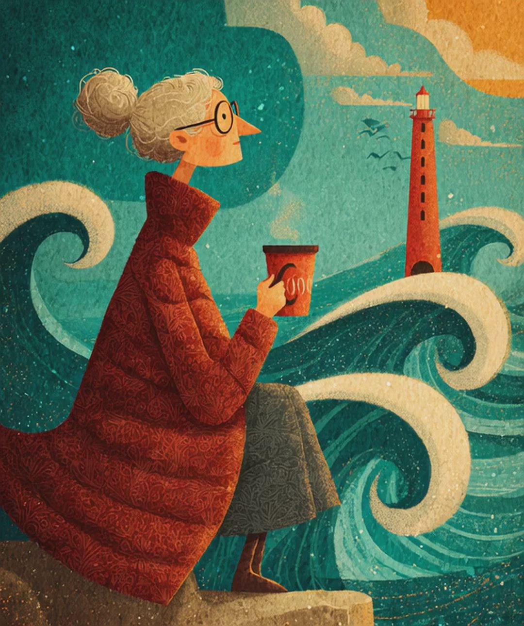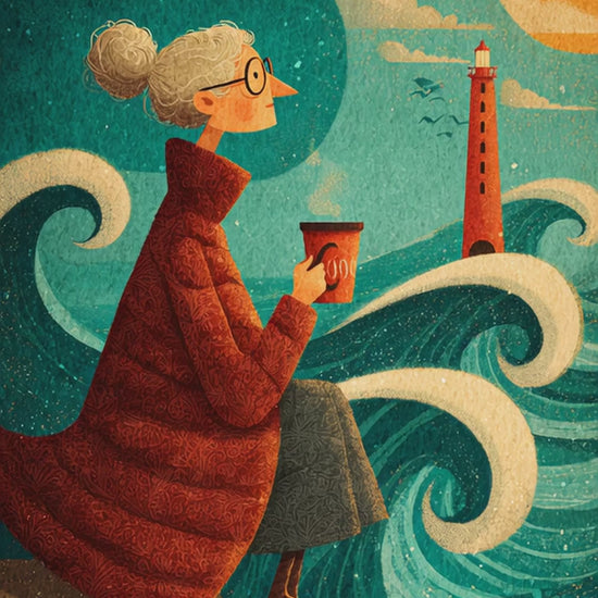 Seaside Grandma Jigsaw Puzzle - Heartwarming Ocean Cliff Storybook Scene Featuring Elderly Lady and Red Lighthouse