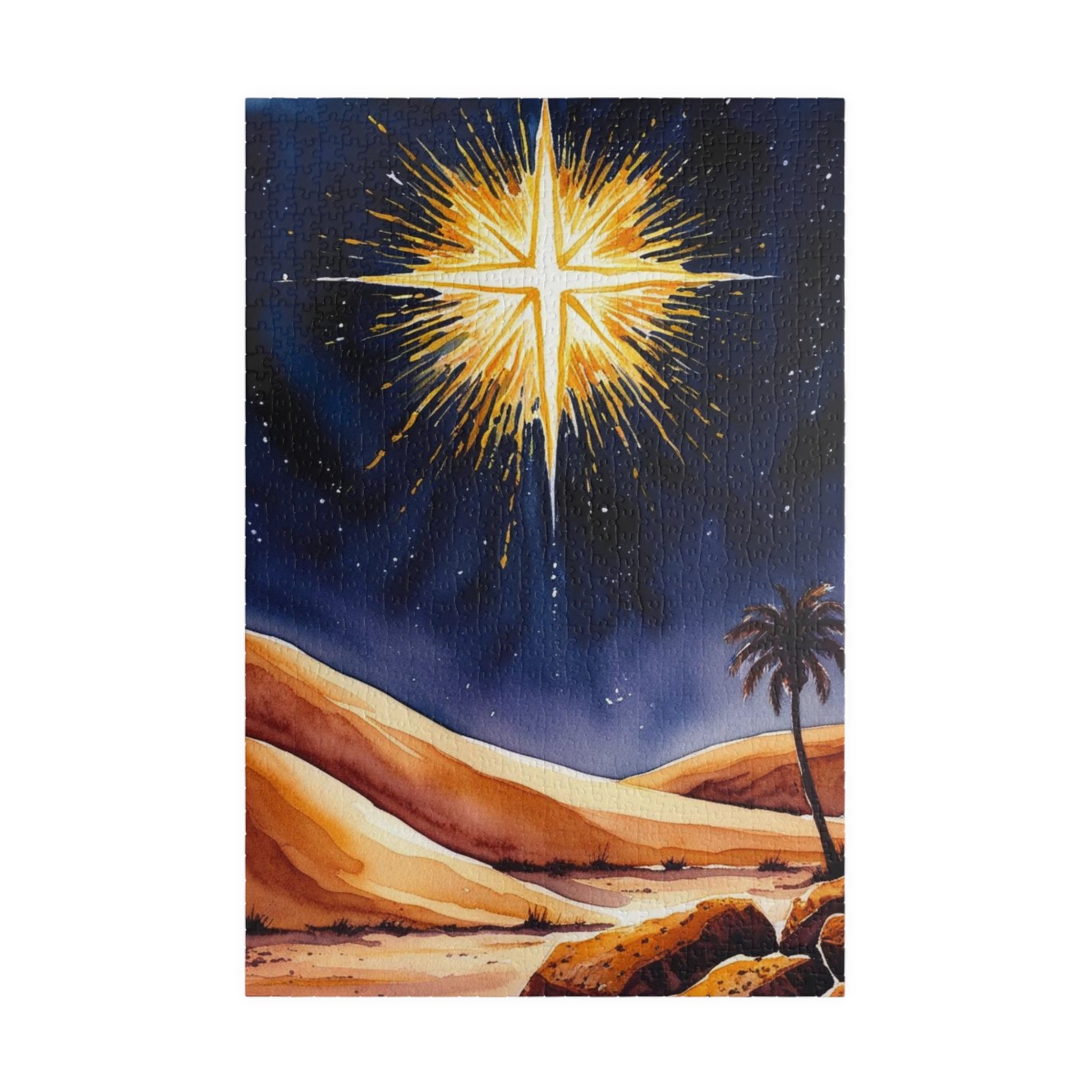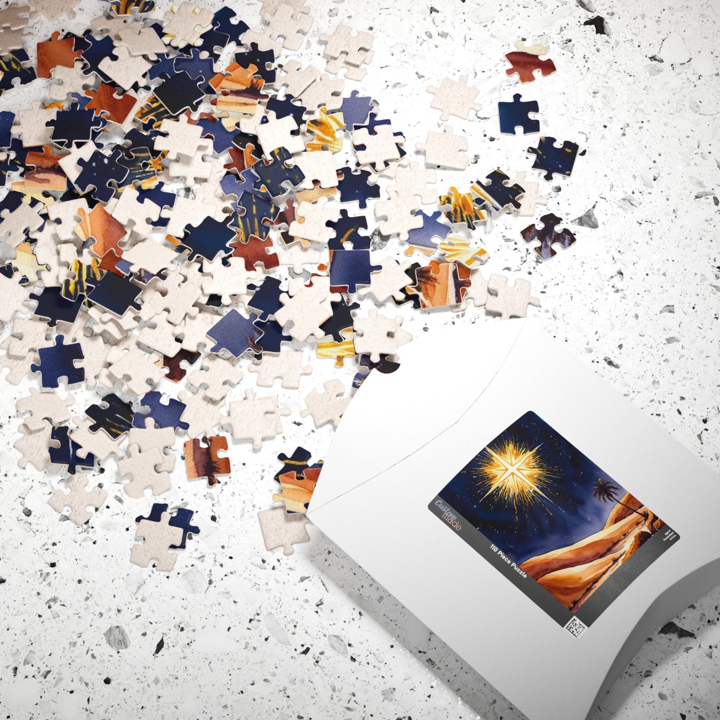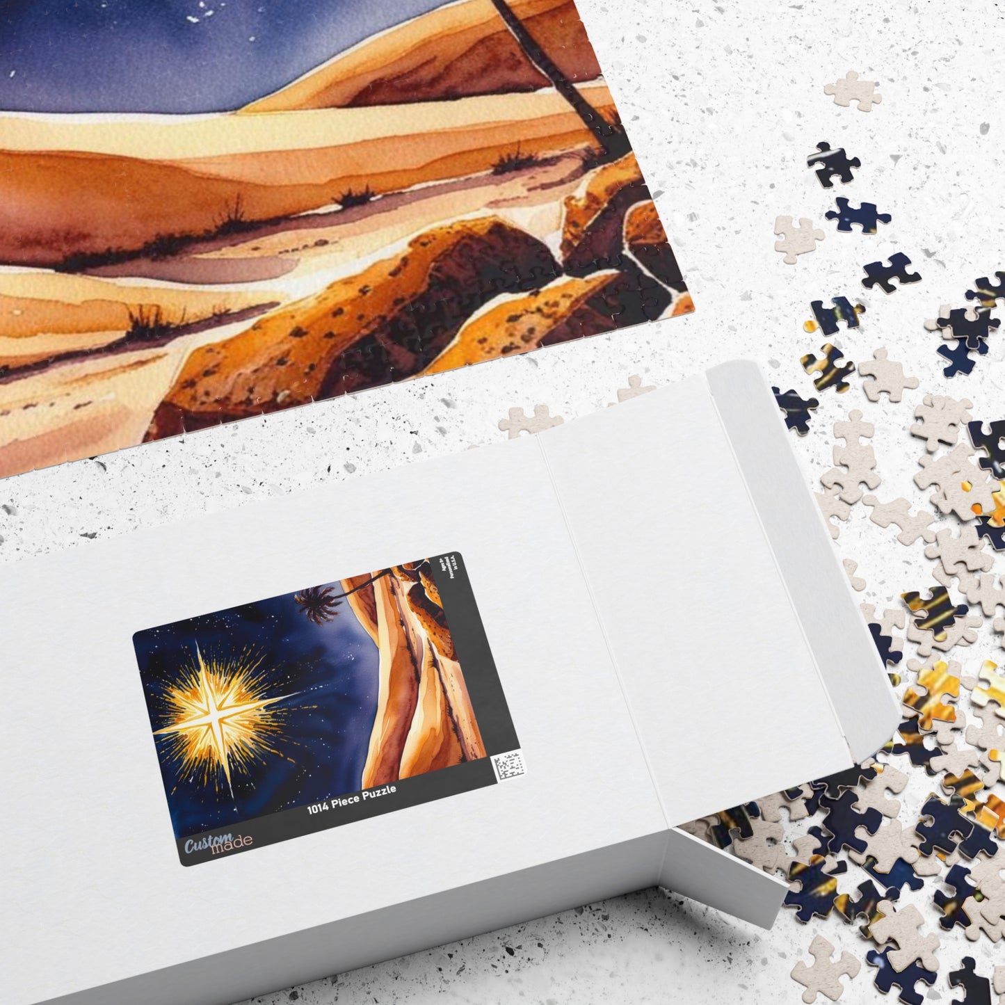 Discover the serene beauty of a starry desert night with this captivating puzzle. A glowing star shines brightly in a deep blue sky, casting its golden light over a peaceful, rocky desert landscape. The silhouette of a single palm tree stands tall against the gentle hills, creating a tranquil scene perfect for puzzle lovers seeking both challenge and relaxation. Let the calm atmosphere of this puzzle transport you to a quiet desert night, where each piece brings you closer to completing a stunning, star-lit masterpiece.