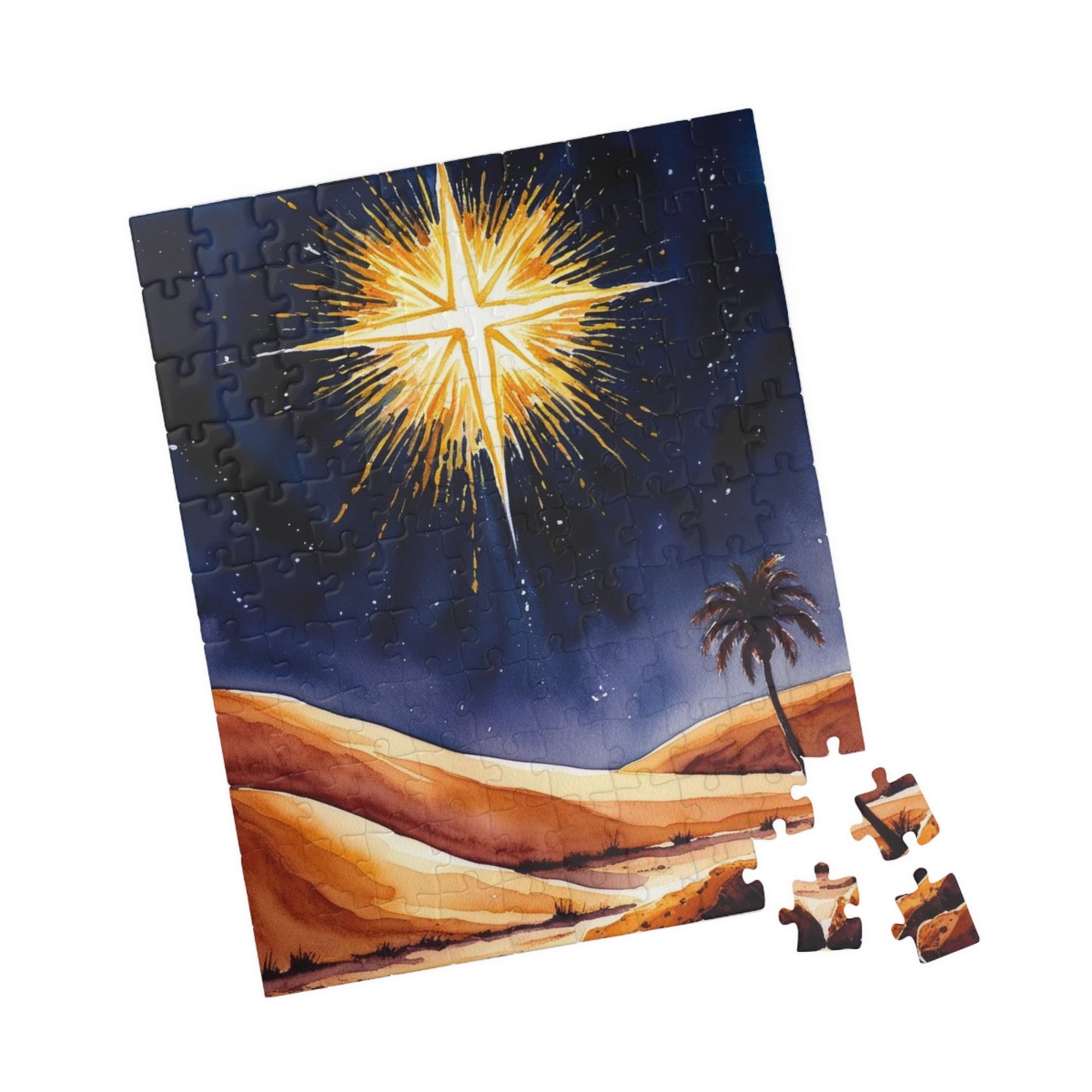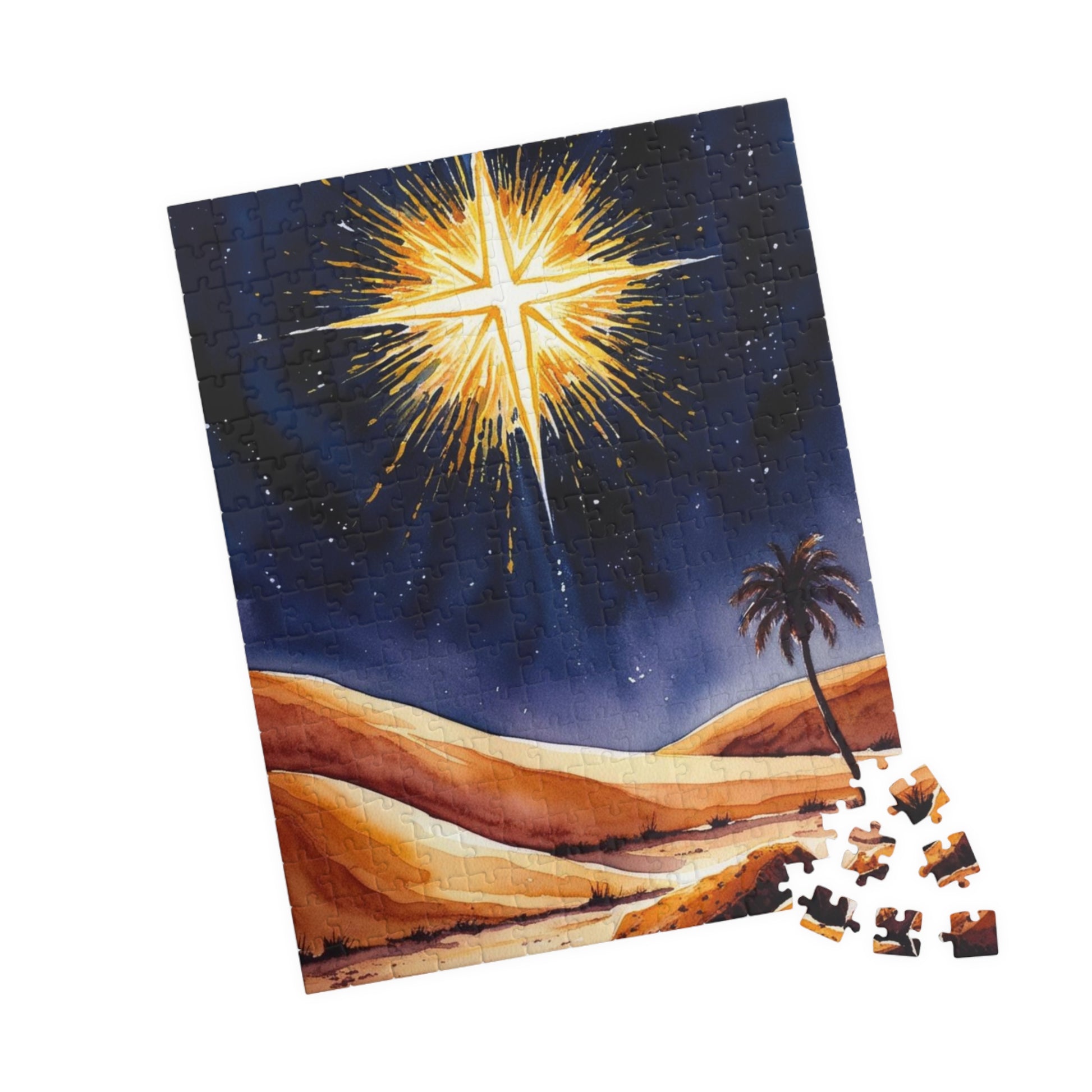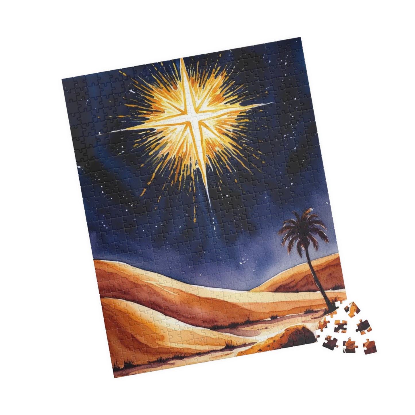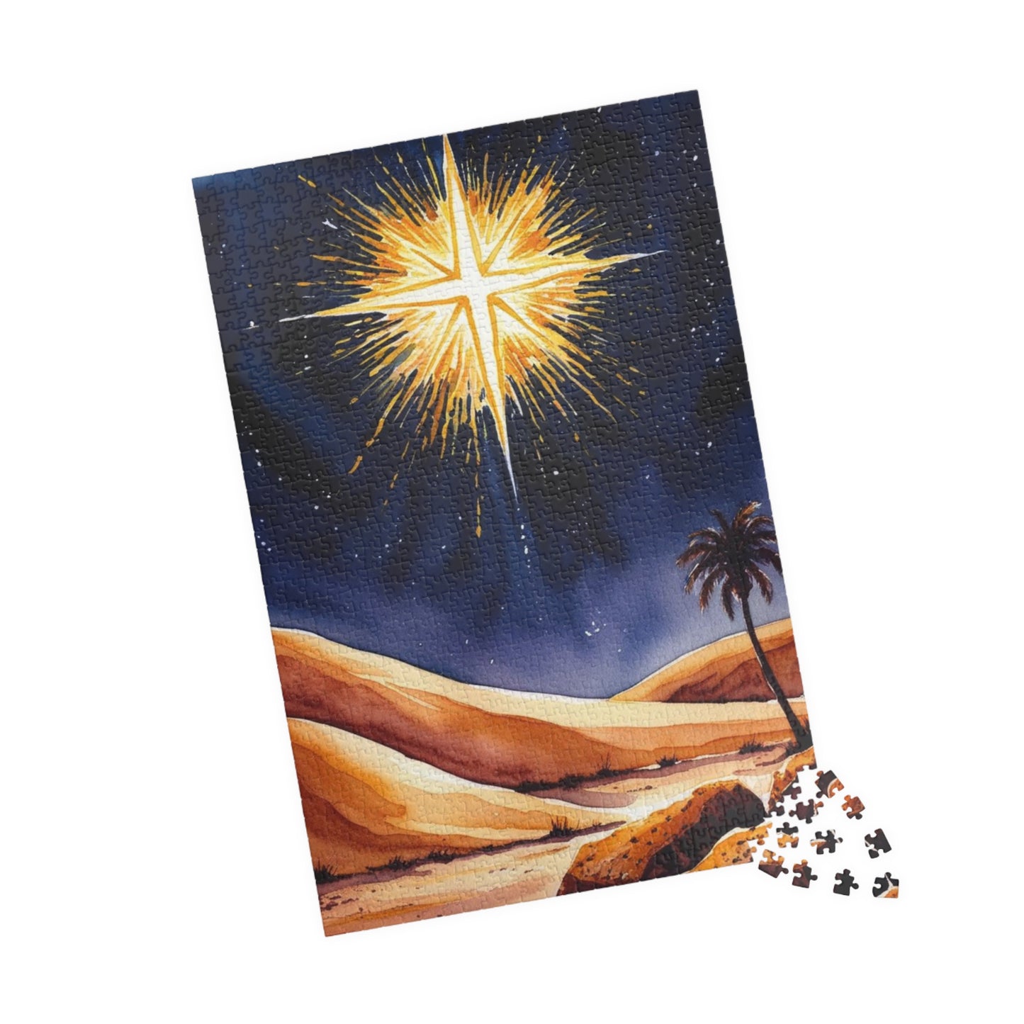 Discover the serene beauty of a starry desert night with this captivating puzzle. A glowing star shines brightly in a deep blue sky, casting its golden light over a peaceful, rocky desert landscape. The silhouette of a single palm tree stands tall against the gentle hills, creating a tranquil scene perfect for puzzle lovers seeking both challenge and relaxation. Let the calm atmosphere of this puzzle transport you to a quiet desert night, where each piece brings you closer to completing a stunning, star-lit masterpiece.