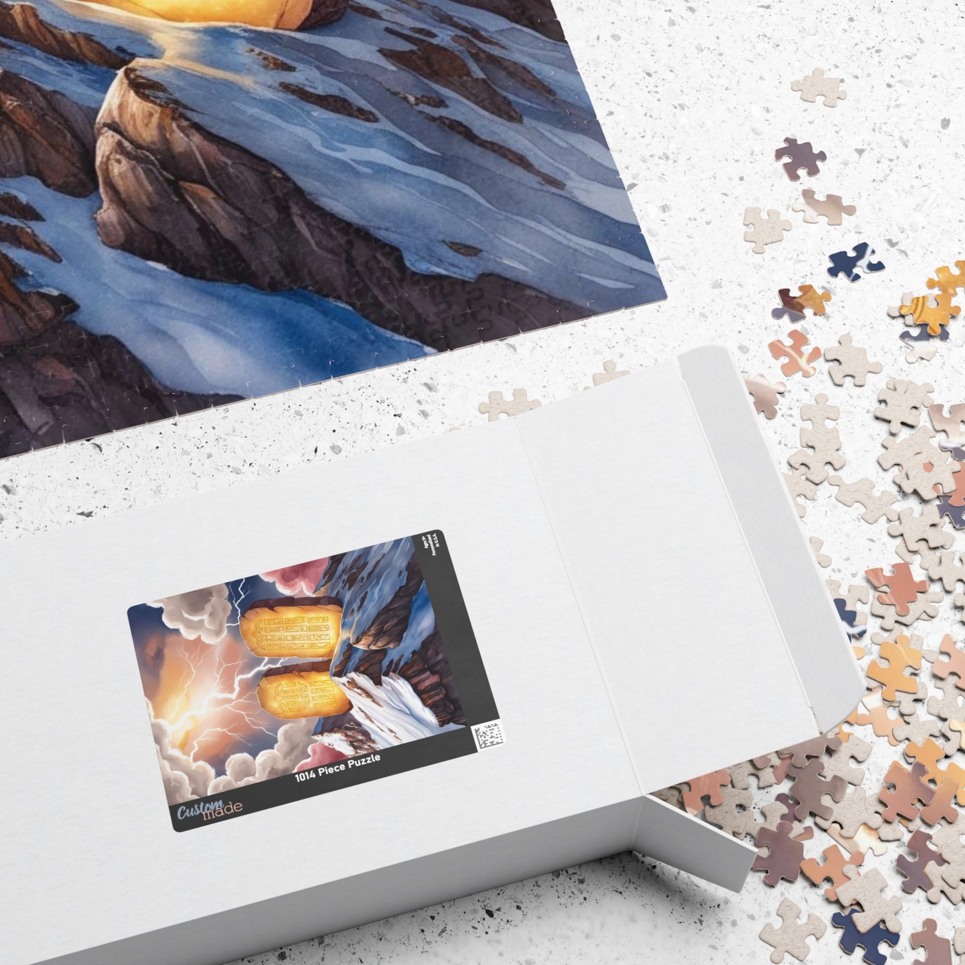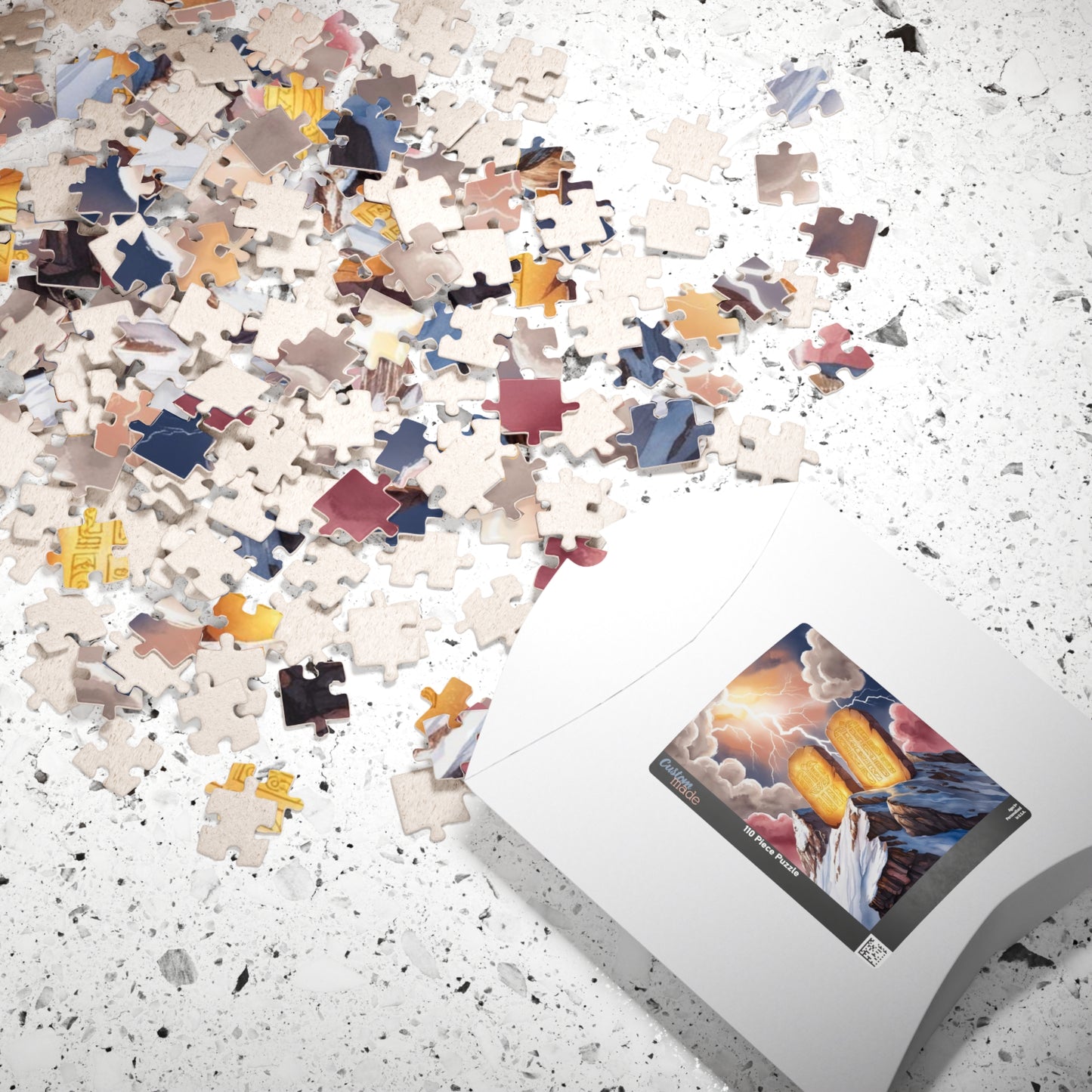 Experience a powerful and awe-inspiring journey with this beautifully crafted puzzle. Featuring two stone tablets representing the Ten Commandments on Mount Sinai, bathed in divine light, this stunning image captures the moment of revelation on a rugged mountain peak. Surrounded by swirling clouds and dramatic bolts of lightning, this puzzle transports you to a sacred and mystical scene, offering both a challenging assembly and a deeply moving visual experience. Perfect for puzzle enthusiasts and those with an appreciation for history, spirituality, and breathtaking imagery.