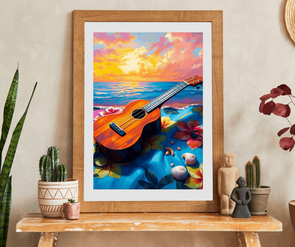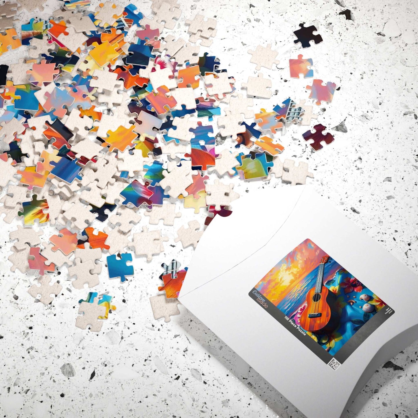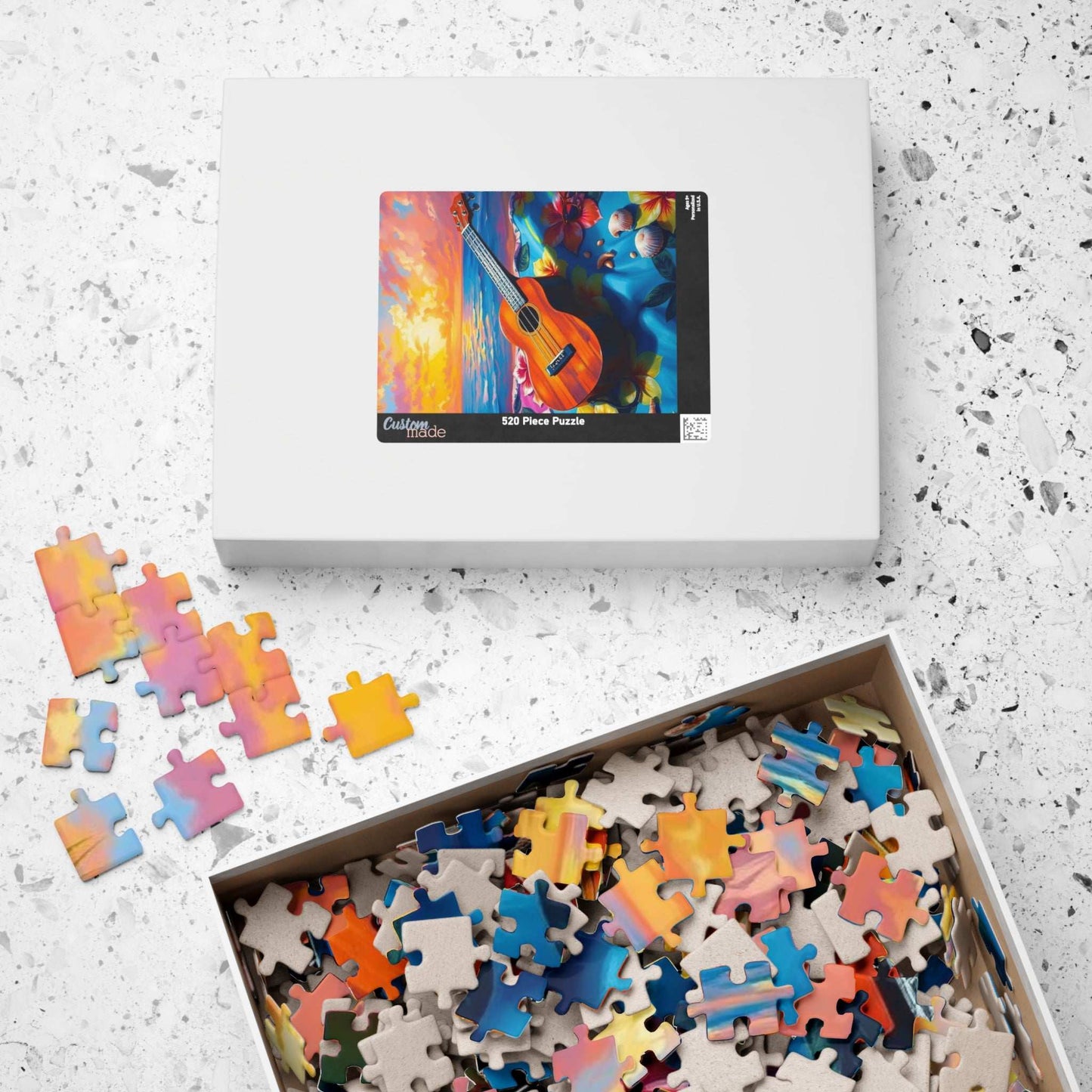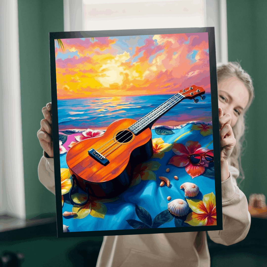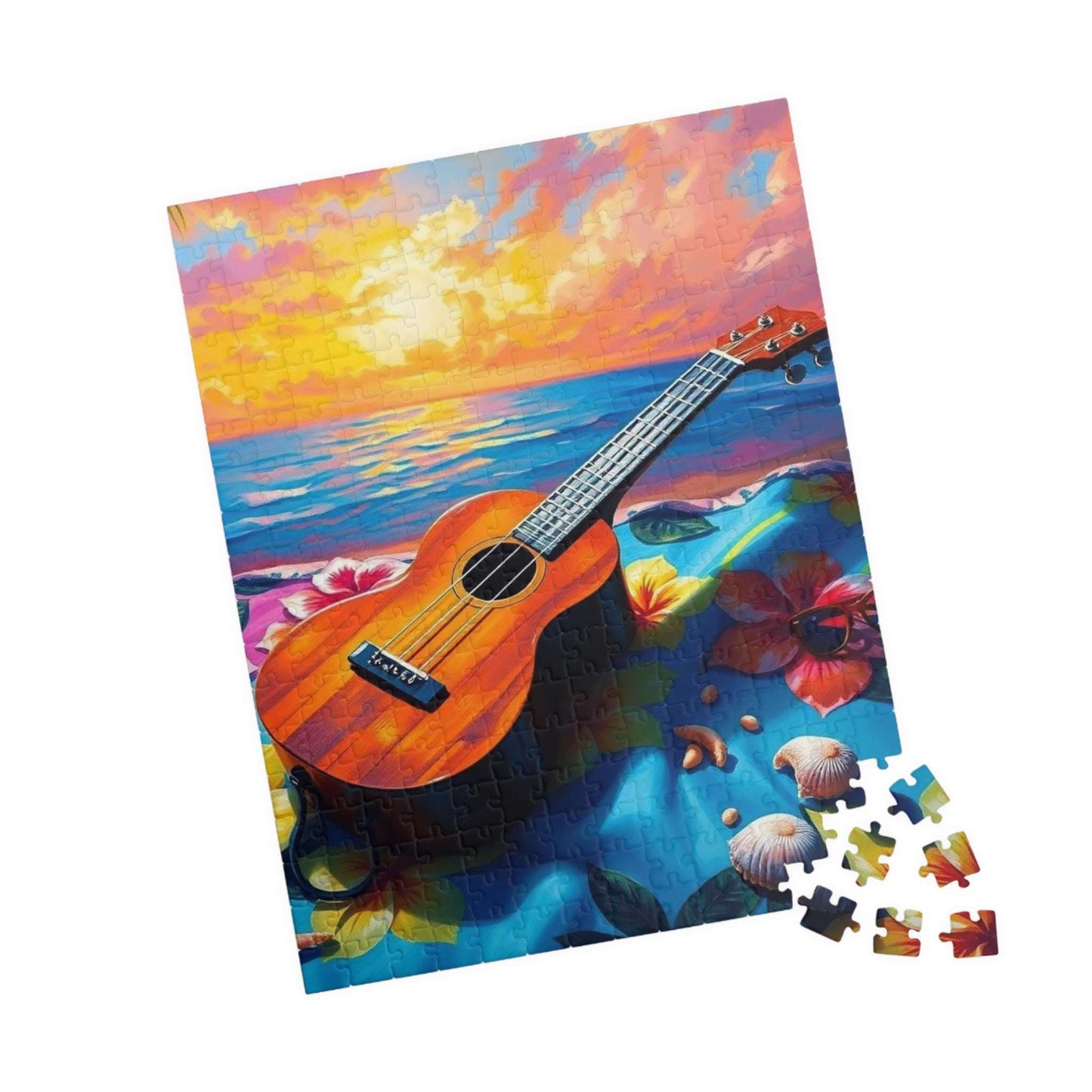 A vibrant and colorful puzzle featuring a ukulele on a hibiscus-decorated beach towel with seashells and sunglasses. Perfect for leisurely evenings at home or as a fun activity during a beach vacation. Ideal for puzzle enthusiasts and beach lovers alike. Great for gifting during summer birthdays or as a relaxing holiday activity.