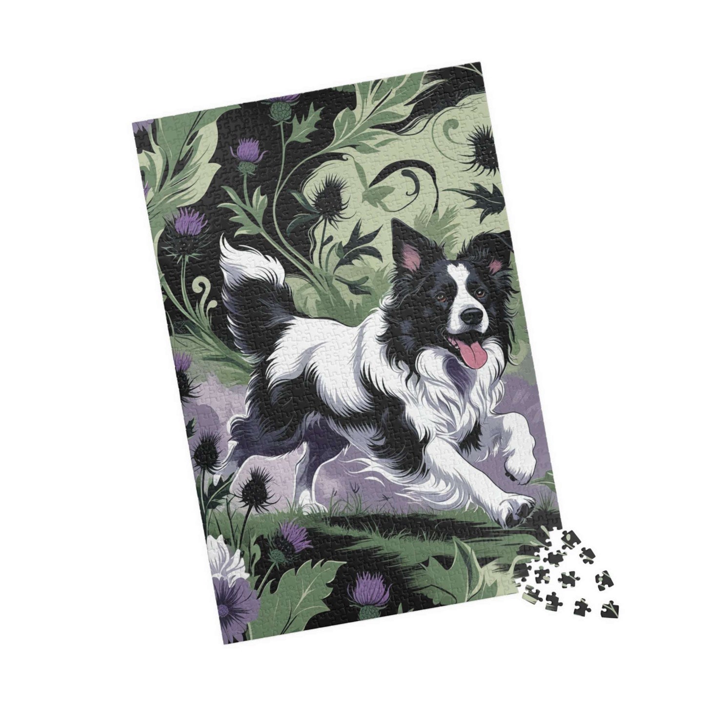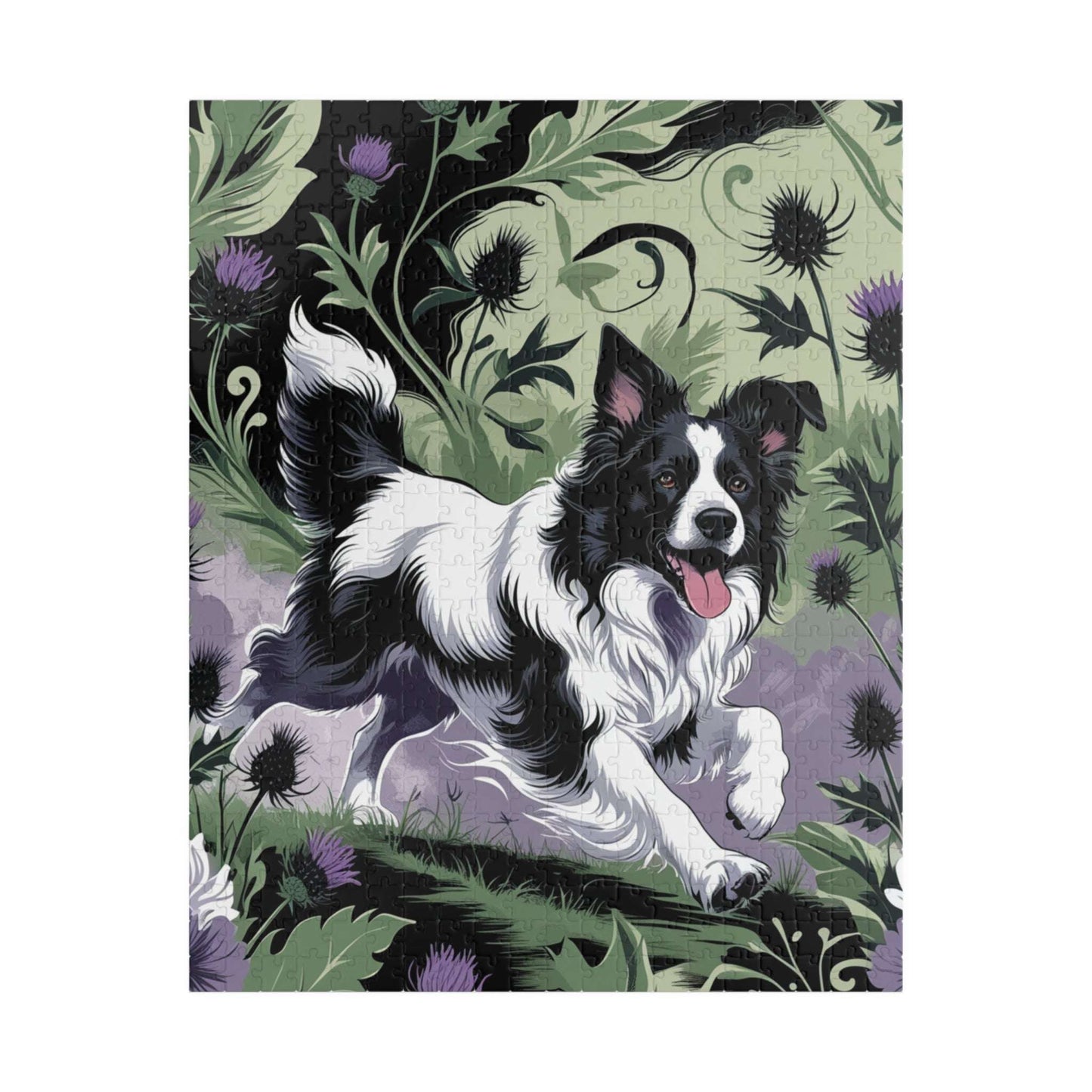 Discover the perfect blend of energy and elegance with this William Morris-inspired jigsaw puzzle. Featuring a lively Border Collie in motion, surrounded by swirling leaves, thistles, and delicate meadow flowers, this design captures the beauty of nature in a dynamic yet vintage style. The palette of black, white, soft greens, and muted purples brings together both bold energy and sophisticated charm. Ideal for puzzle enthusiasts and nature lovers alike, this puzzle offers a unique and immersive experience that challenges the mind while showcasing timeless artistry.