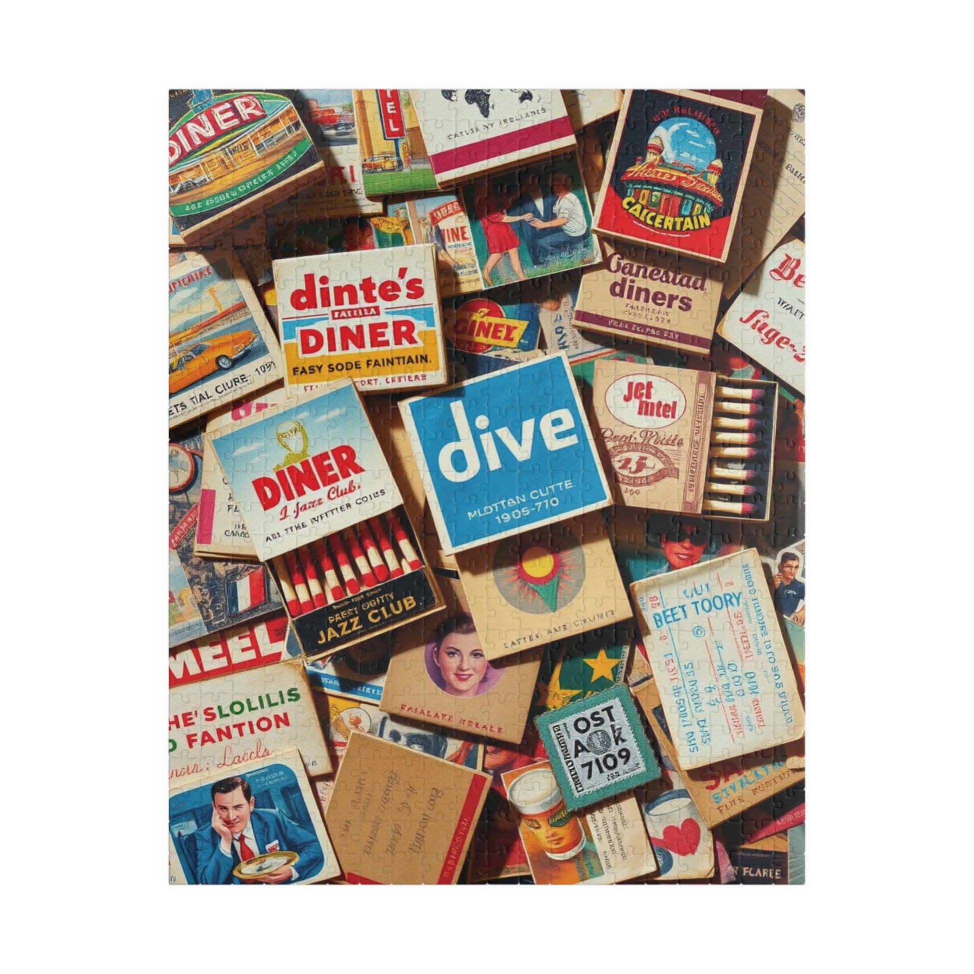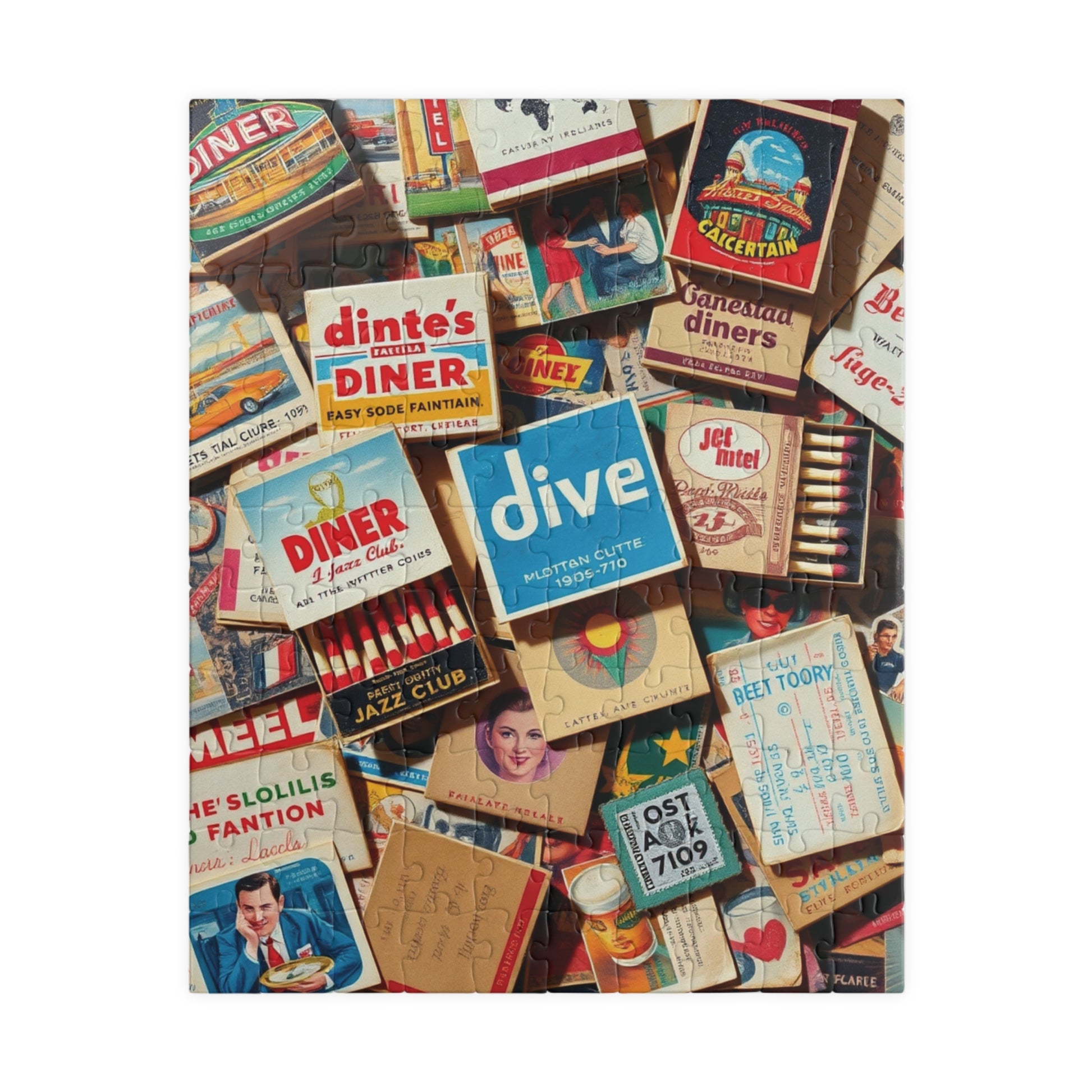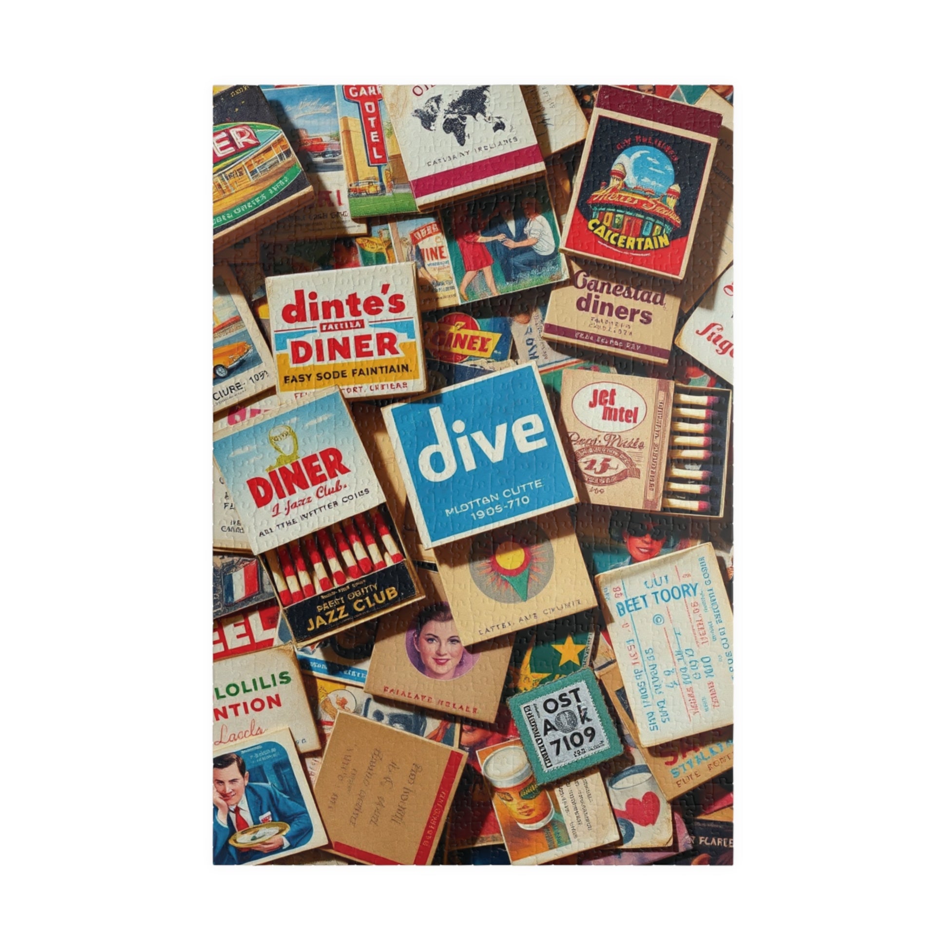 Vintage Matchbook Collage Jigsaw Puzzle, Retro Americana Memorabilia, Old Matchboxes Postcards and Receipts, Mid-Century Diner Motel Designs