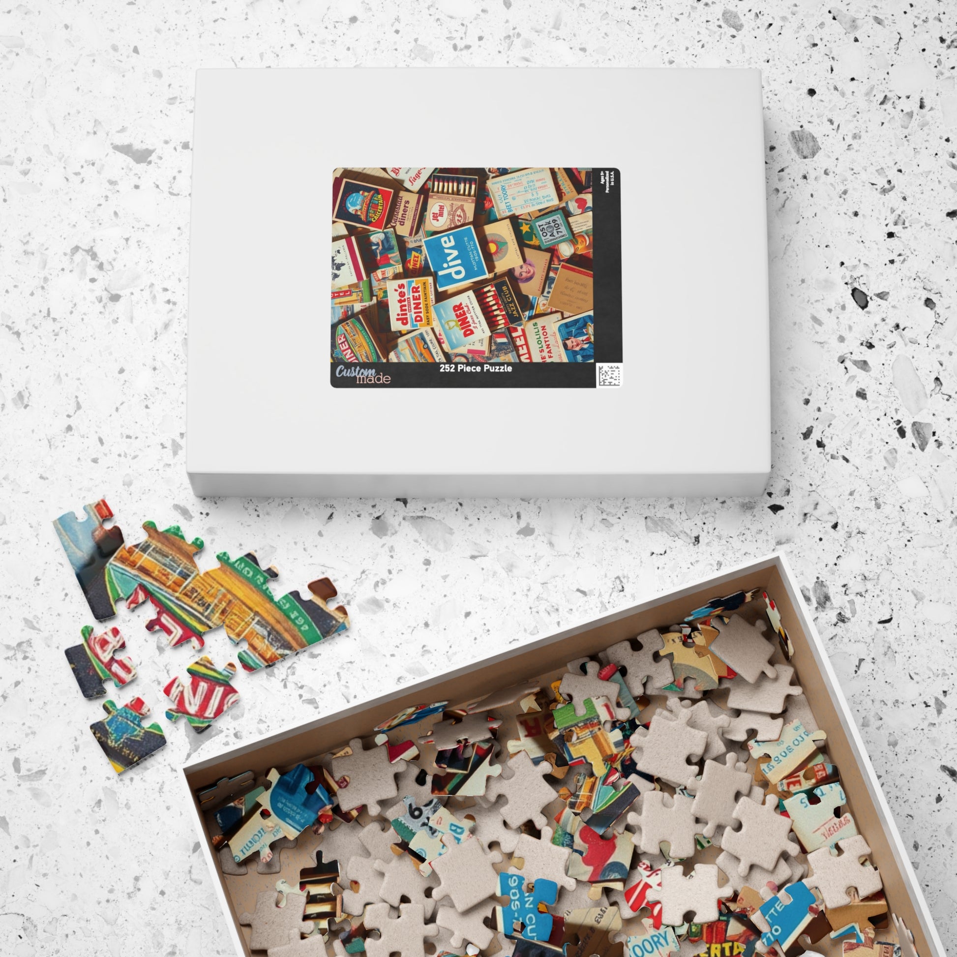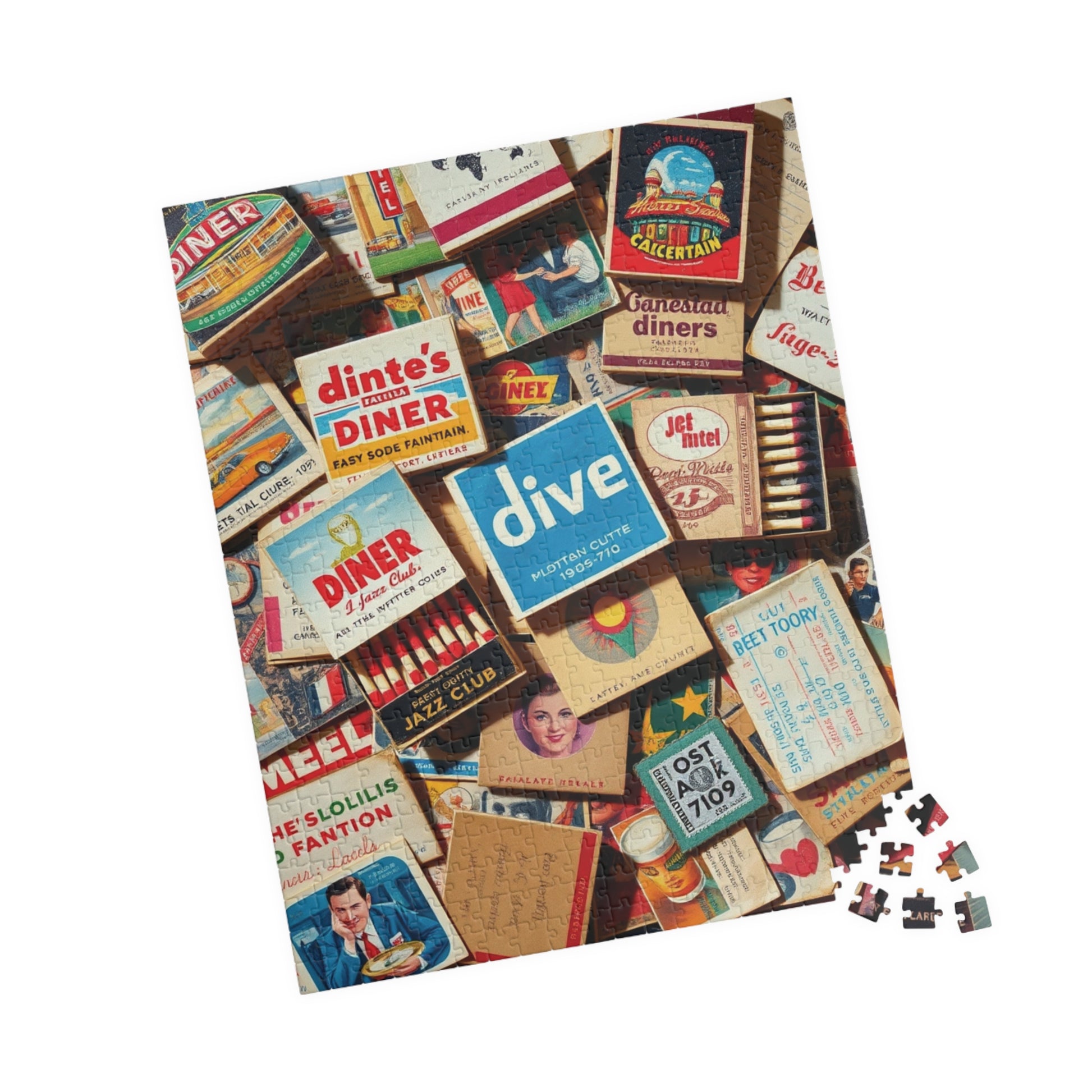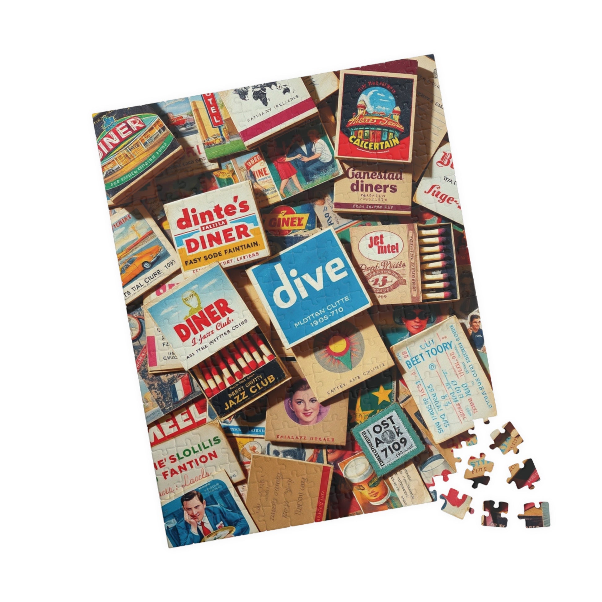 Vintage Matchbook Collage Jigsaw Puzzle, Retro Americana Memorabilia, Old Matchboxes Postcards and Receipts, Mid-Century Diner Motel Designs