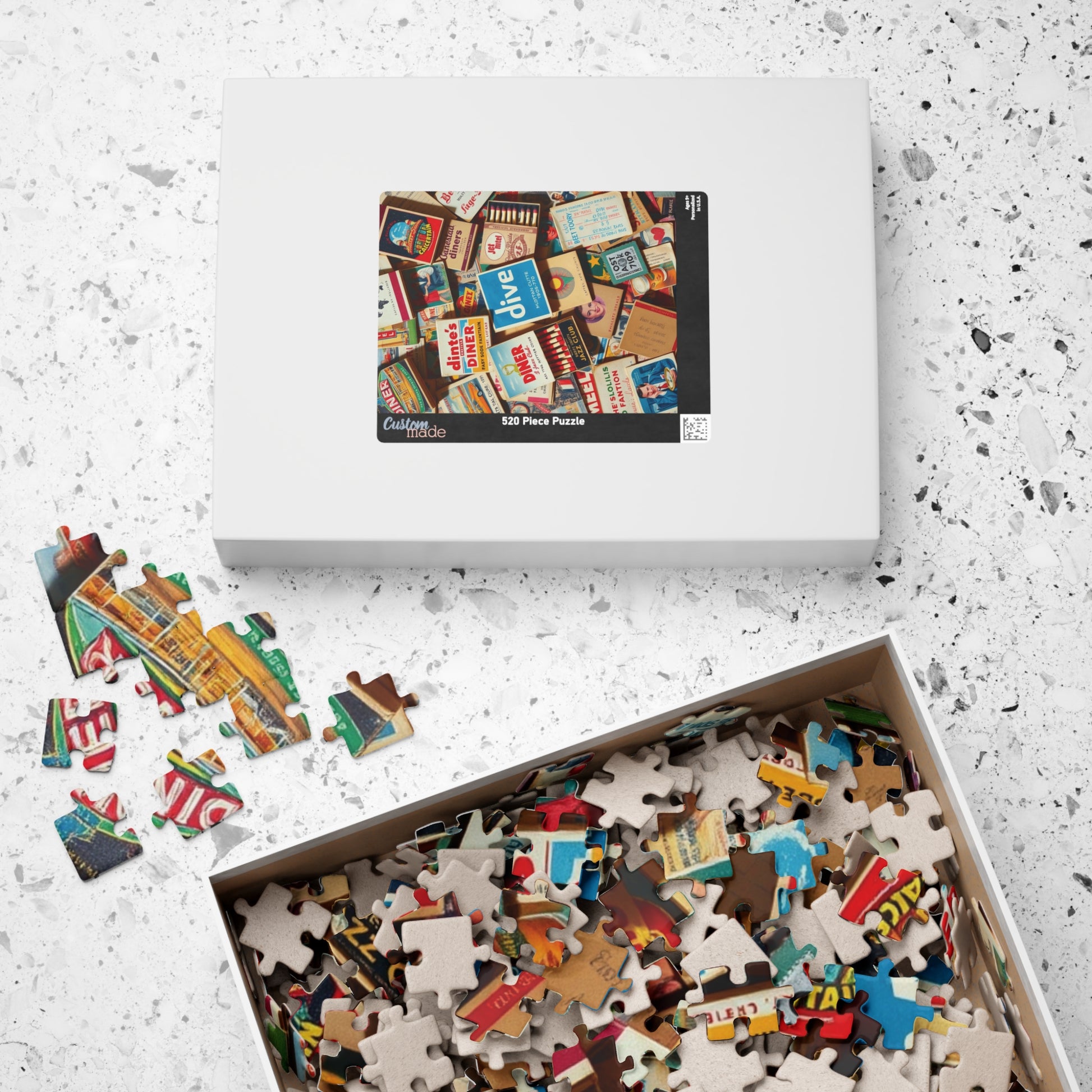Step into a world of nostalgia and vintage charm with this visually striking puzzle featuring a vibrant collage of overlapping matchbooks from the 1940s to the 1970s. Each piece uncovers a piece of history—colorful designs from old diners, motels, jazz clubs, and soda fountains transport you to the golden age of roadside Americana. Some matchbooks are open, revealing classic red-tipped matches, while others display worn edges and faded creases, adding to their retro authenticity. Scattered among them are retro postcards, old drink coasters, and crumpled receipts from long-forgotten road trips, painting a picture of adventure, late-night stops, and classic American culture. Whether you're a lover of vintage ephemera, a puzzle enthusiast, or someone who appreciates the charm of mid-century design, this puzzle offers a relaxing yet rewarding challenge that captures the spirit of a bygone era.