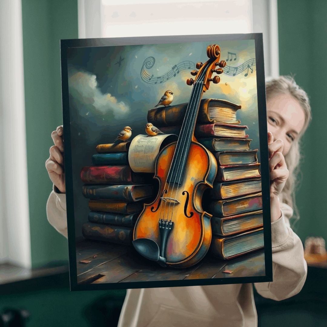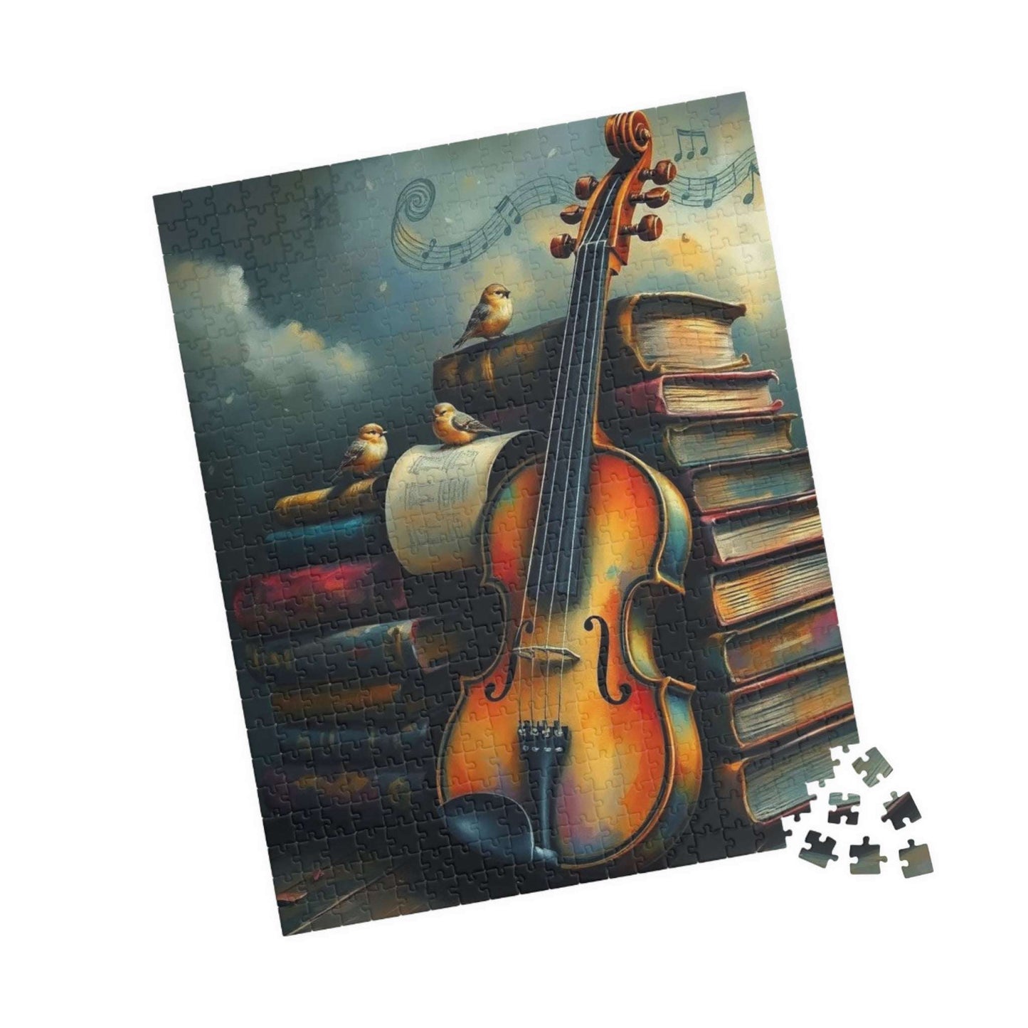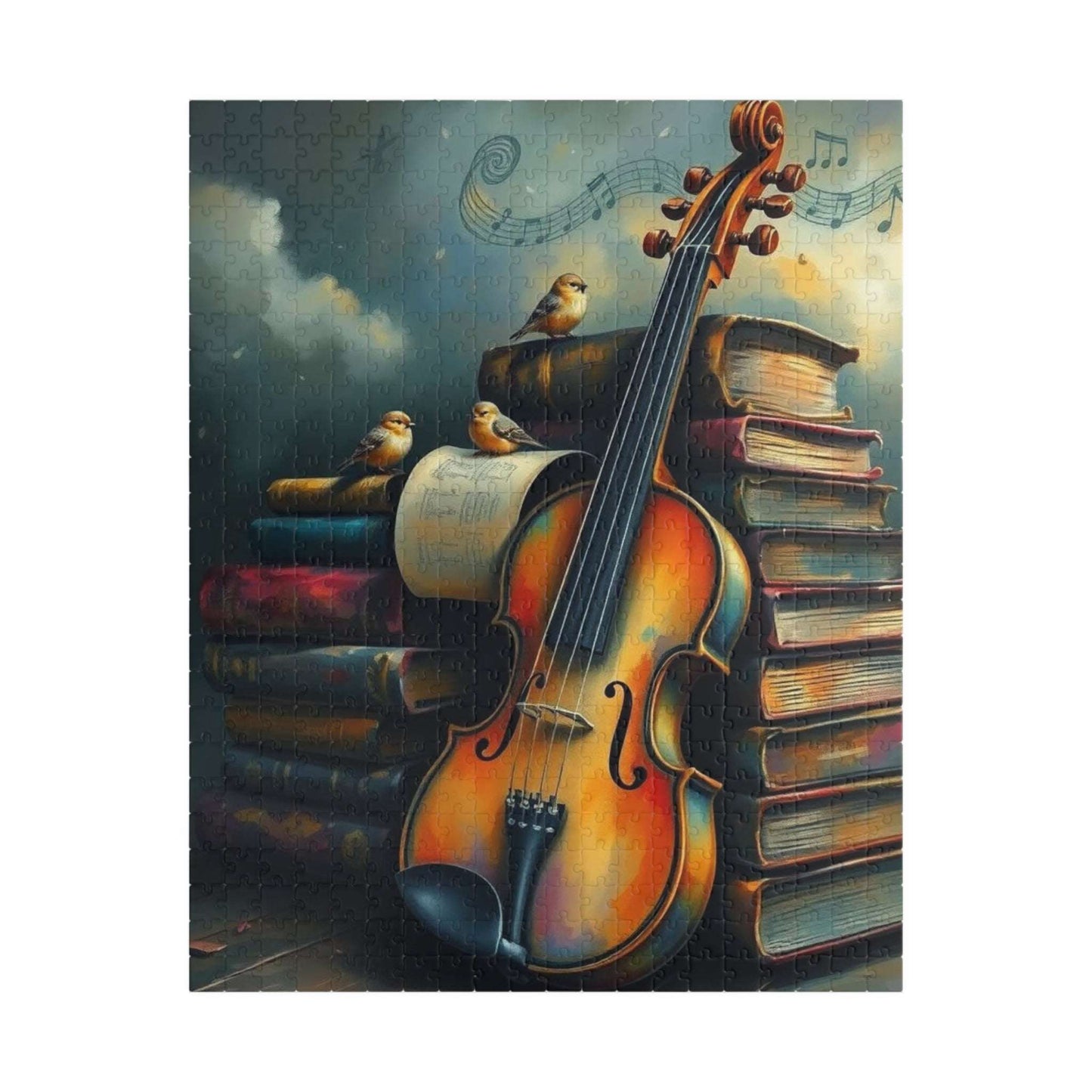 A beautiful puzzle featuring a violin leaning against a stack of old storybooks, with tiny birds and music notes creating a whimsical scene. Perfect for those who love music or enjoy a relaxing and creative activity. Ideal for gifting on birthdays, holidays, or any special occasion.