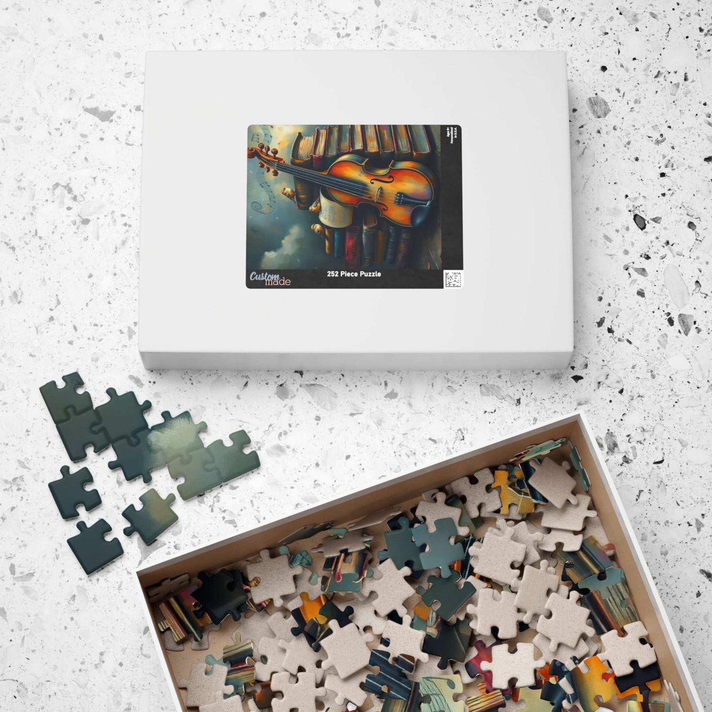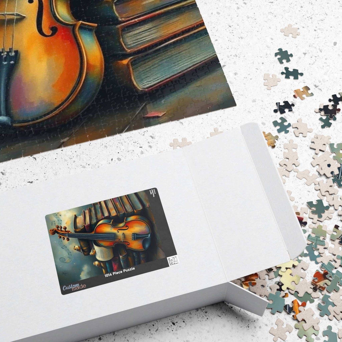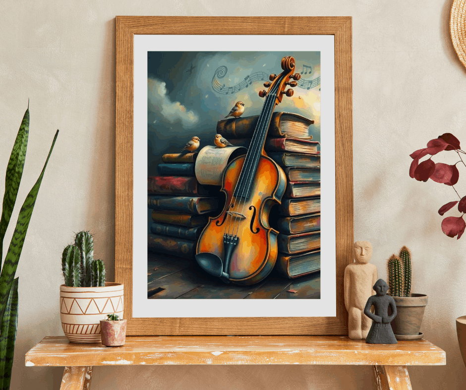 A beautiful puzzle featuring a violin leaning against a stack of old storybooks, with tiny birds and music notes creating a whimsical scene. Perfect for those who love music or enjoy a relaxing and creative activity. Ideal for gifting on birthdays, holidays, or any special occasion.
