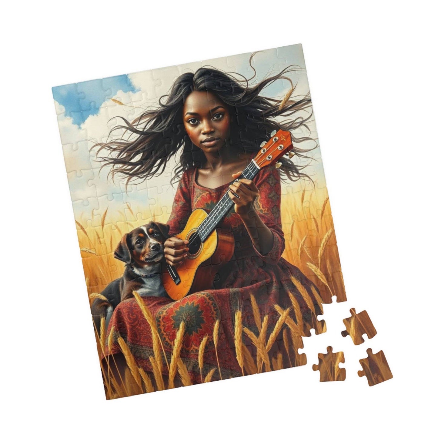A beautifully illustrated puzzle featuring a black woman in a golden wheat field with a vintage ukulele and a curious dog. Perfect for those who enjoy relaxing activities and art enthusiasts. Great for leisurely evenings or rainy days, ideal for gifting on birthdays, holidays, and special occasions.
