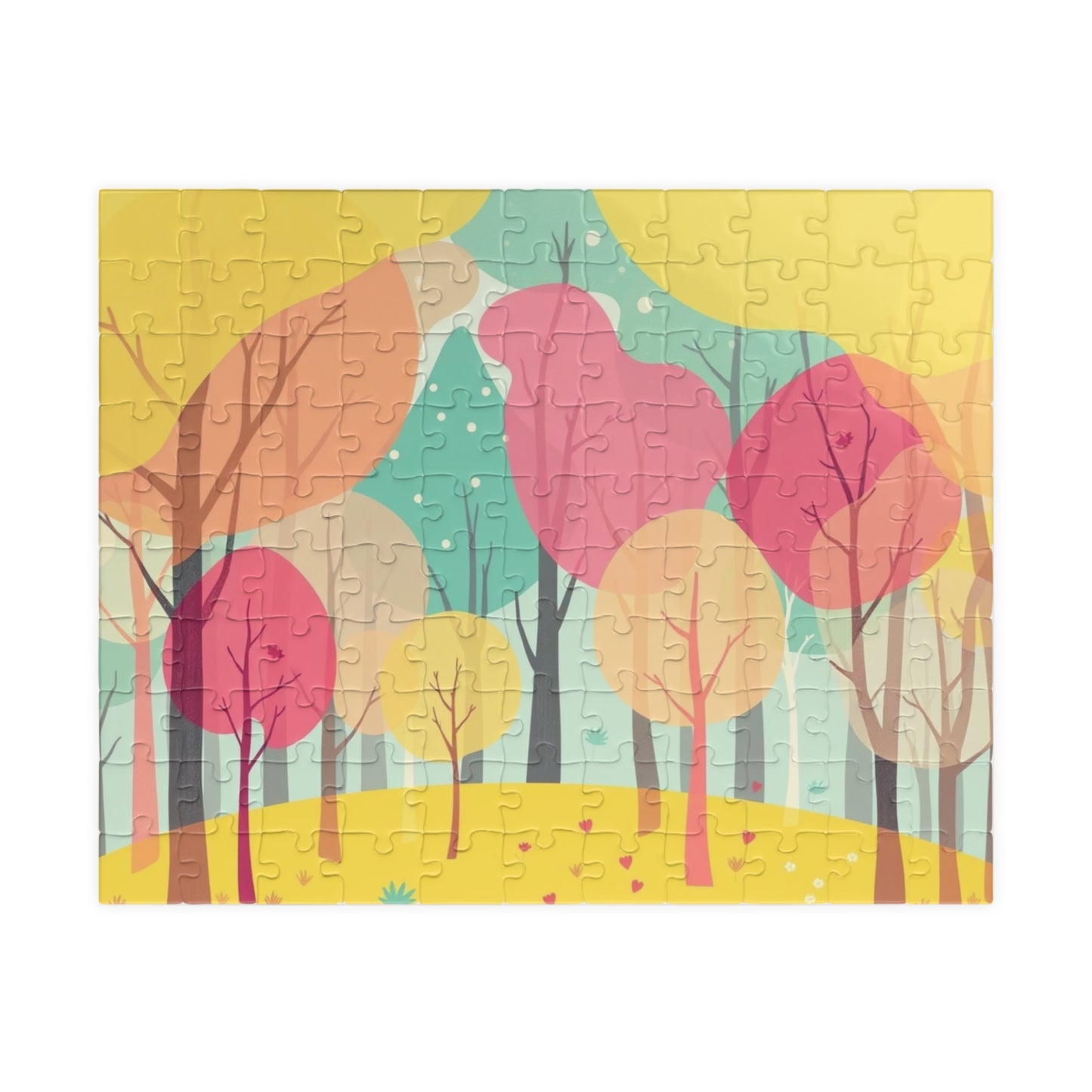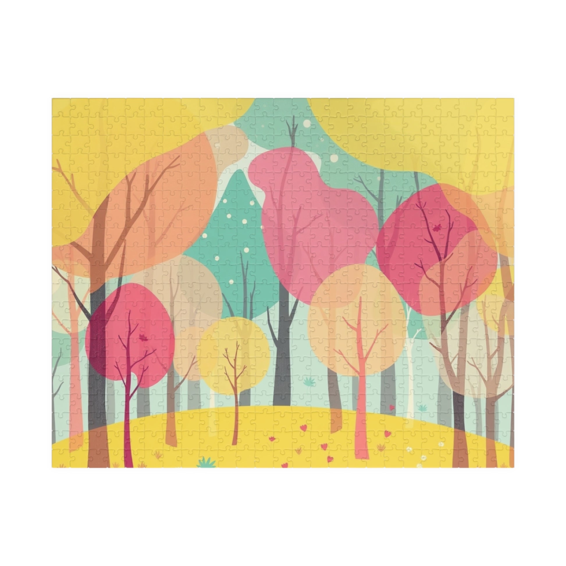 Step into a whimsical wonderland with this enchanting puzzle featuring a layered abstract forest. Translucent, overlapping trees in vibrant shades of yellow, teal, and magenta create a dreamy, colorful backdrop, while charming and cute details bring the scene to life. Perfect for puzzle enthusiasts who love playful designs, this puzzle offers a delightful journey through an adorable forest full of imagination and joy!