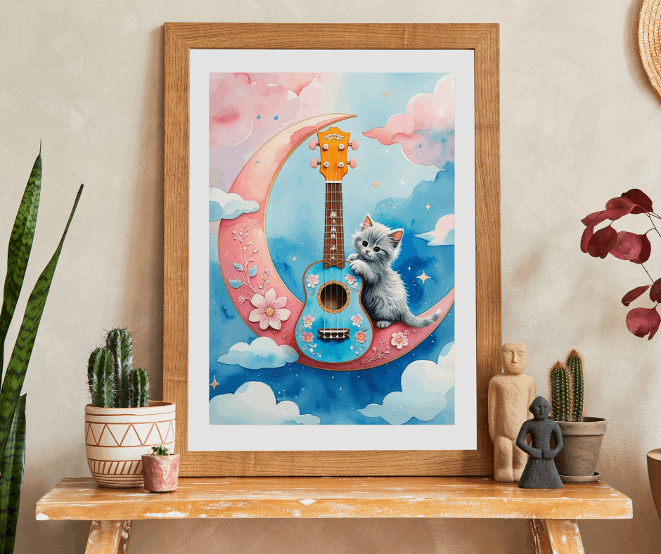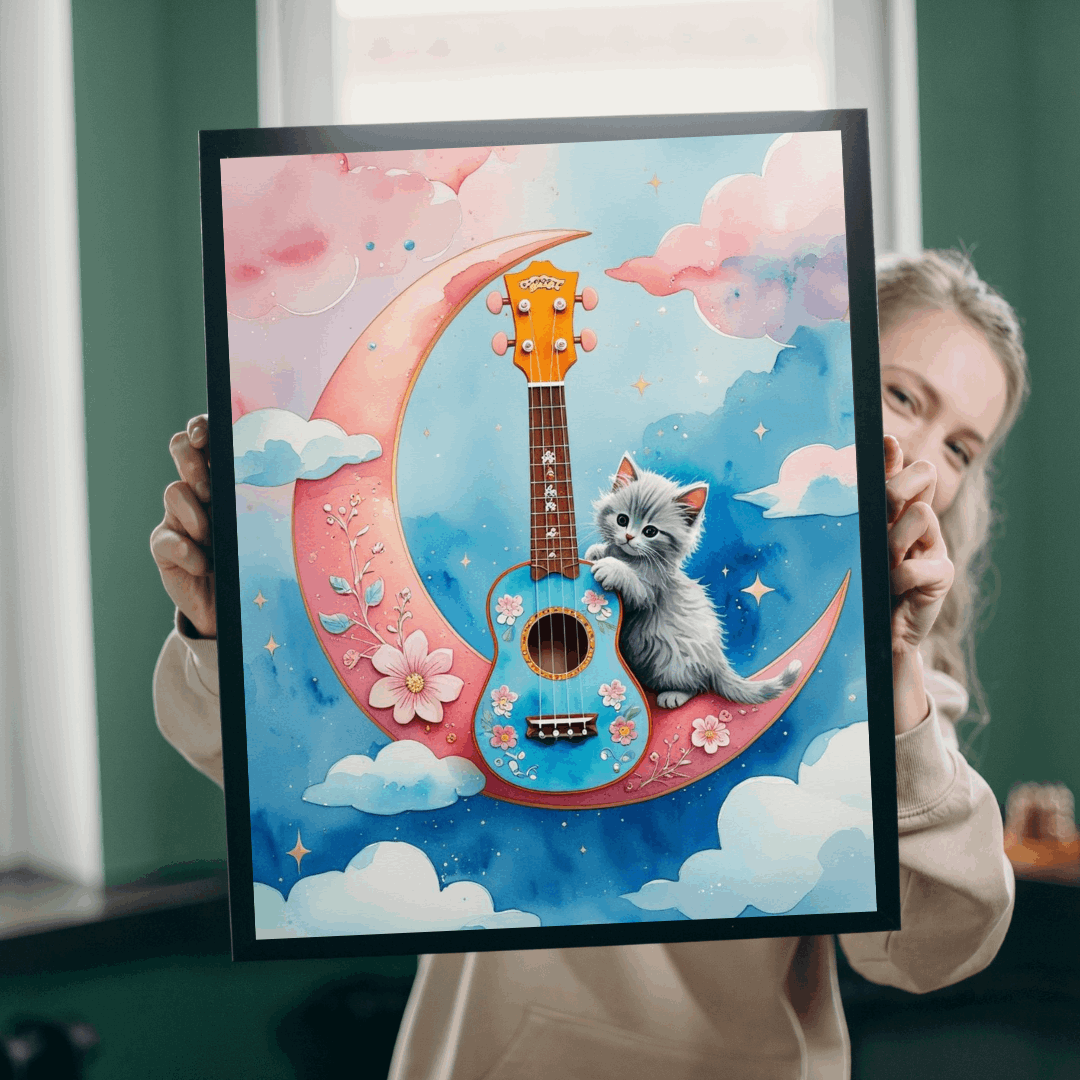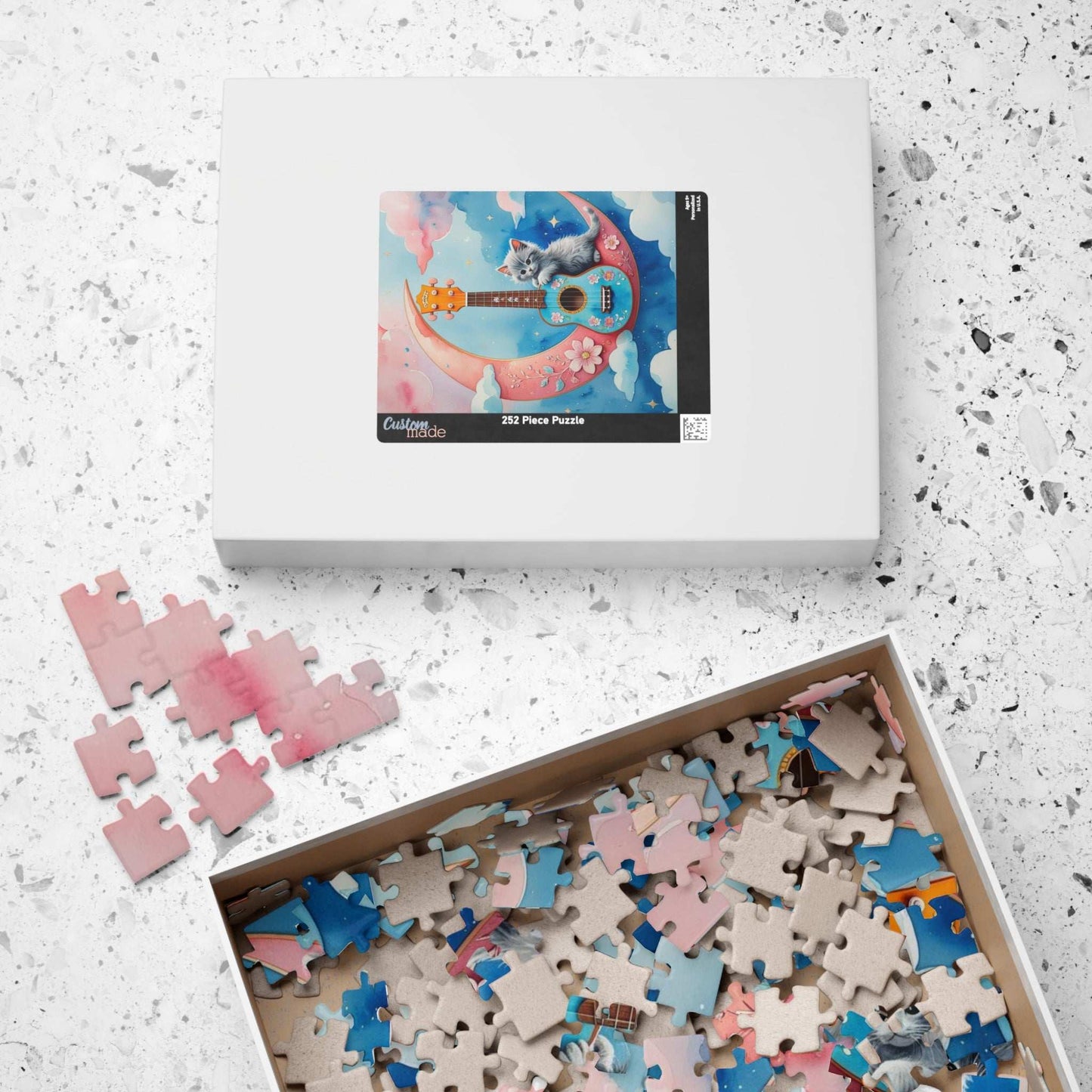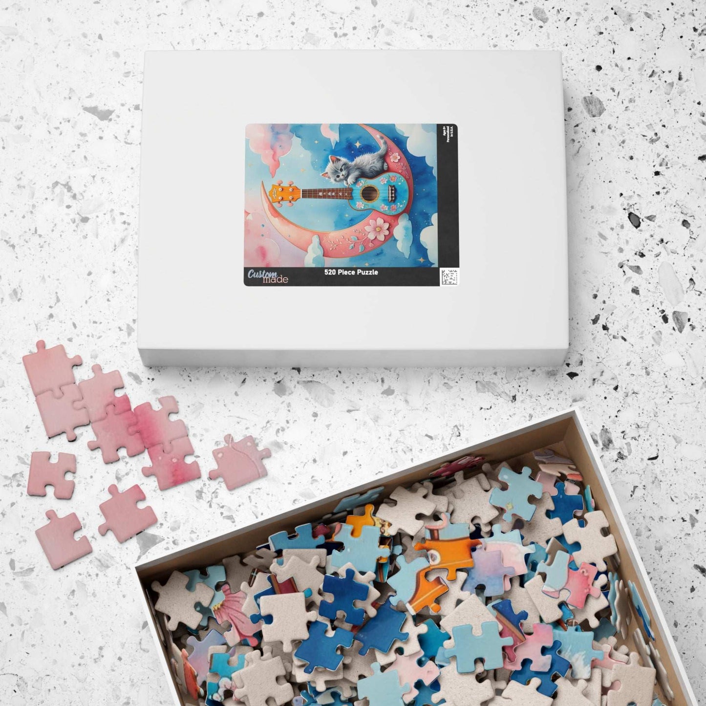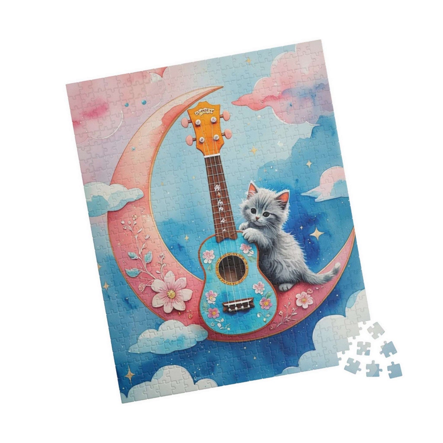 A whimsical puzzle featuring a ukulele with pastel clouds and a tiny cat playing on a crescent moon. Perfect for those who enjoy a dreamy and creative atmosphere, this puzzle can be a relaxing activity for both adults and children. Ideal for gifting during birthdays, holidays, or as a thoughtful gesture for puzzle enthusiasts.