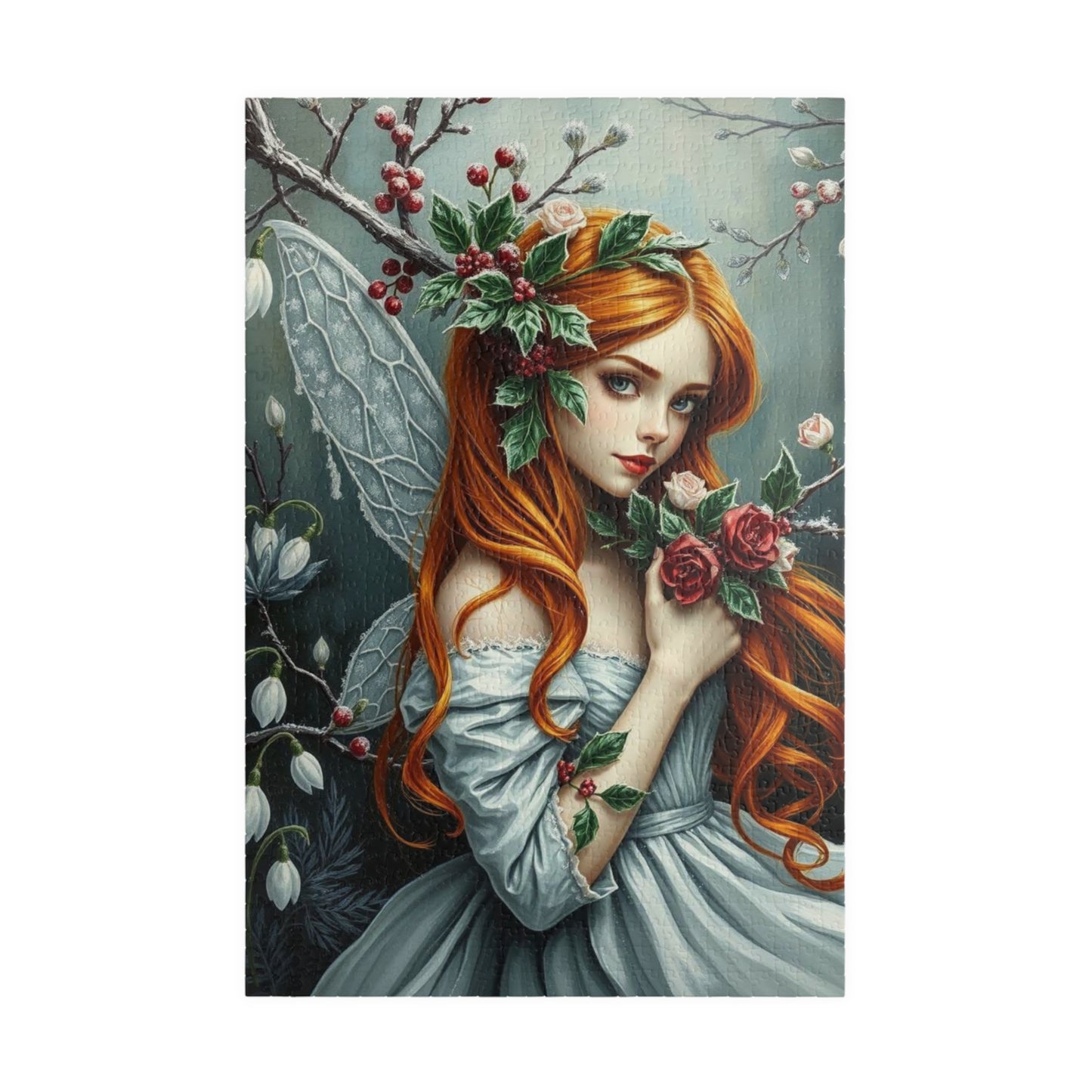 Unwind and unleash your creativity with this stunning puzzle featuring a graceful fairy with flowing copper hair and draped in a shimmering silvery gown. Surrounded by frosted berries and icy flora, this artwork blends fantasy and elegance in every piece.